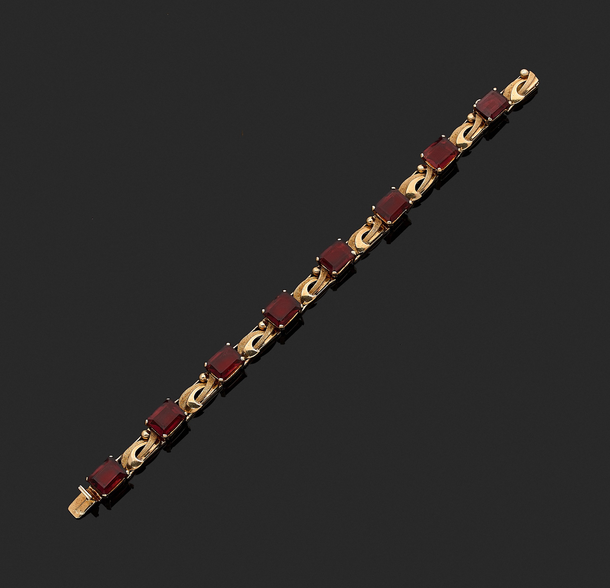 BRACELET en or jaune 750 millièmes à motif de rubans croisés en or mat et brillant, entrecoupés de sept grenats pesant au total 25 carats.
