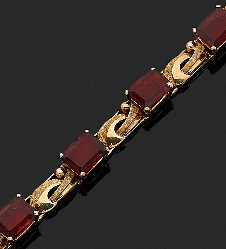 A gold bracelet with a pattern of crossed ribbons, matt and brilliant gold, interspersed with seven garnets weighing, for a total of 25 carats.