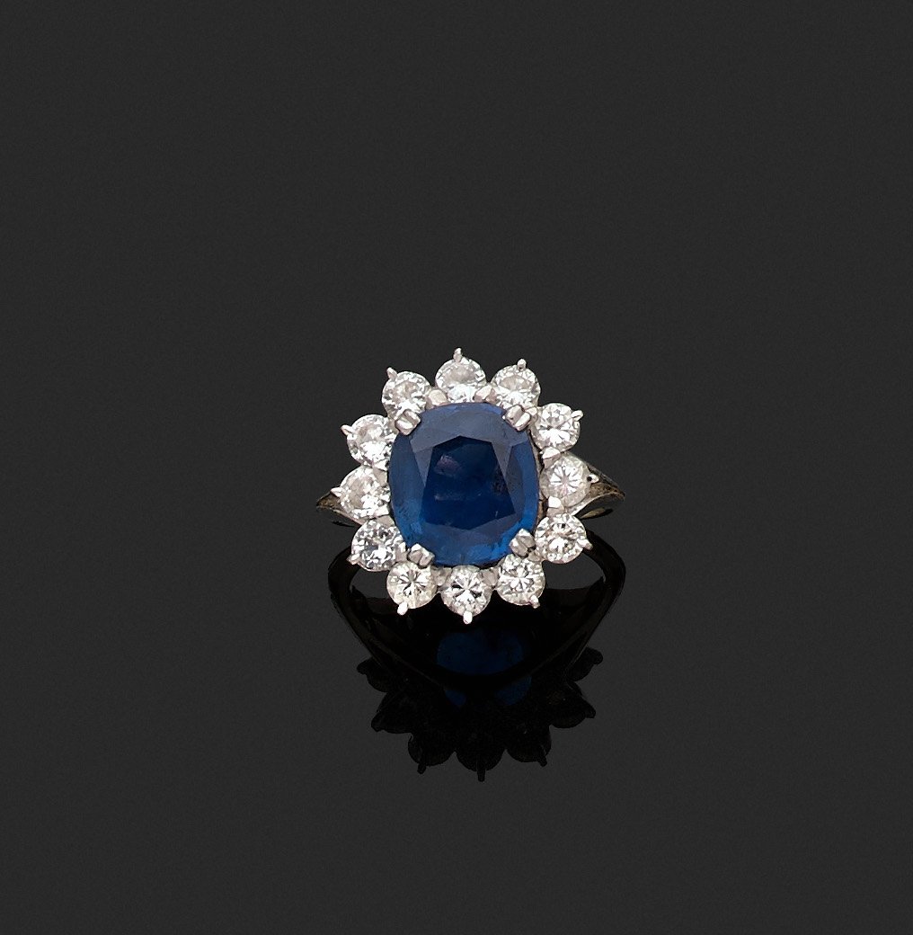 A white gold and platinum gold ring, adorned with a sapphire cushion-cut, with a setting of twelve round brilliant cut diamonds.