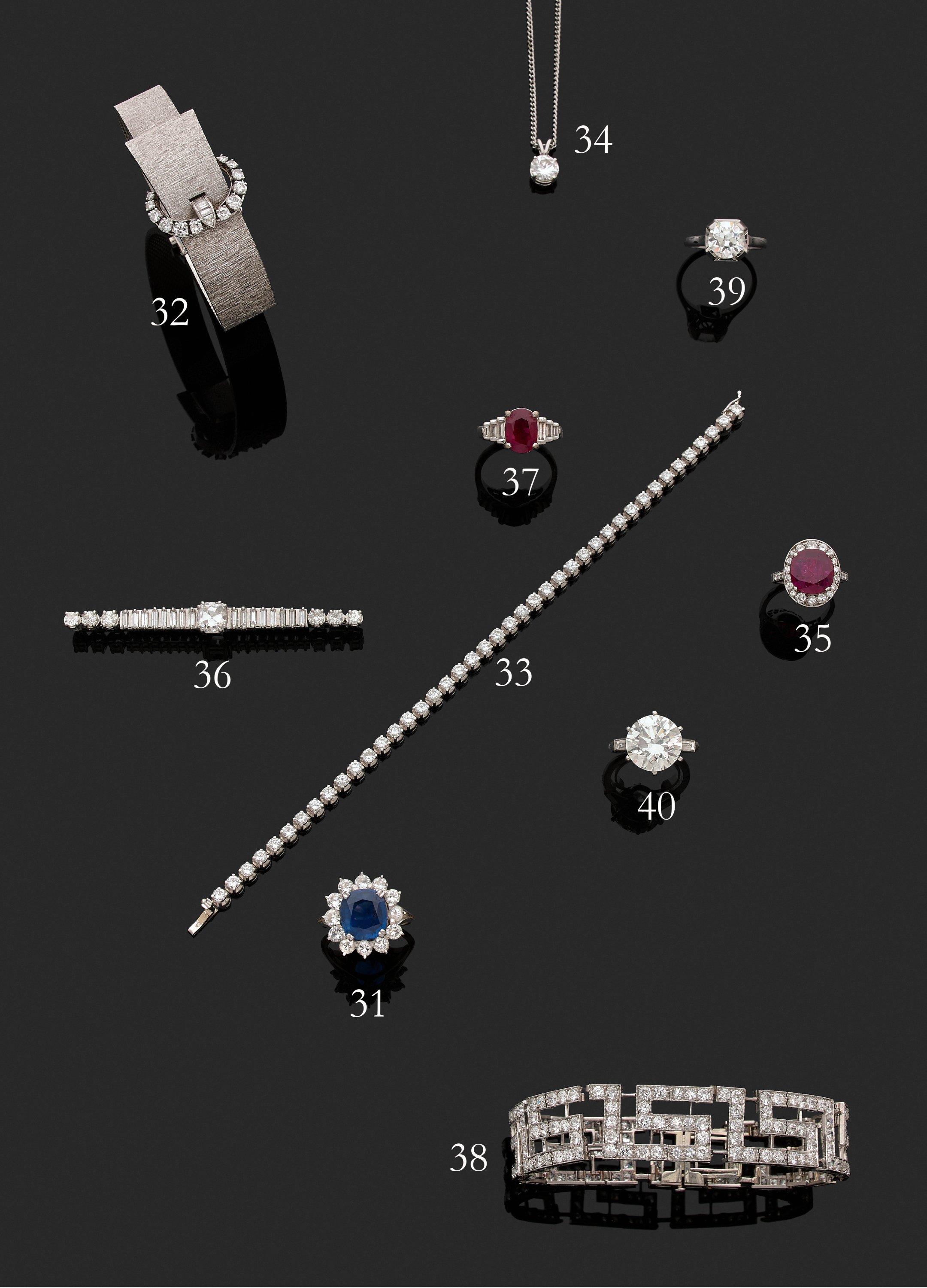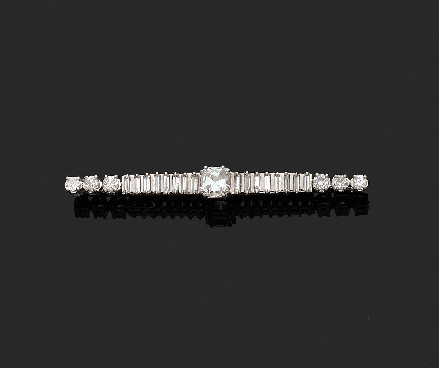 A platinium and white gold pin, adorned in the centre with an old-cut cushion-shaped diamond, between sixteen baguette diamonds and six brilliant-cut diamonds.