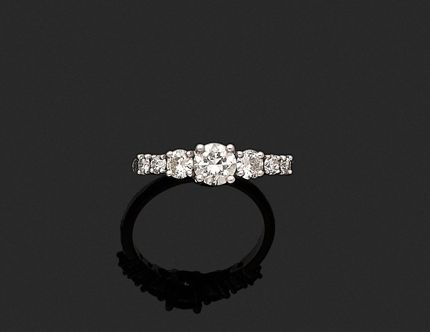 BAGUE en or gris 750 millièmes, ornée d'une ligne de sept diamants ronds de taille brillant légèrement en chute.