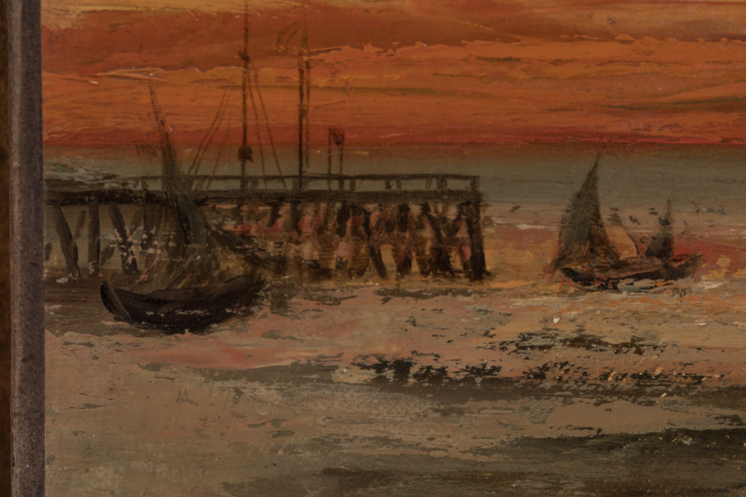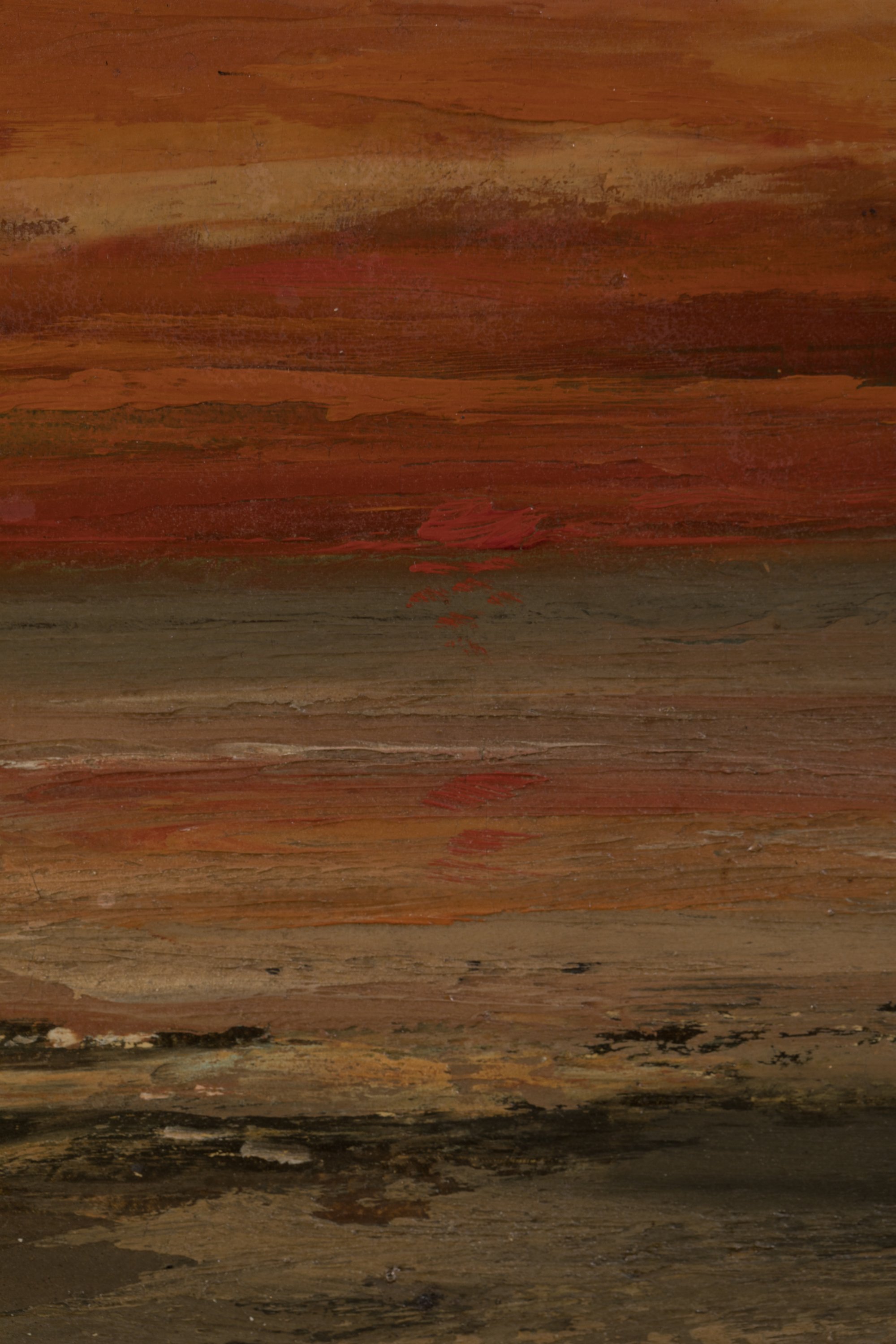 Une grève immense et nue, dont le sable reflète la couleur empourprée du ciel.