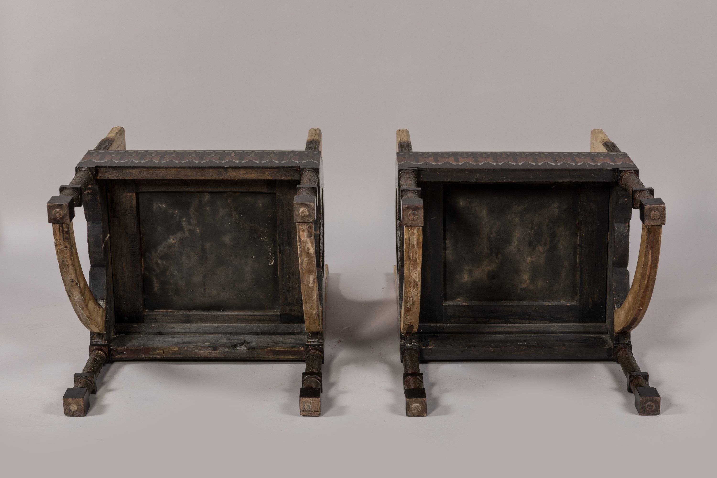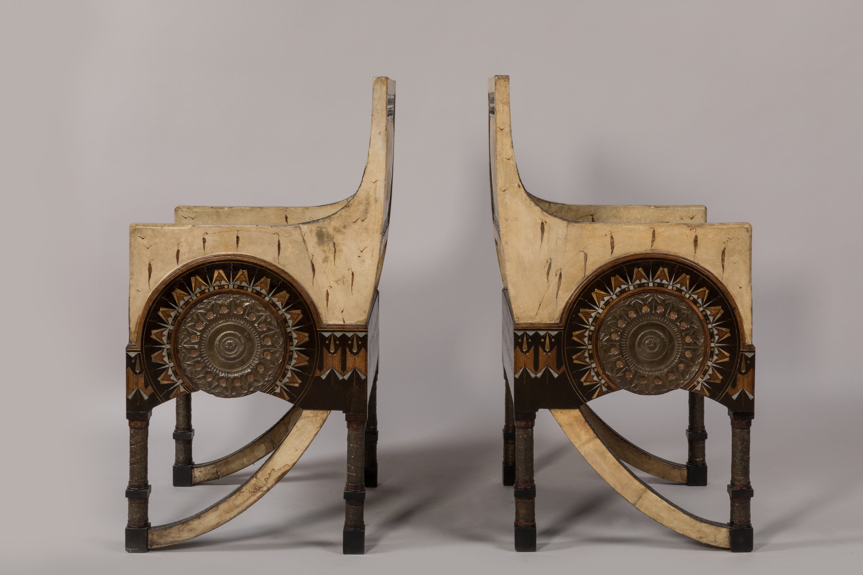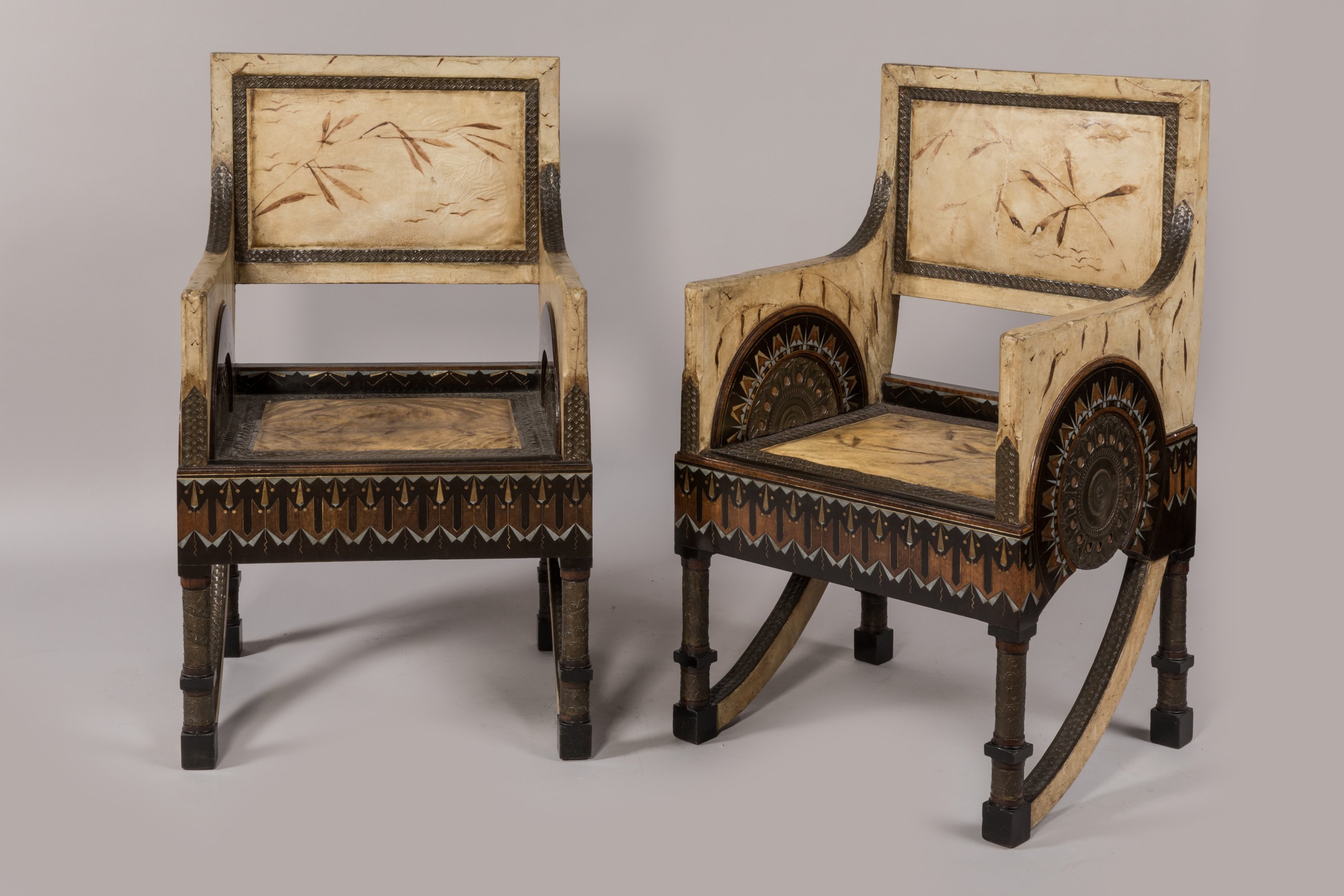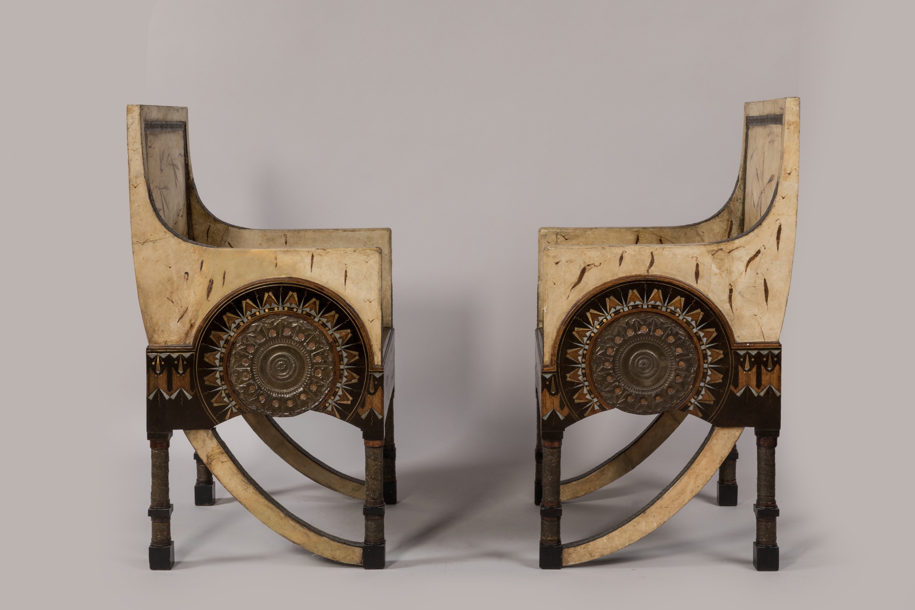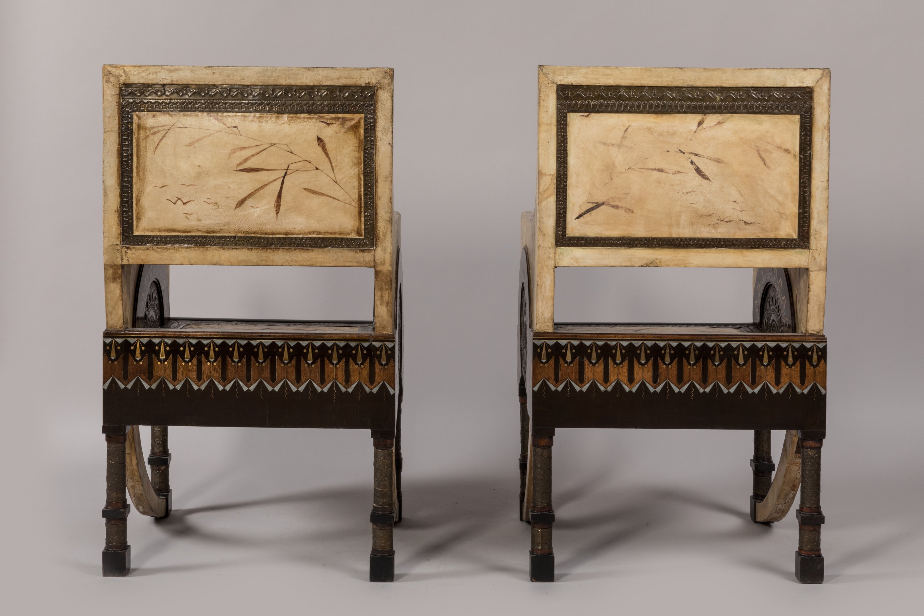 Two armchairs covered with parchment by Bugatti around 1902.