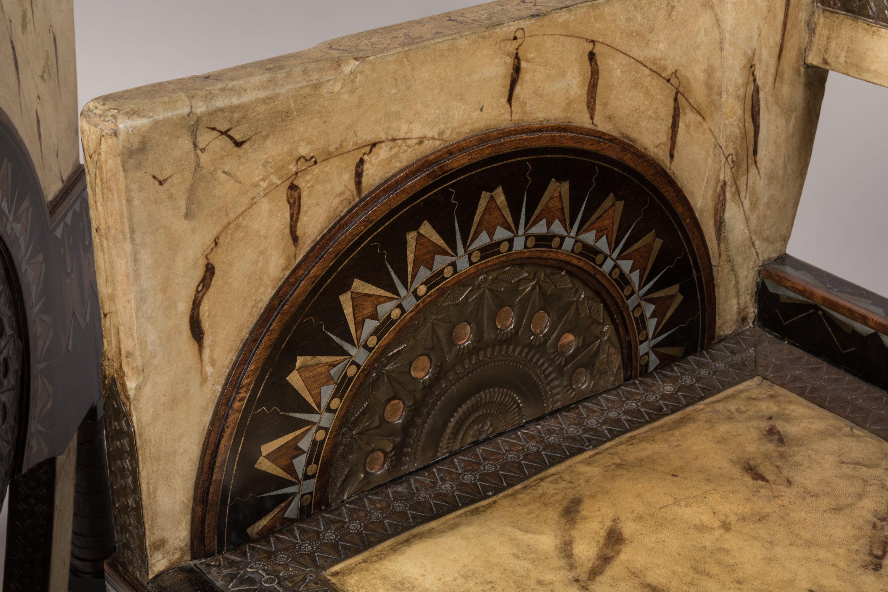garnis de parchemin sur le dossier et l'assise, à décor de feuilles et d'oiseaux stylisés. Le dossier droit est évidé en partie basse et les accotoirs sont pleins, à la façon d'une bergère. Les joues reçoivent un disque en laiton repoussé et ajouré, ceint d'un décor discoïdal géométrique marqueté de laiton, étain, bois clair et bois sombre qui se poursuit sur la ceinture. Le piètement tubulaire est orné d'un ruban de laiton estampé ; les pieds sont cubiques. L'entretoise latérale galbée est recouverte de parchemin ; sur sa face supérieure, une feuille de laiton estampée de dents de loup rappelle le décor de la partie supérieure des accotoirs.