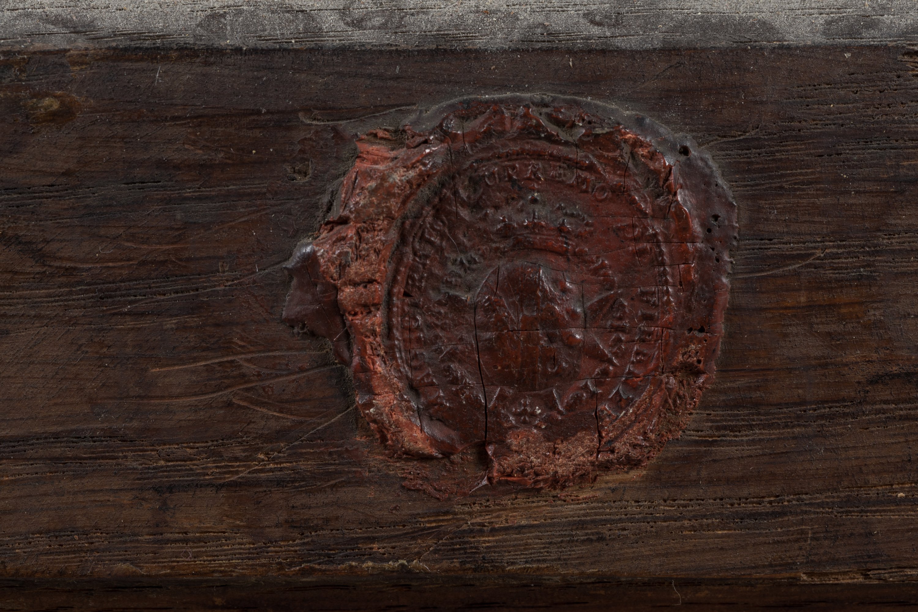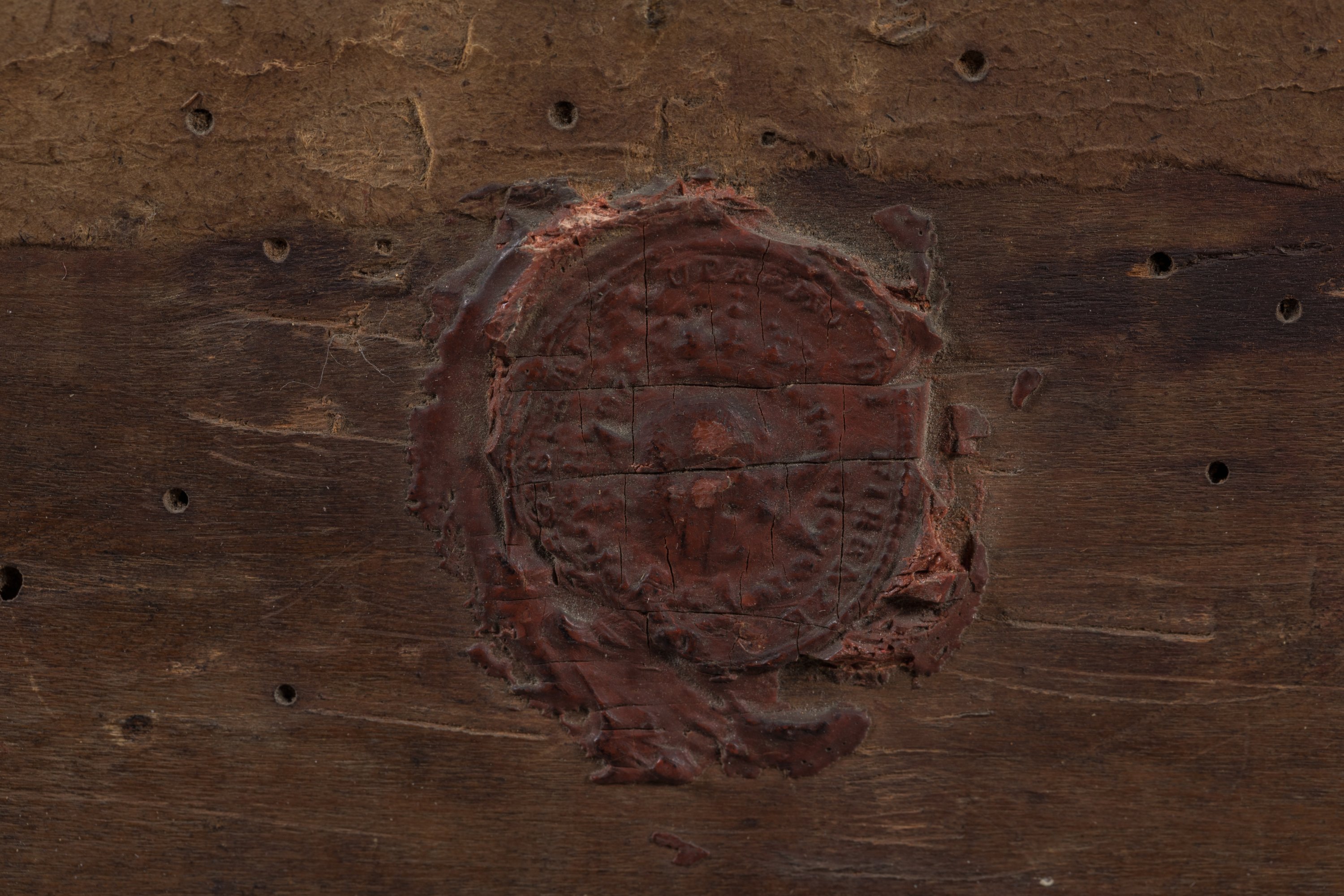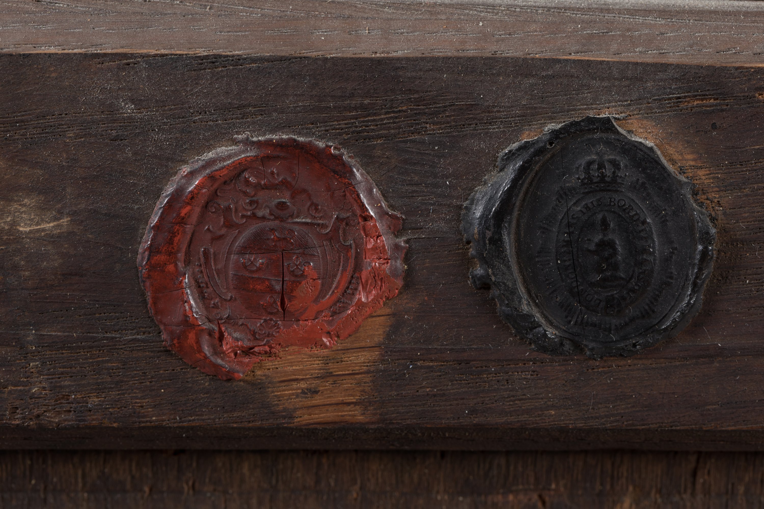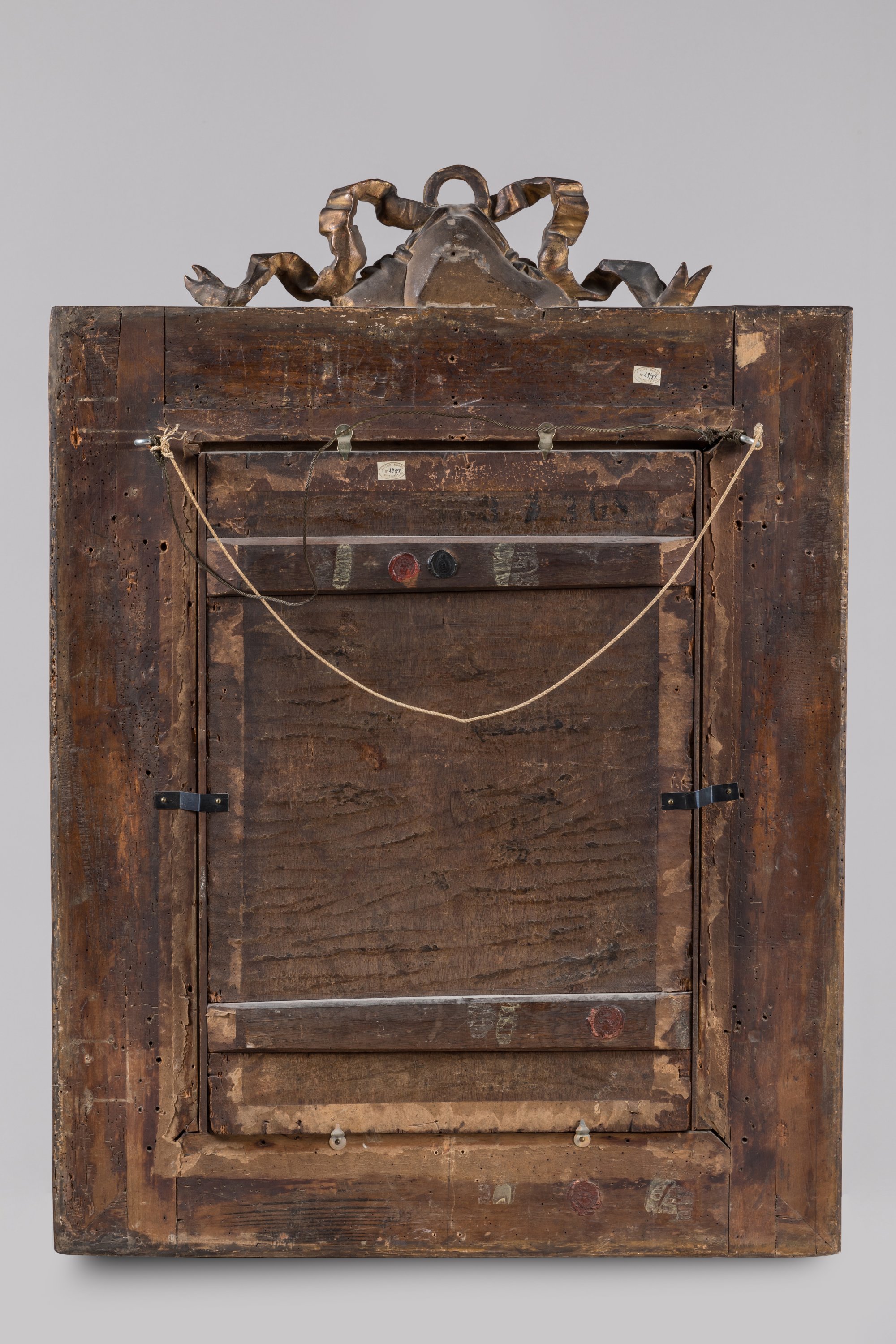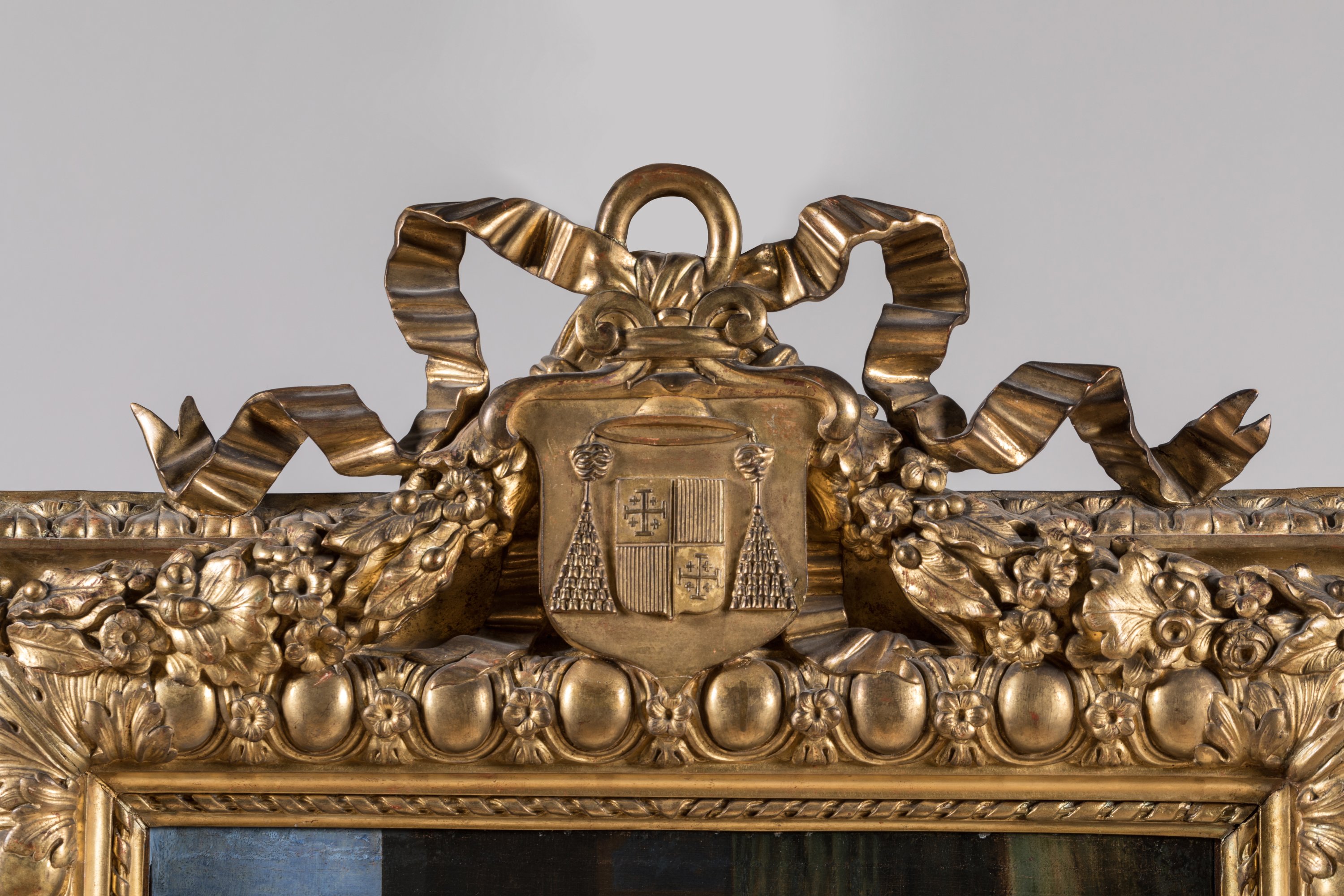 Riche cadre en bois doré et sculpté de la fin du XVIIe, portant des armoiries avec un chapeau cardinalice, non identifiées.