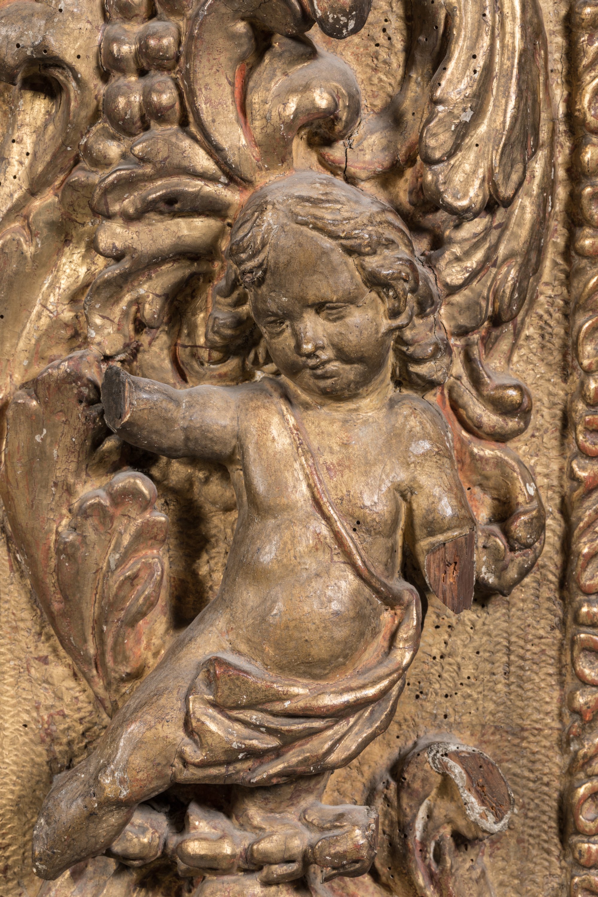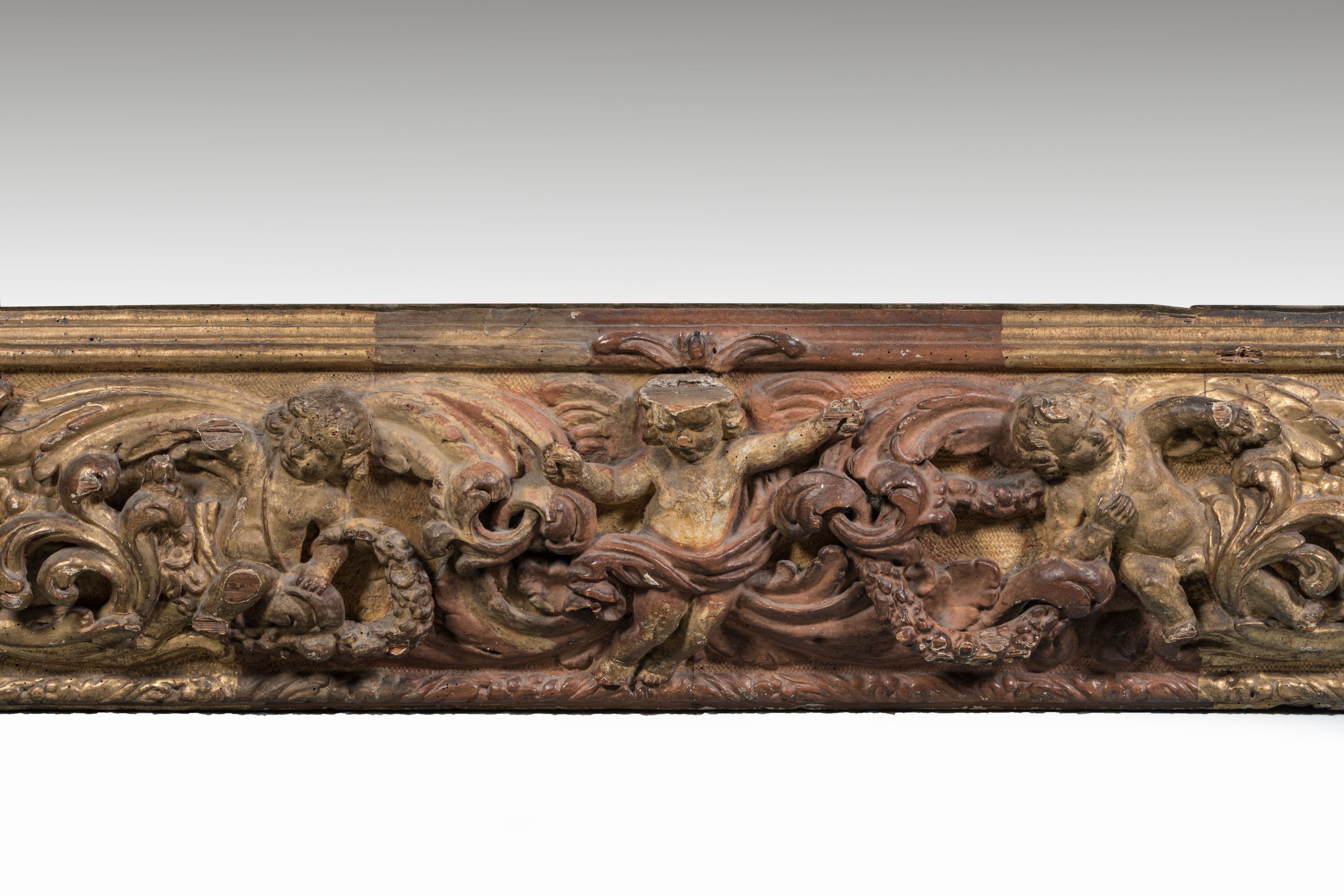 en bois de résineux sculpté et doré, de forme rectangulaire. Décor en hautrelief d'amours et putti évoluant dans des entrelacs d'acanthes. Un bouquet de fruits agrémenté de guirlandes de fleurs et enroulements feuillagés à chaque coin.
