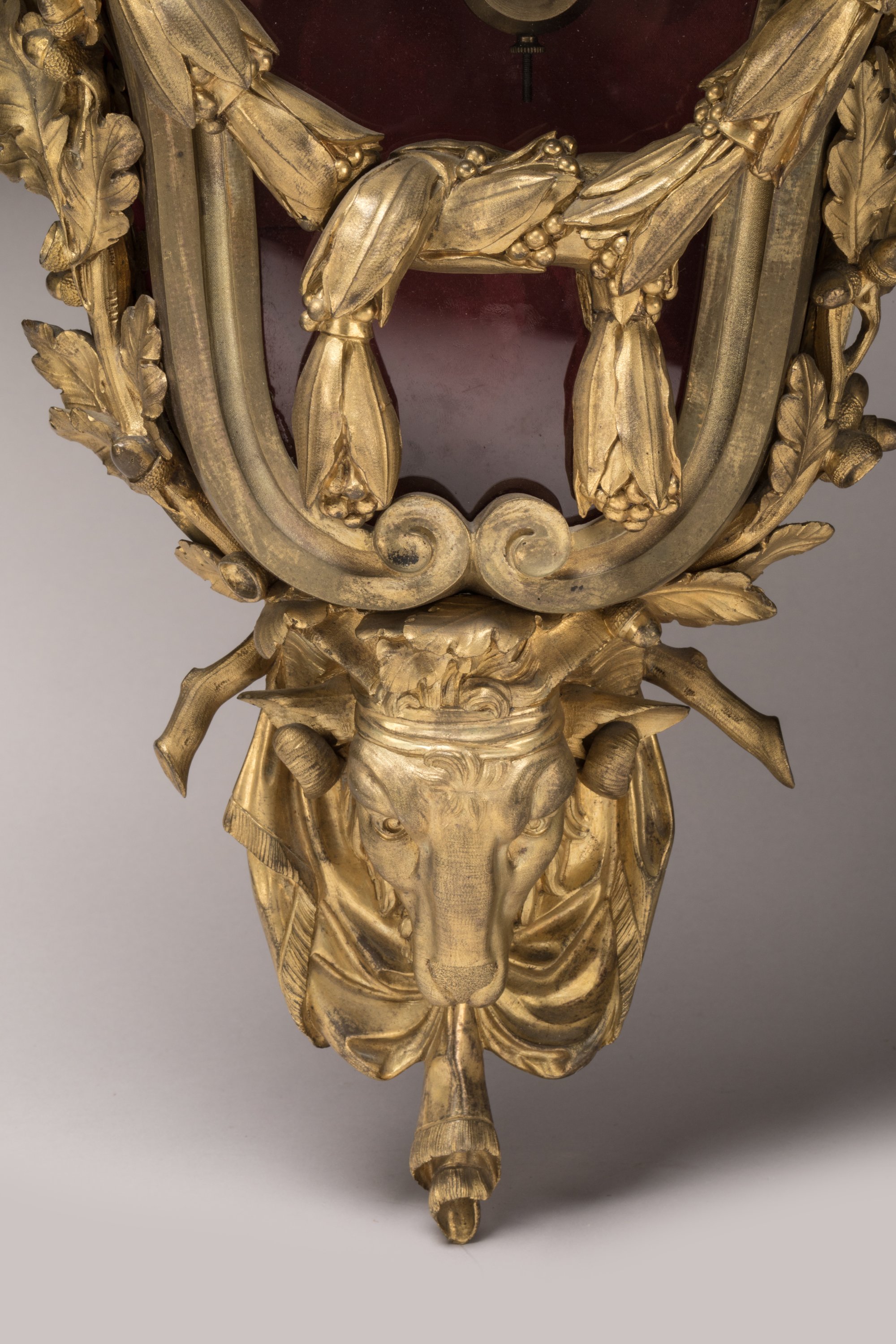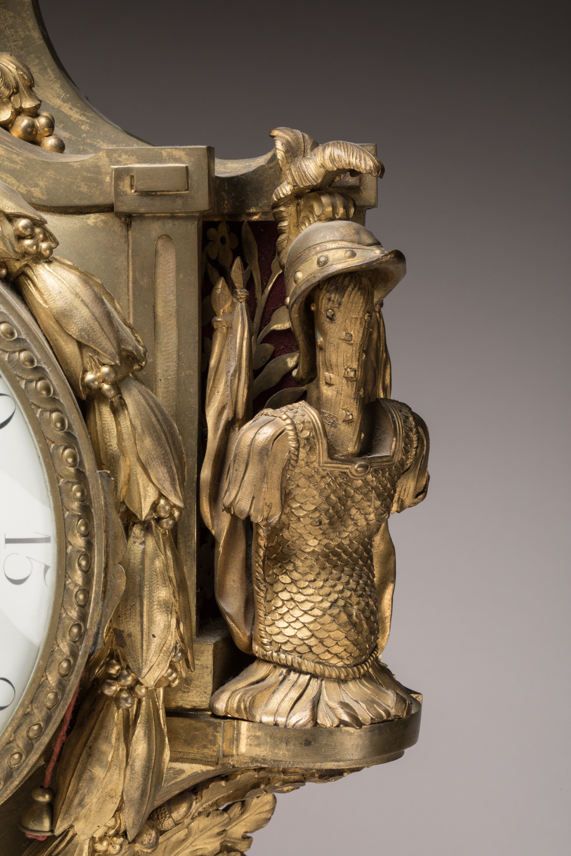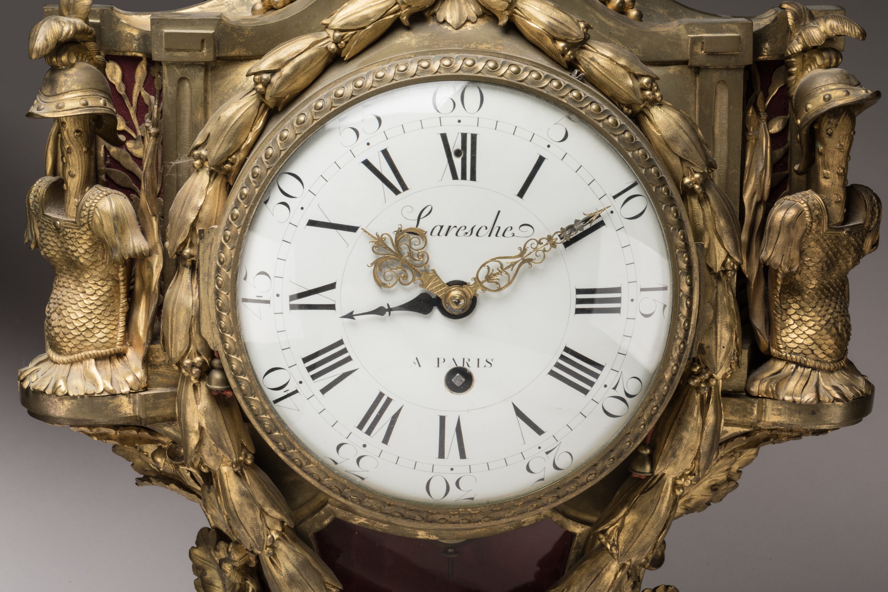 en bronze ciselé et doré. L'amortissement est orné d'un buste de l'empereur Caracalla. De part et d'autre du cadran sont placés des trophées d'armes constitués d'une armure, d'une masse et d'un casque empanaché sur fond de drapeaux. Une importante guirlande de laurier conduit au cul-de-lampe, qui présente une tête de bélier se détachant d'un drapé. Audessus d'elle naissent deux branches de chêne. Le cadran de forme ronde, émaillé en blanc, indique autour d'un chemin de fer les heures en chiffres romains et les minutes en chiffres arabes signé " Laresche / A Paris ".