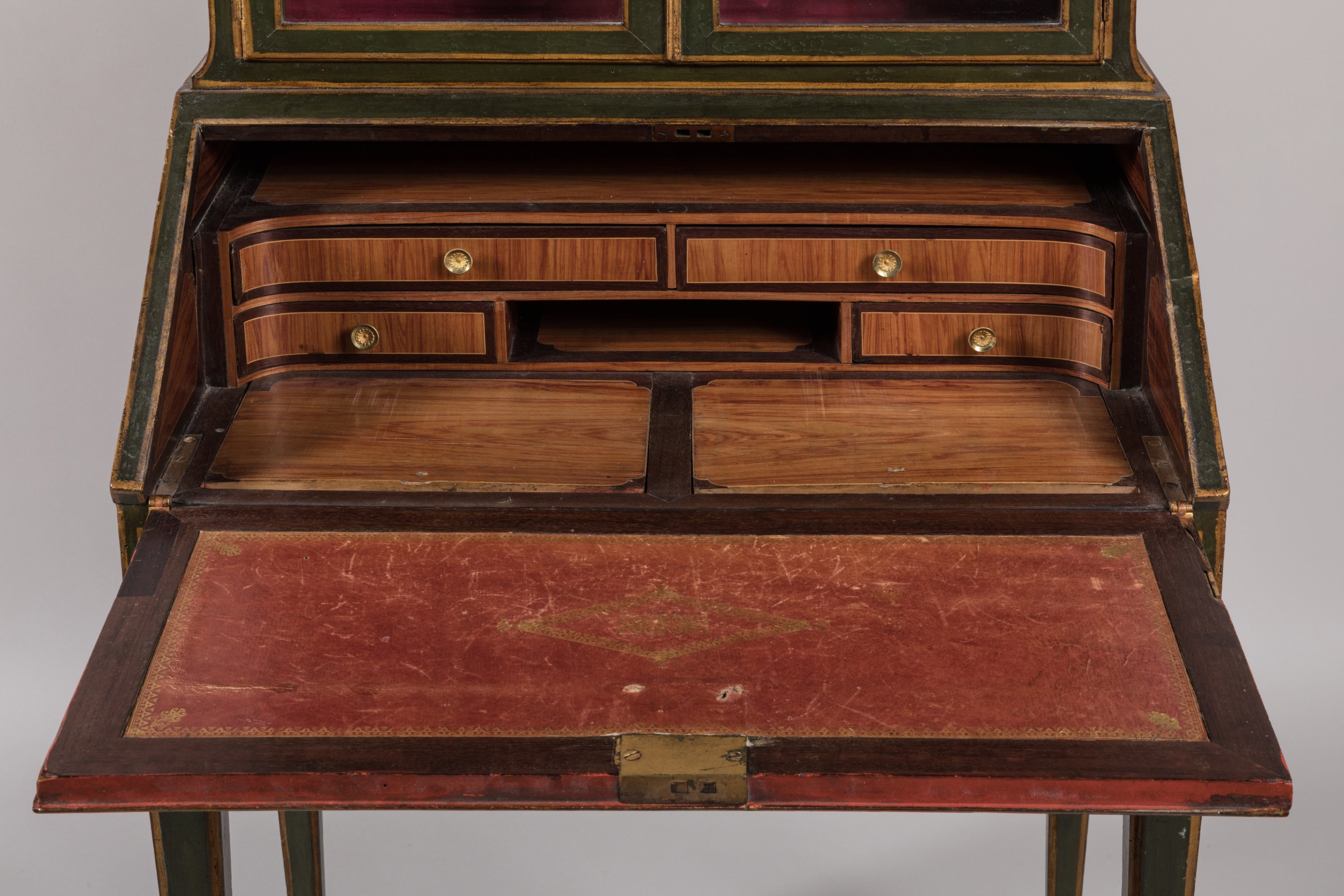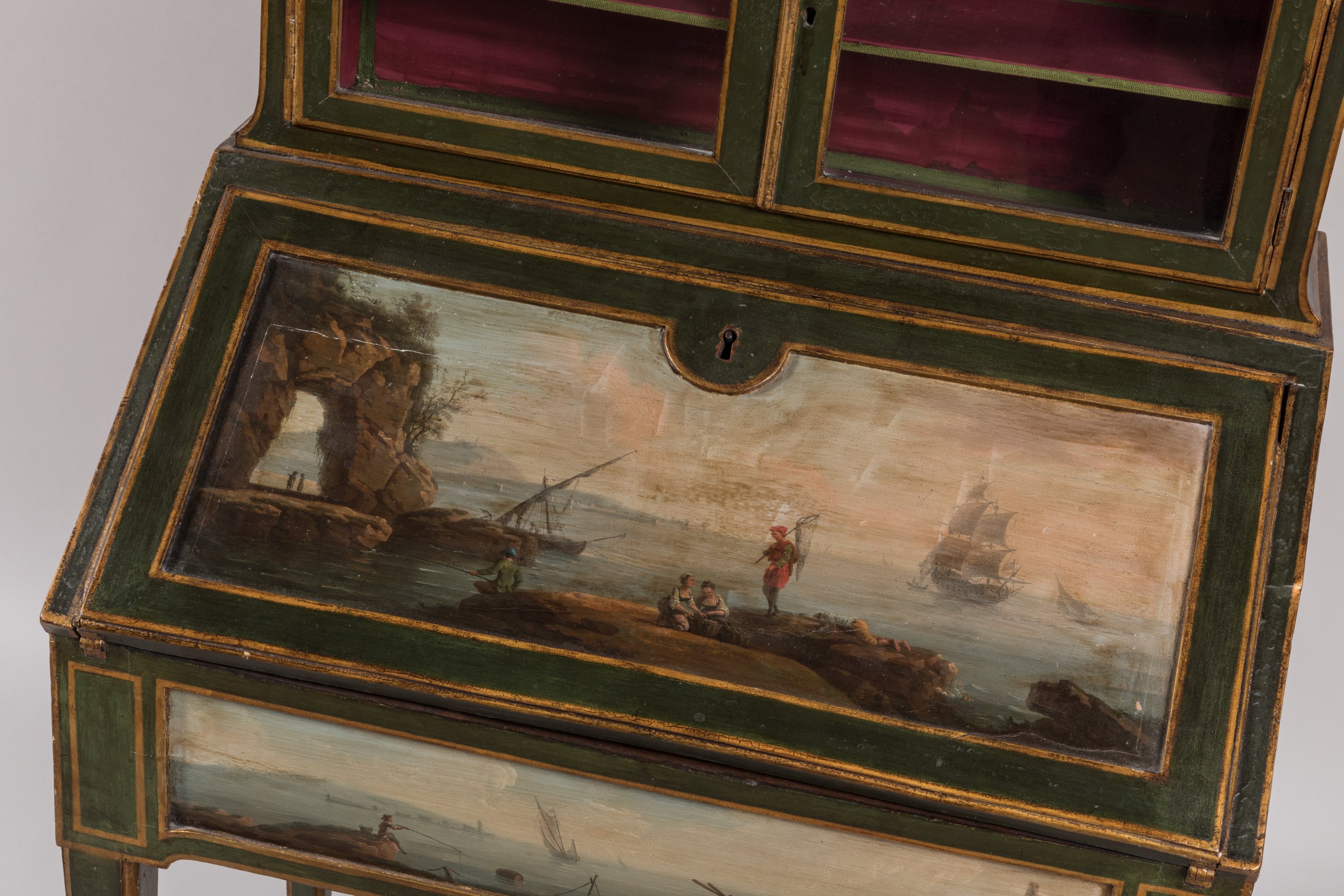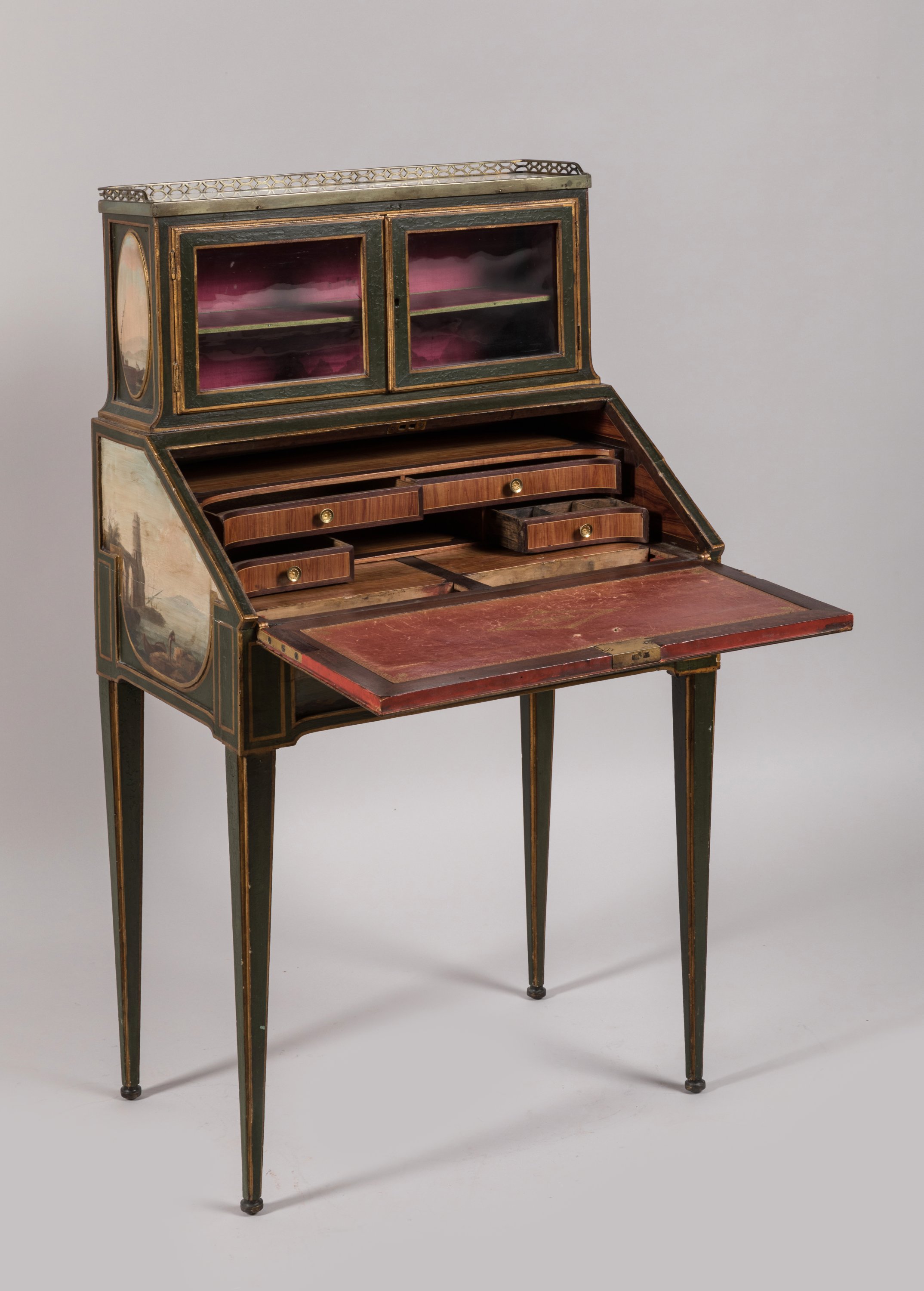rehaussé de filets or. Il ouvre, en partie supérieure, par deux portes vitrées en gradin et par un abattant découvrant quatre tiroirs et deux secrets en placage de bois de rose dans des encadrements d'amarante. Un tiroir ouvre en ceinture. Il repose sur quatre pieds en gaine. Le gradin est garni d'un marbre blanc, ceint d'une galerie en laiton ajouré. L'abattant, le tiroir et les côtés en deux réserves sont à décor polychrome de six paysages marins dans le goût de Joseph Vernet.