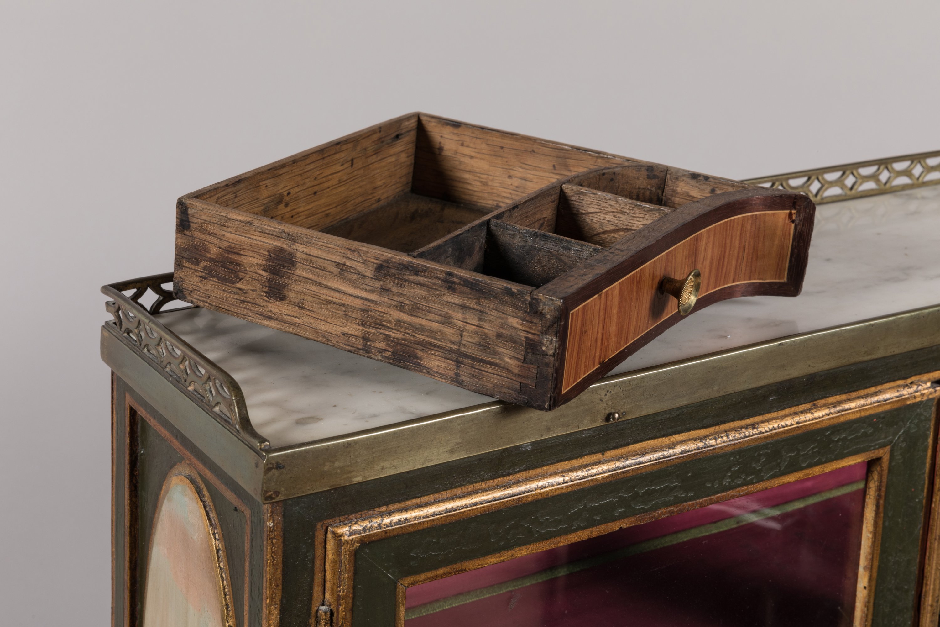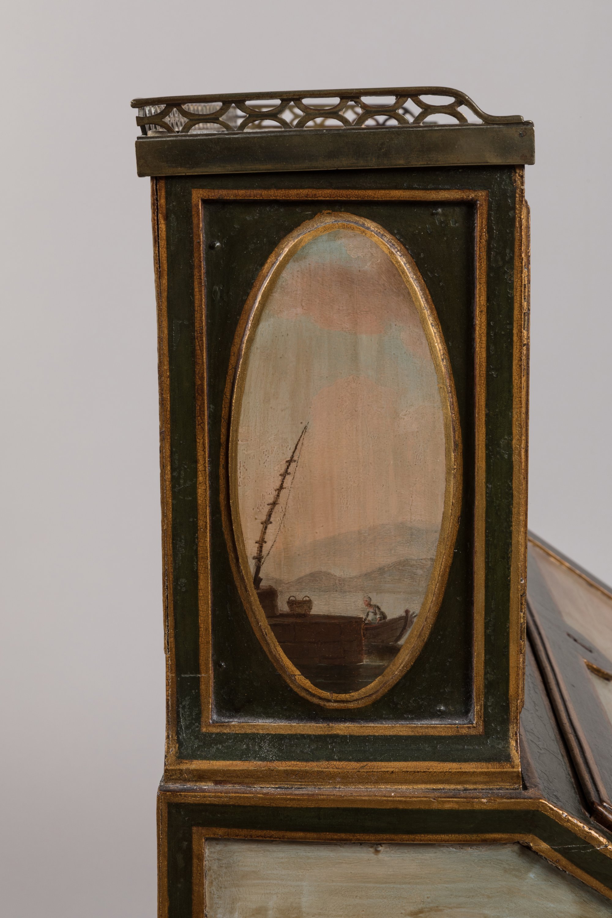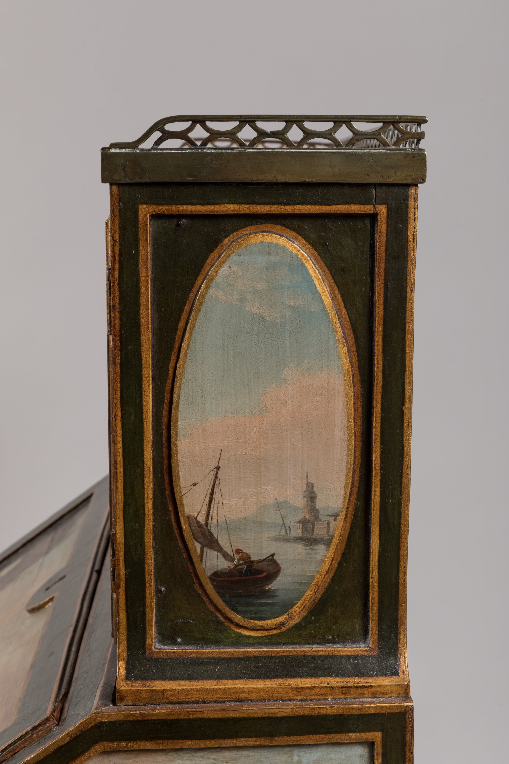 rehaussé de filets or. Il ouvre, en partie supérieure, par deux portes vitrées en gradin et par un abattant découvrant quatre tiroirs et deux secrets en placage de bois de rose dans des encadrements d'amarante. Un tiroir ouvre en ceinture. Il repose sur quatre pieds en gaine. Le gradin est garni d'un marbre blanc, ceint d'une galerie en laiton ajouré. L'abattant, le tiroir et les côtés en deux réserves sont à décor polychrome de six paysages marins dans le goût de Joseph Vernet.