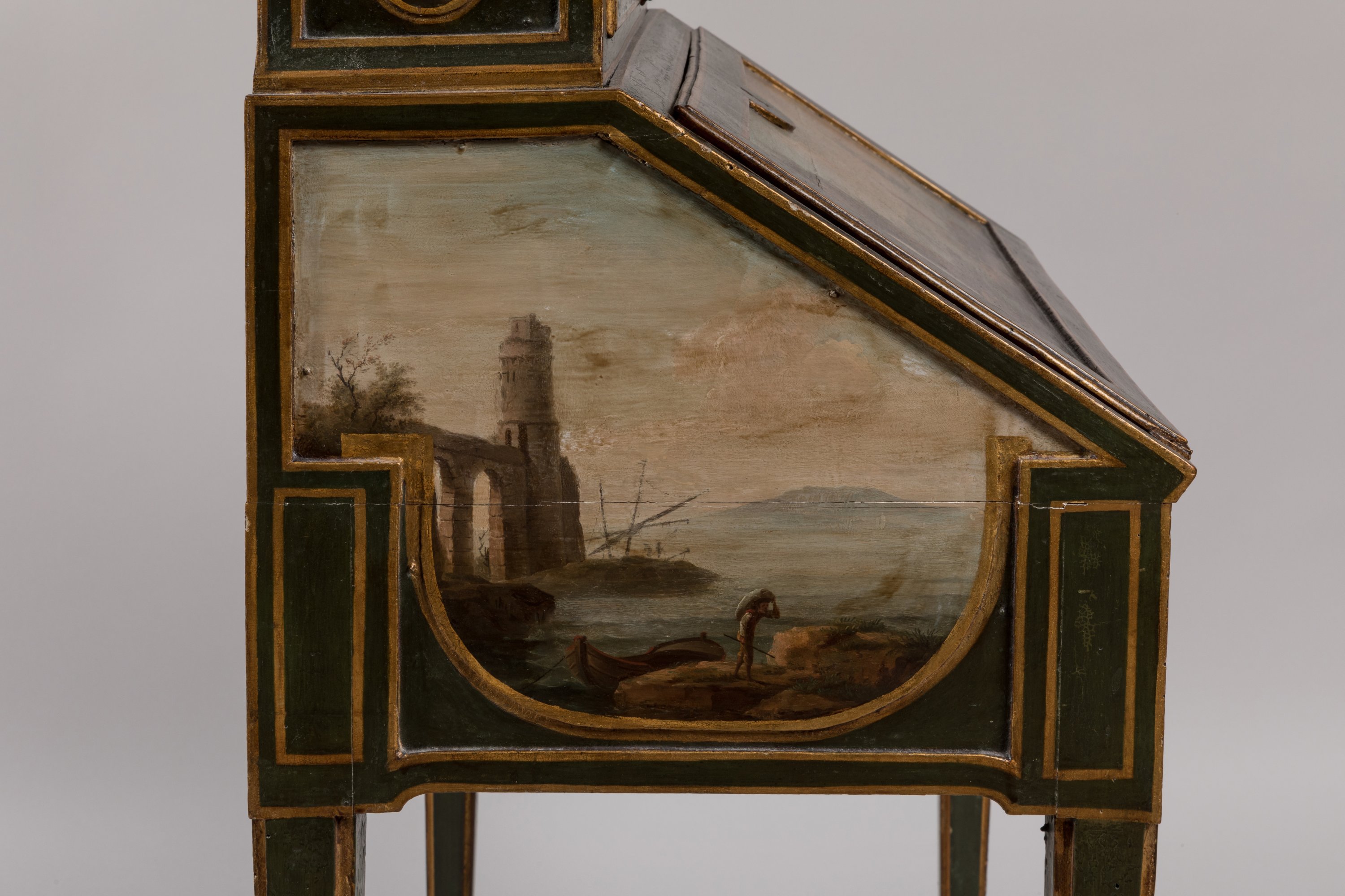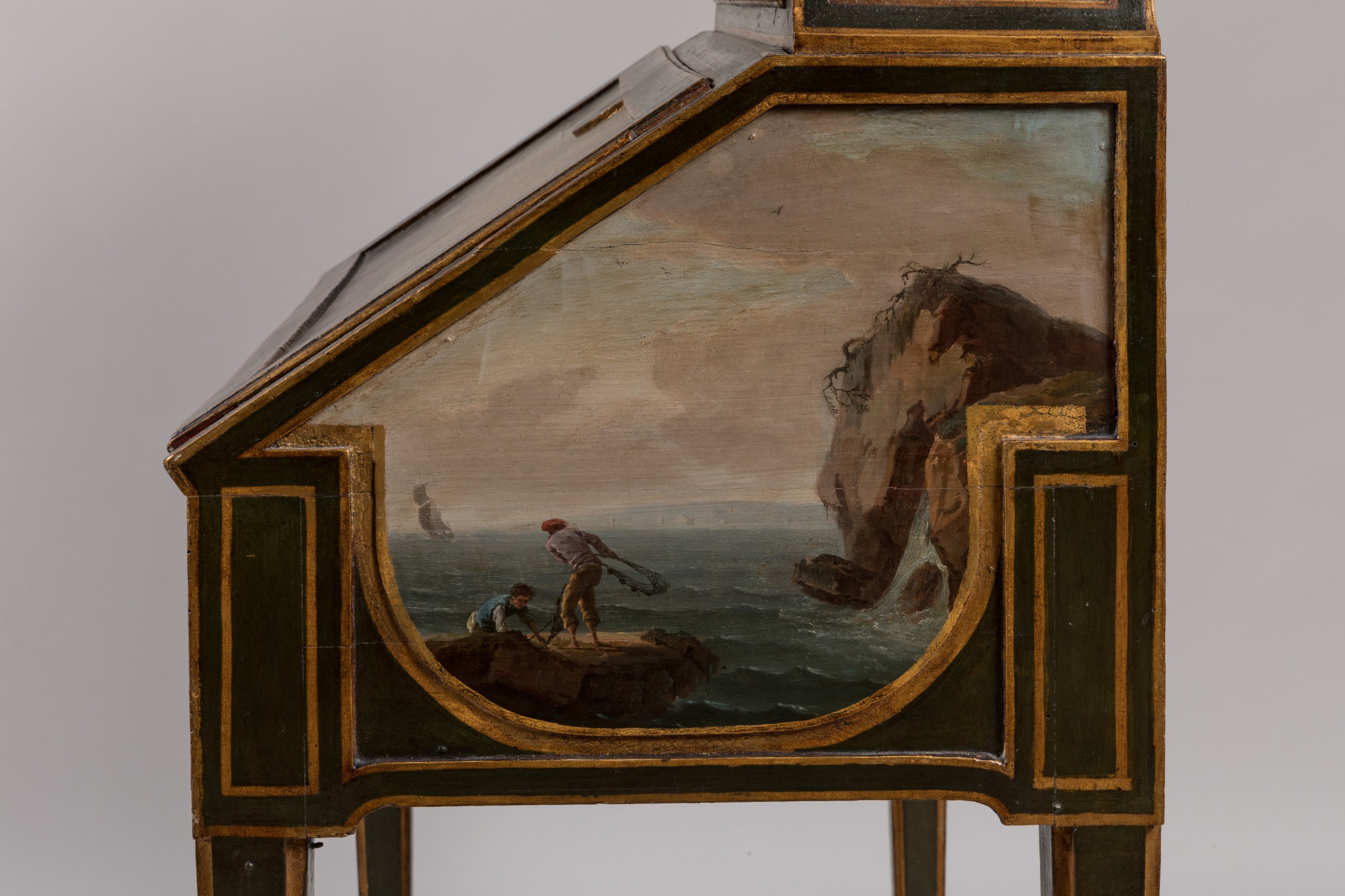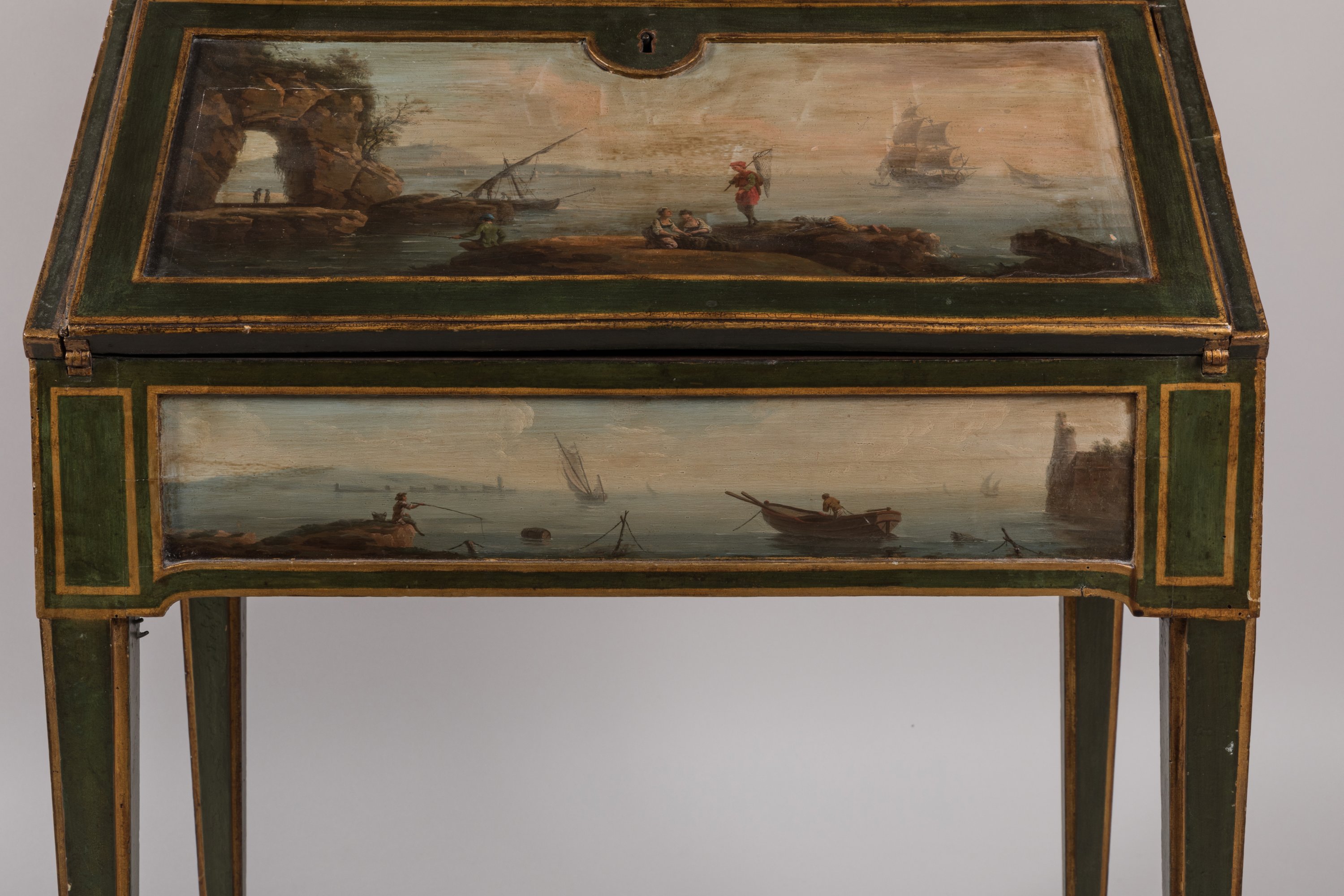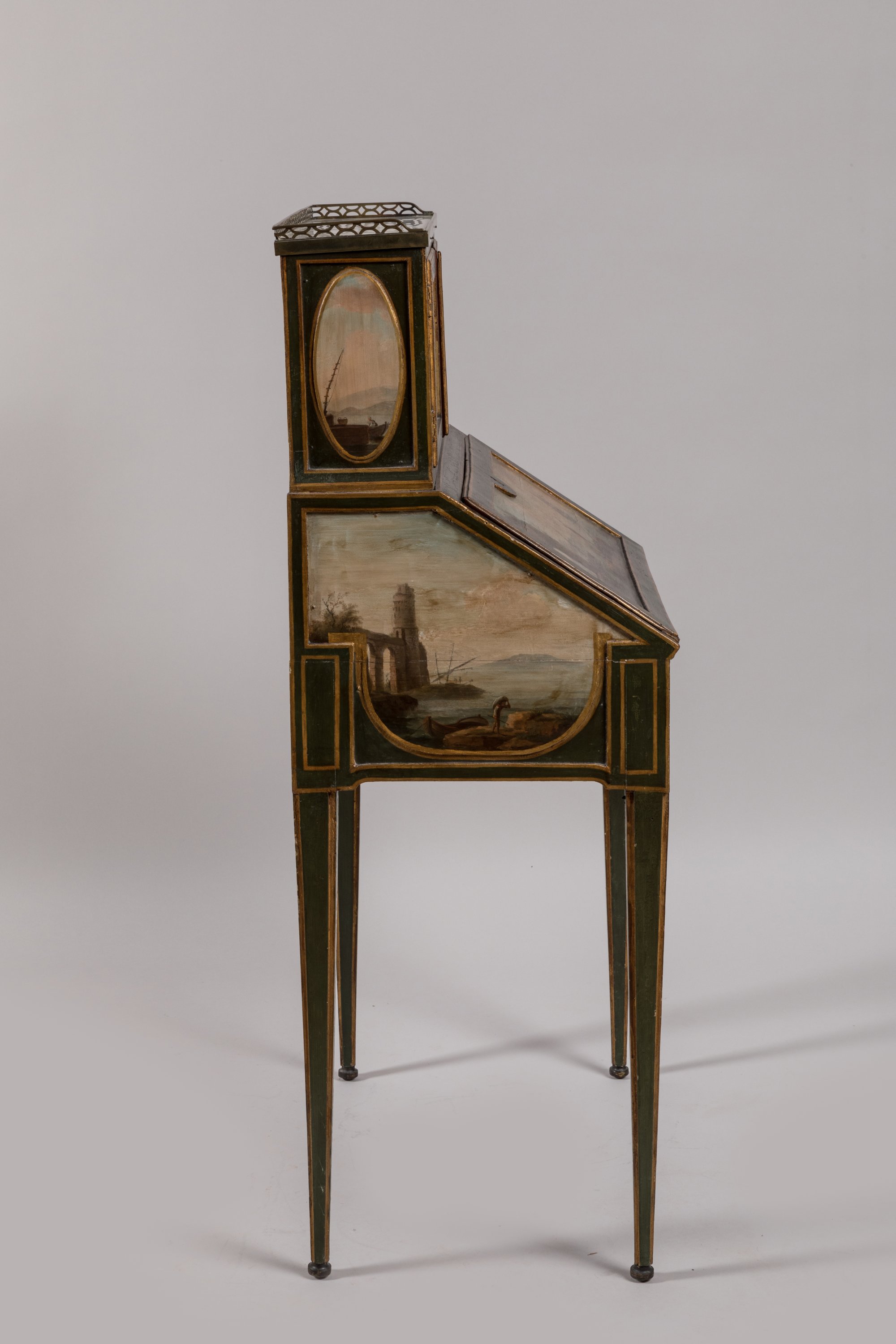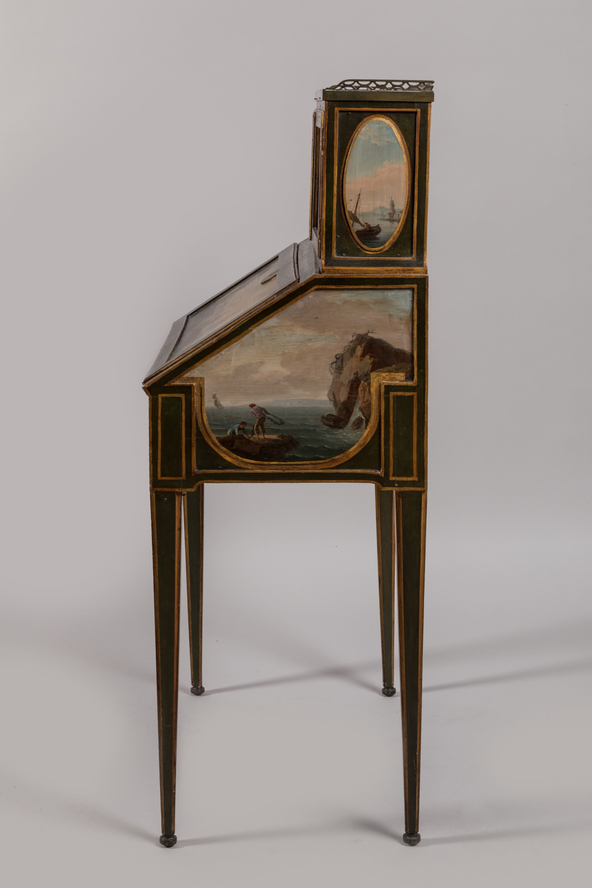 Rare bonheur du jour peint de scènes marines d'après Vernet, par René Dubois d'époque Louis XVI