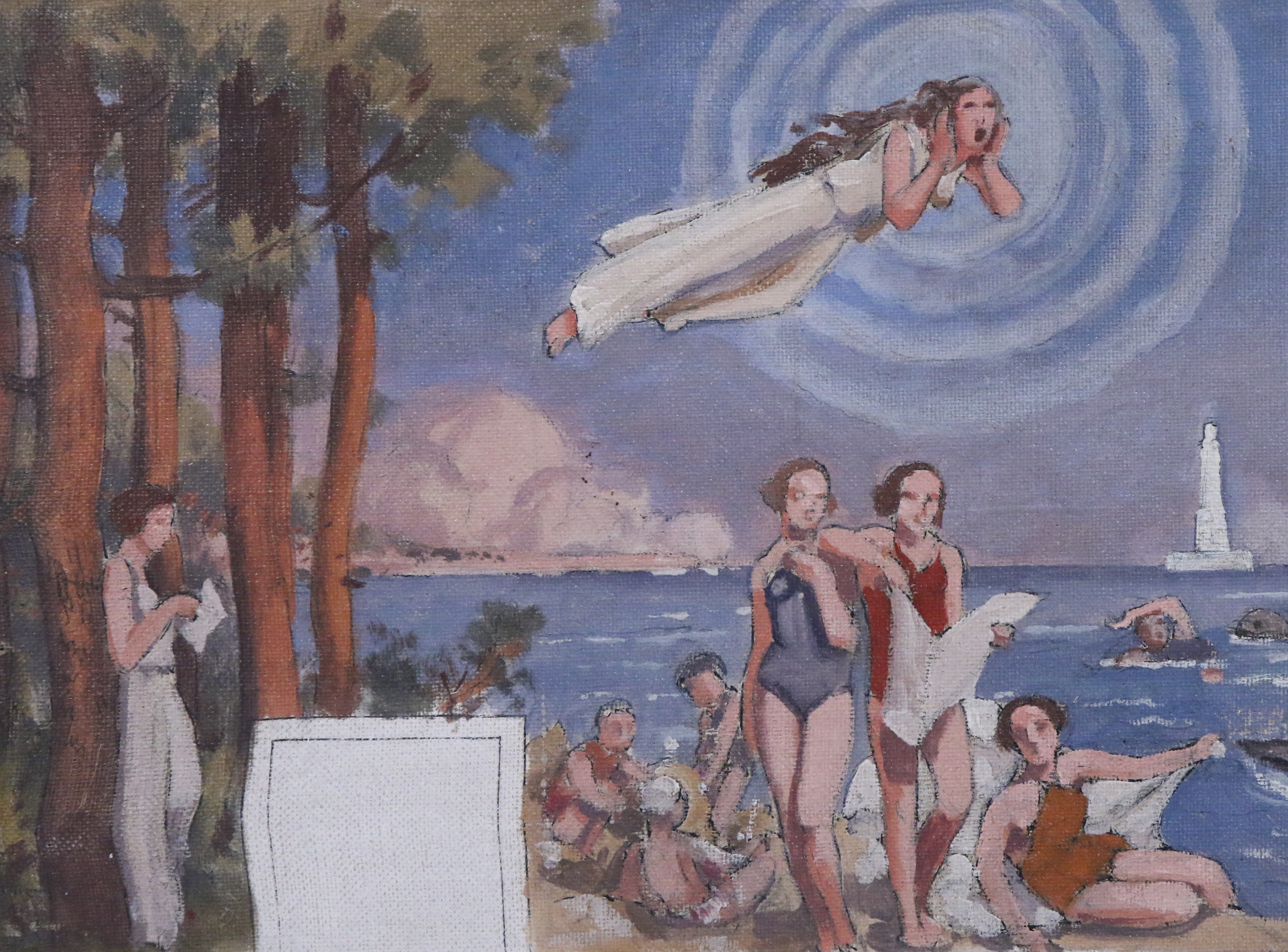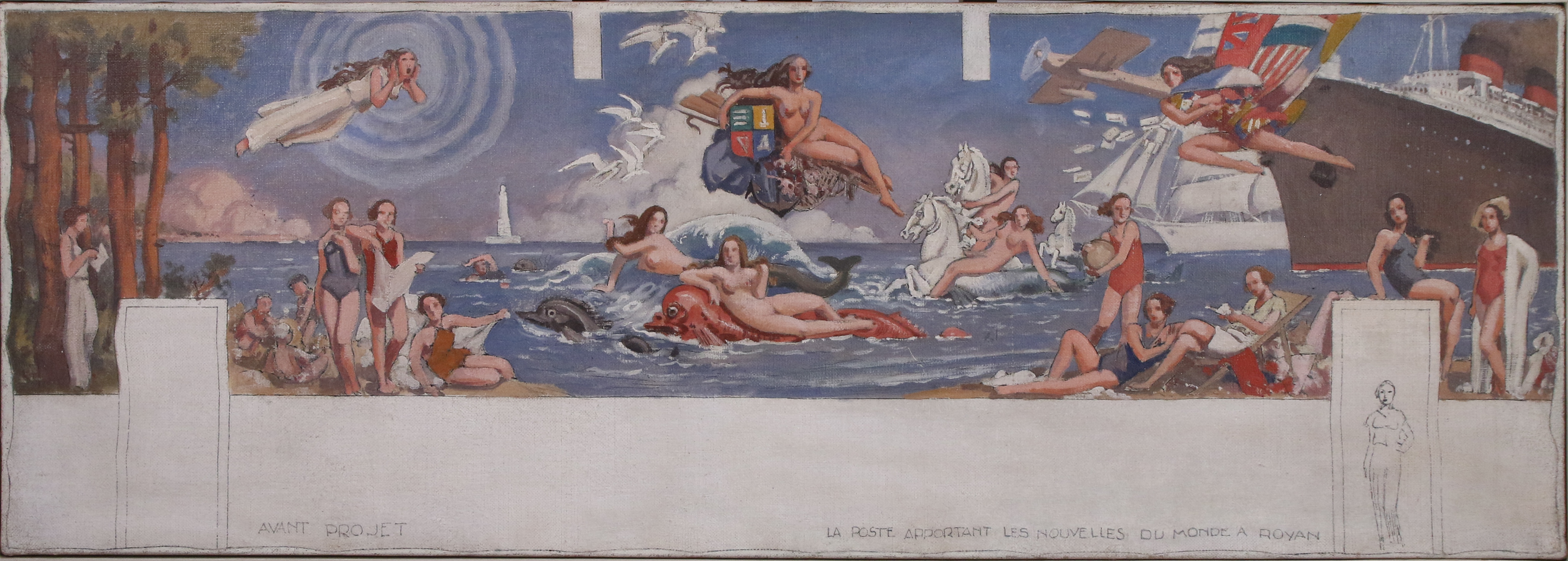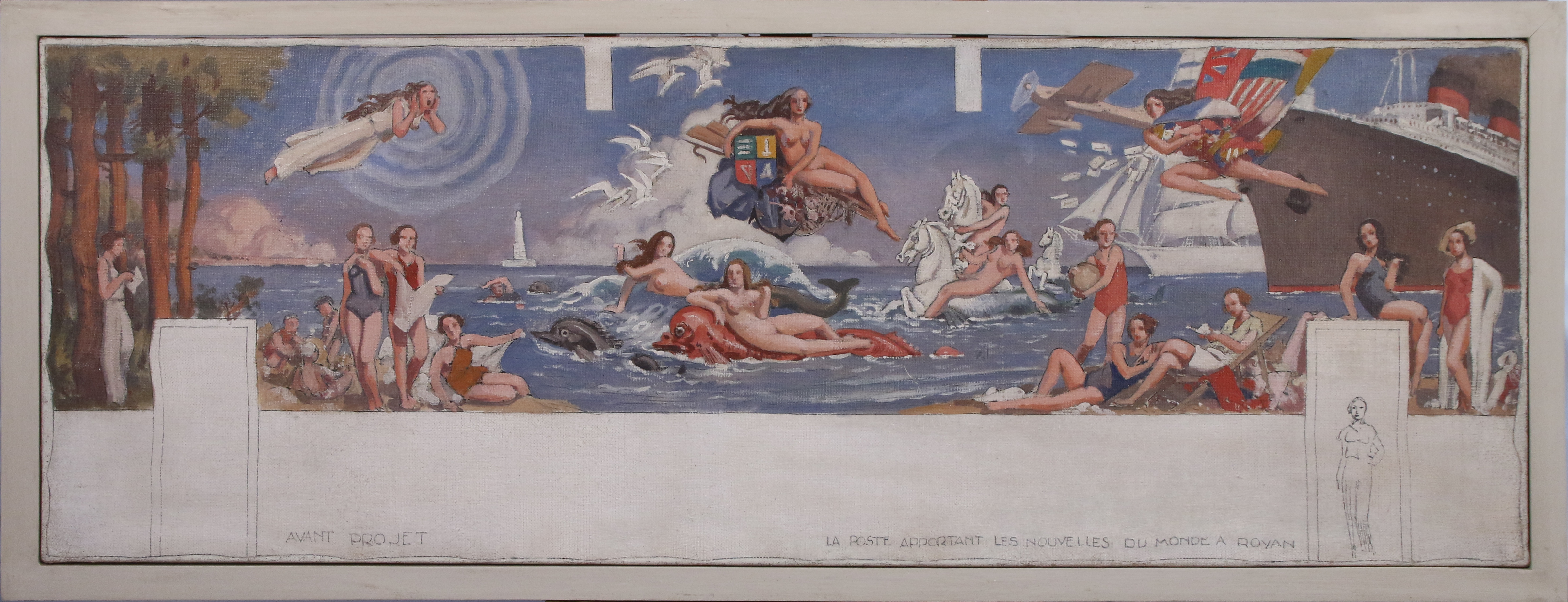 Preliminary project on canvas of La Poste bringing world news to Royan by Delorme, c. 1938