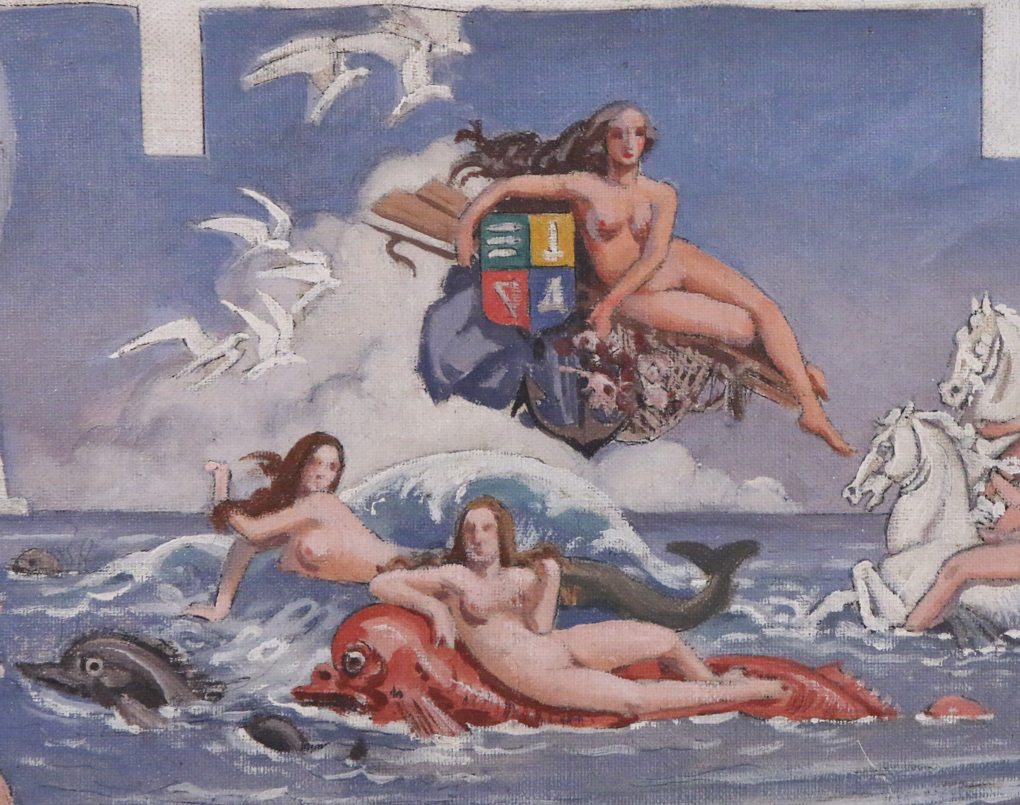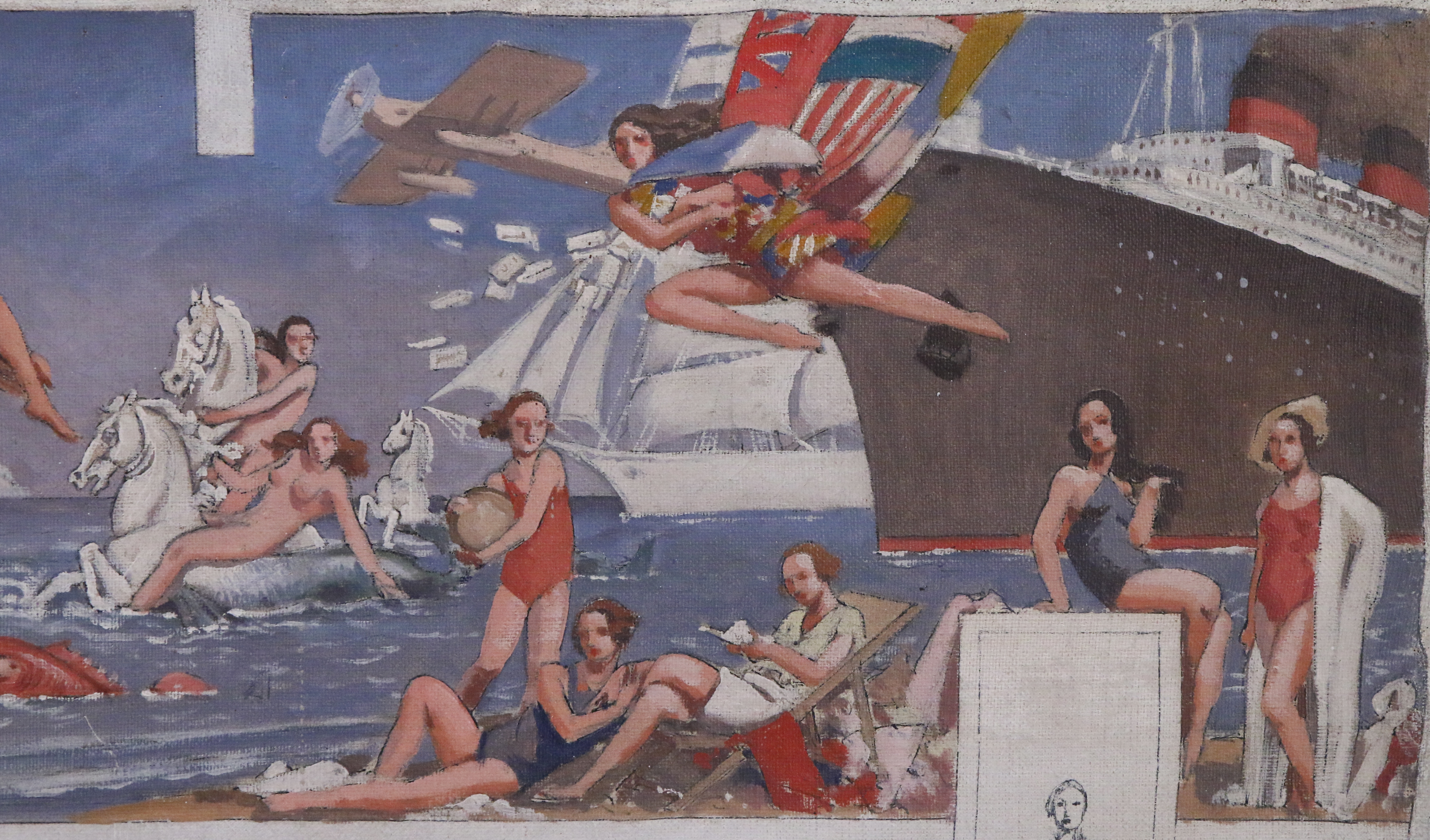 Avant projet sur toile de La Poste apportant les nouvelles du monde à Royan par Delorme, c. 1938