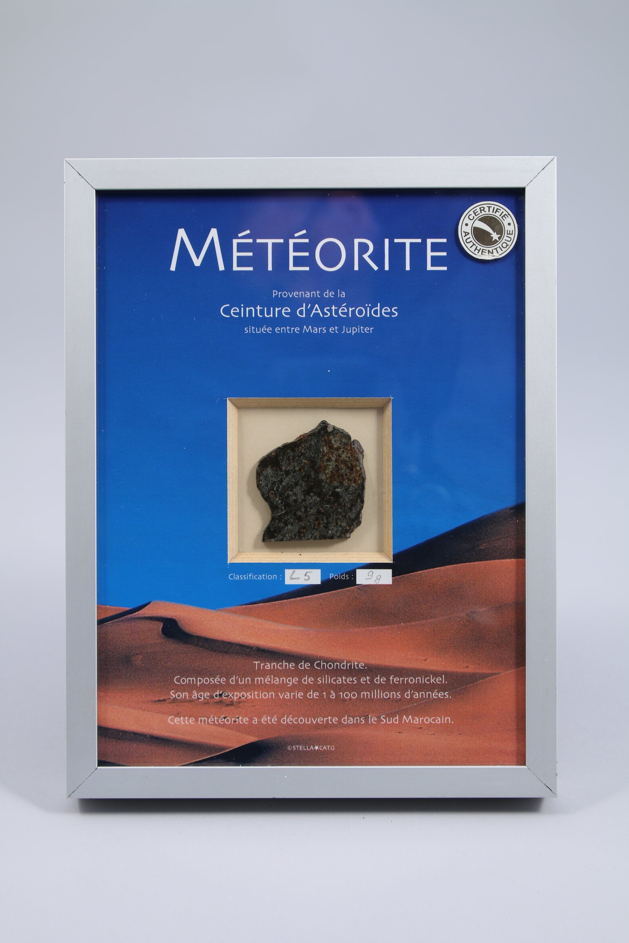 Cette tranche a été découpée dans une météorite trouvée par Gérard Merlier et préalablement classifiée par l'équipe " Météorites " du laboratoire de Minéralogie au Muséum national d'histoire naturelle de Paris (actuel IMPMC) en 2000 et 2010.
