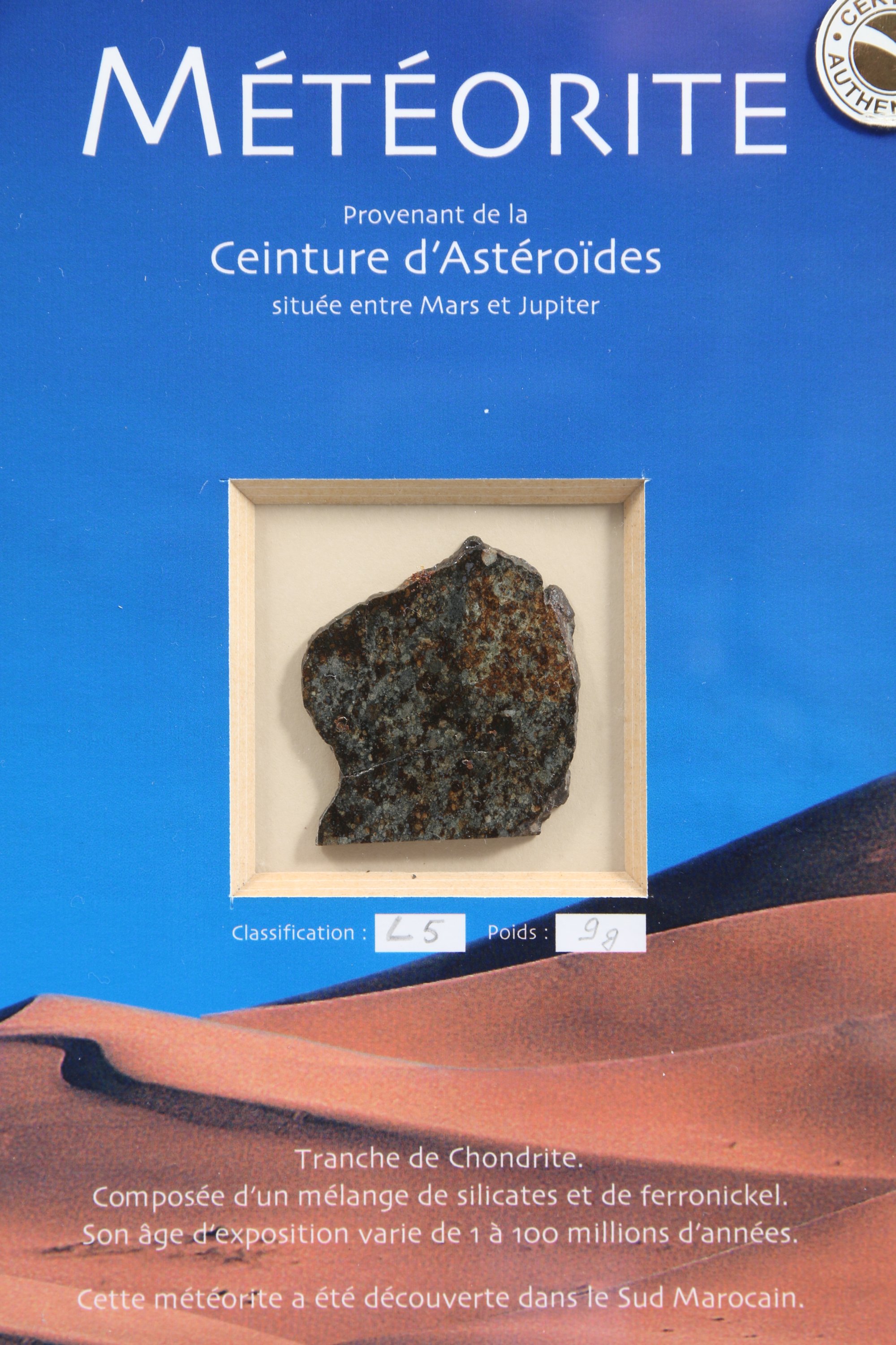 CHONDRITE L5. Une TRANCHE de MÉTÉORITE polie et légèrement vernie dans un encadrement.