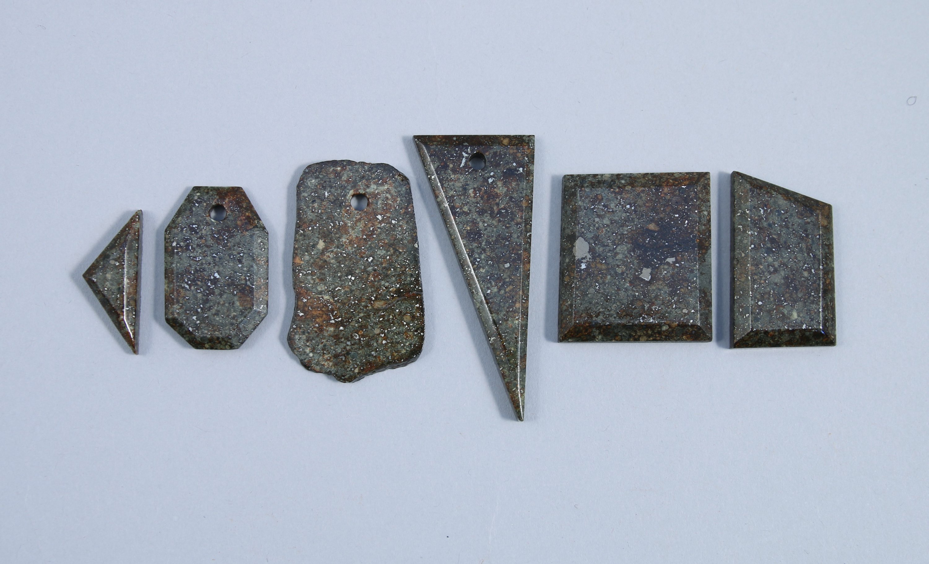 CHONDRITE H ou L. LOT de SIX CRÉATIONS ORIGINALES en MÉTÉORITE facettée de la " Ceinture d'Astéroïdes " entre Mars et Jupiter. Faces polies et légèrement vernies.