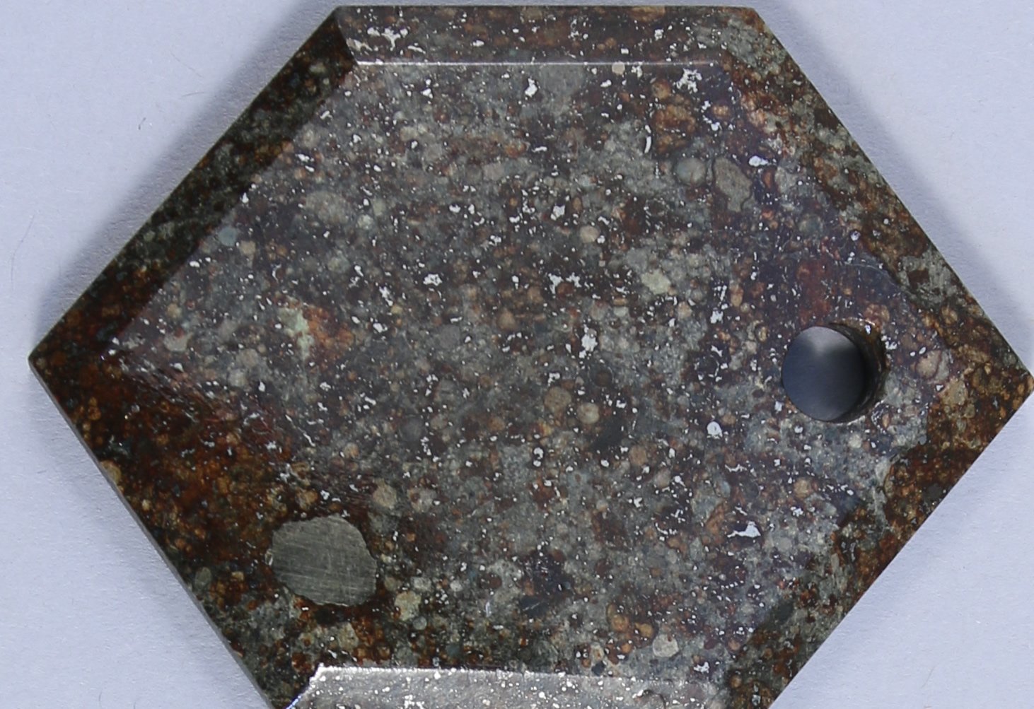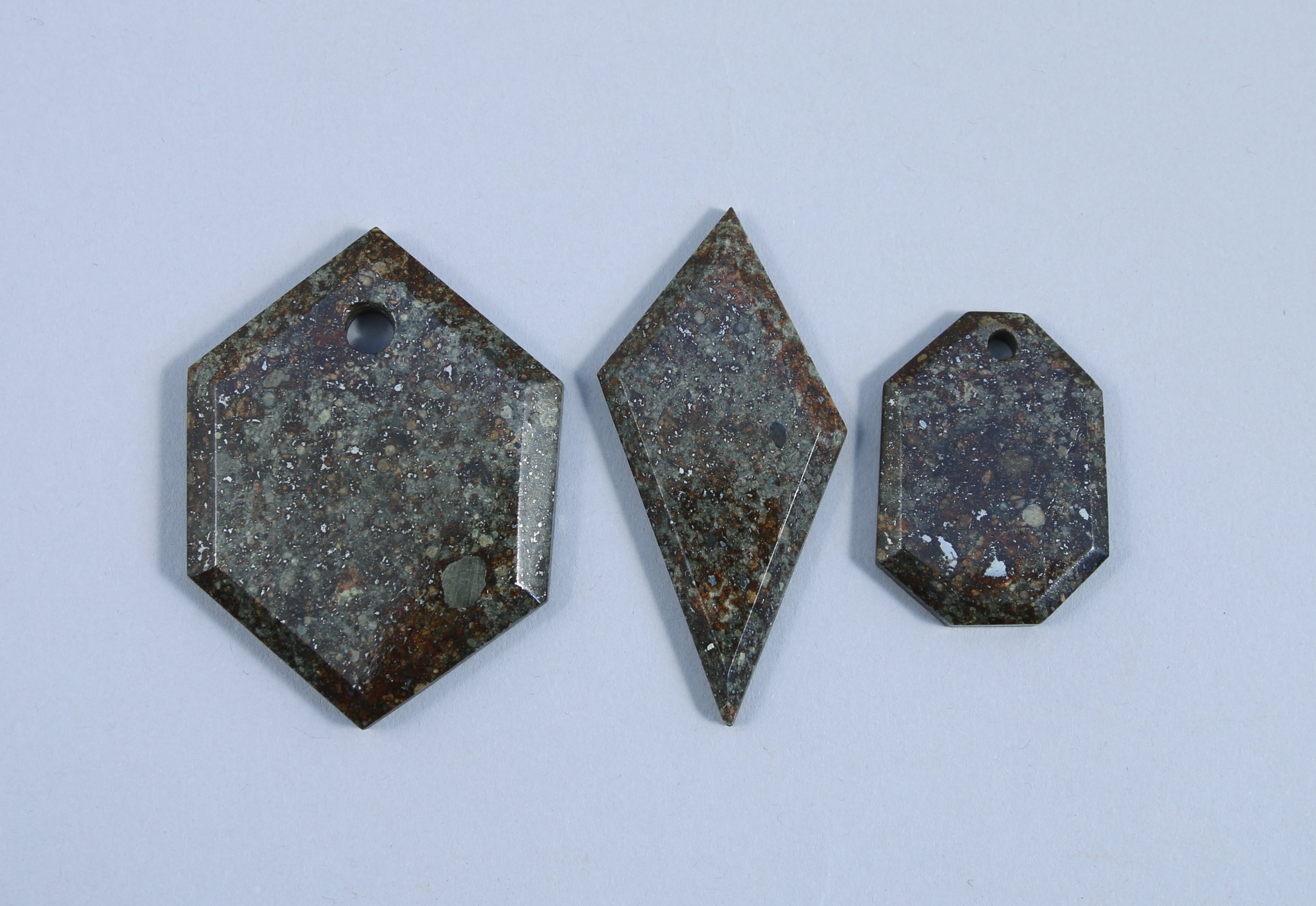 CHONDRITE H ou L. LOT de TROIS CRÉATIONS ORIGINALES en MÉTÉORITE facettée de la " Ceinture d'Astéroïdes " entre Mars et Jupiter. Faces polies et légèrement vernies.