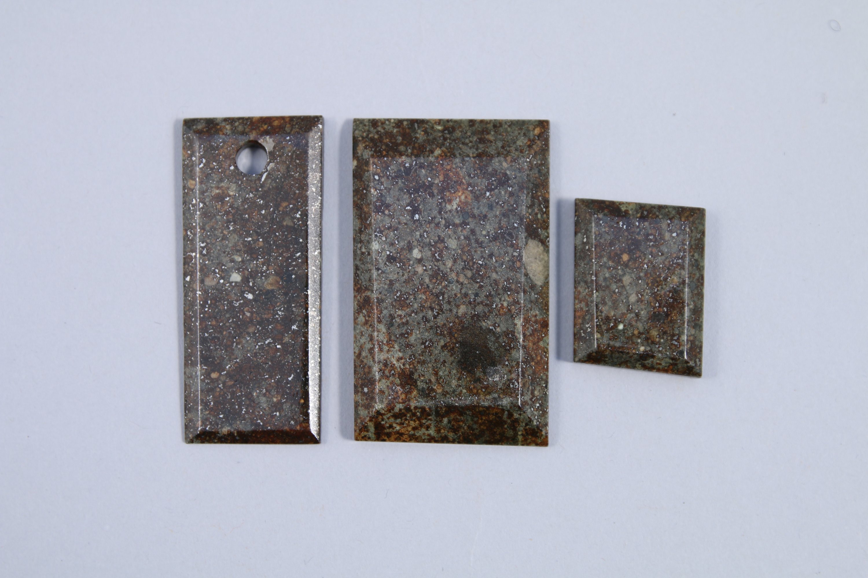 CHONDRITE H ou L. LOT de TROIS CRÉATIONS ORIGINALES en MÉTÉORITE facettée de la " Ceinture d'Astéroïdes " entre Mars et Jupiter. Faces polies et légèrement vernies.