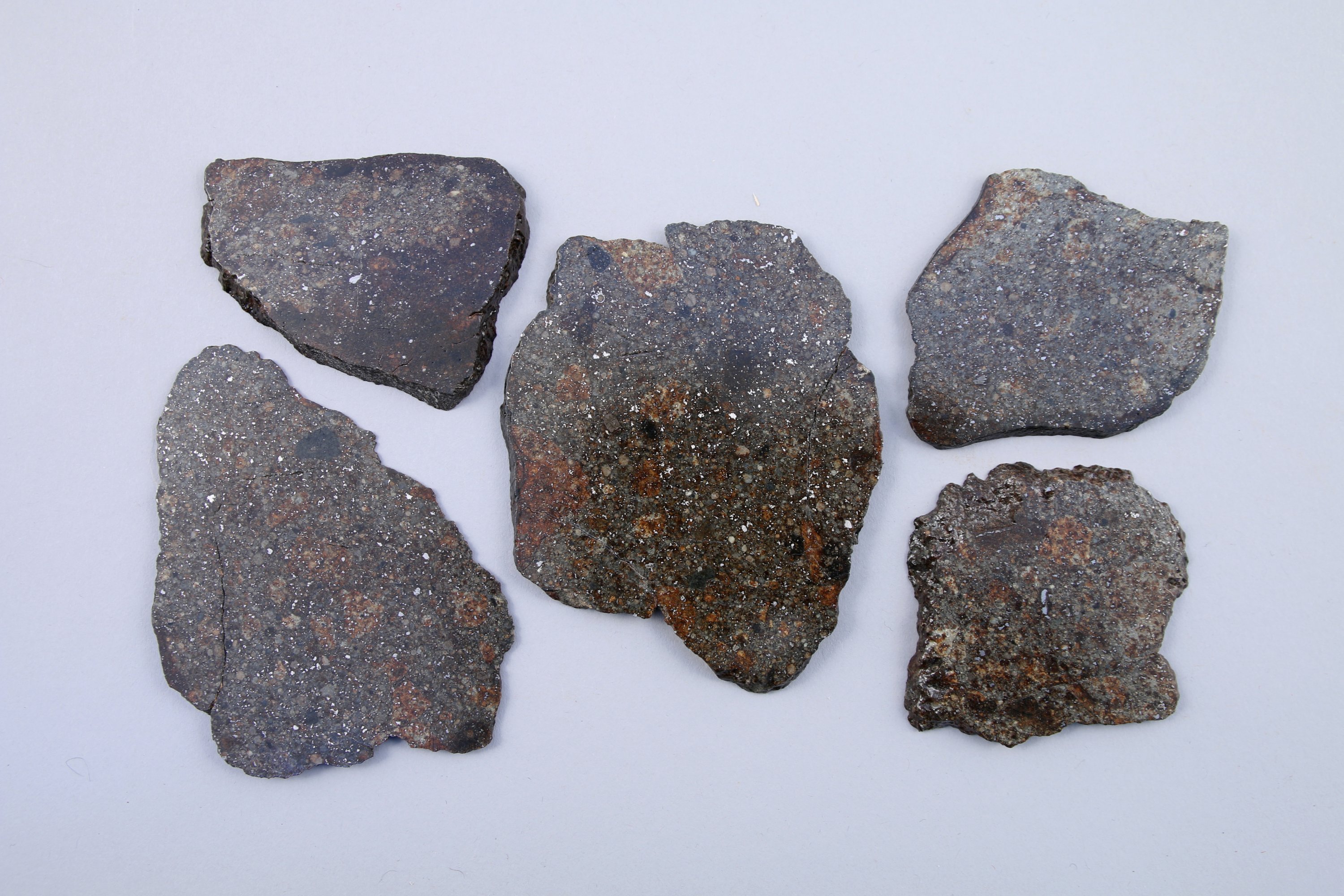 CHONDRITE H ou L. LOT CINQ TRANCHES de MÉTÉORITE de la " Ceinture d'Astéroïdes " entre Mars et Jupiter. Une face polie et légèrement vernie, l'autre naturelle.