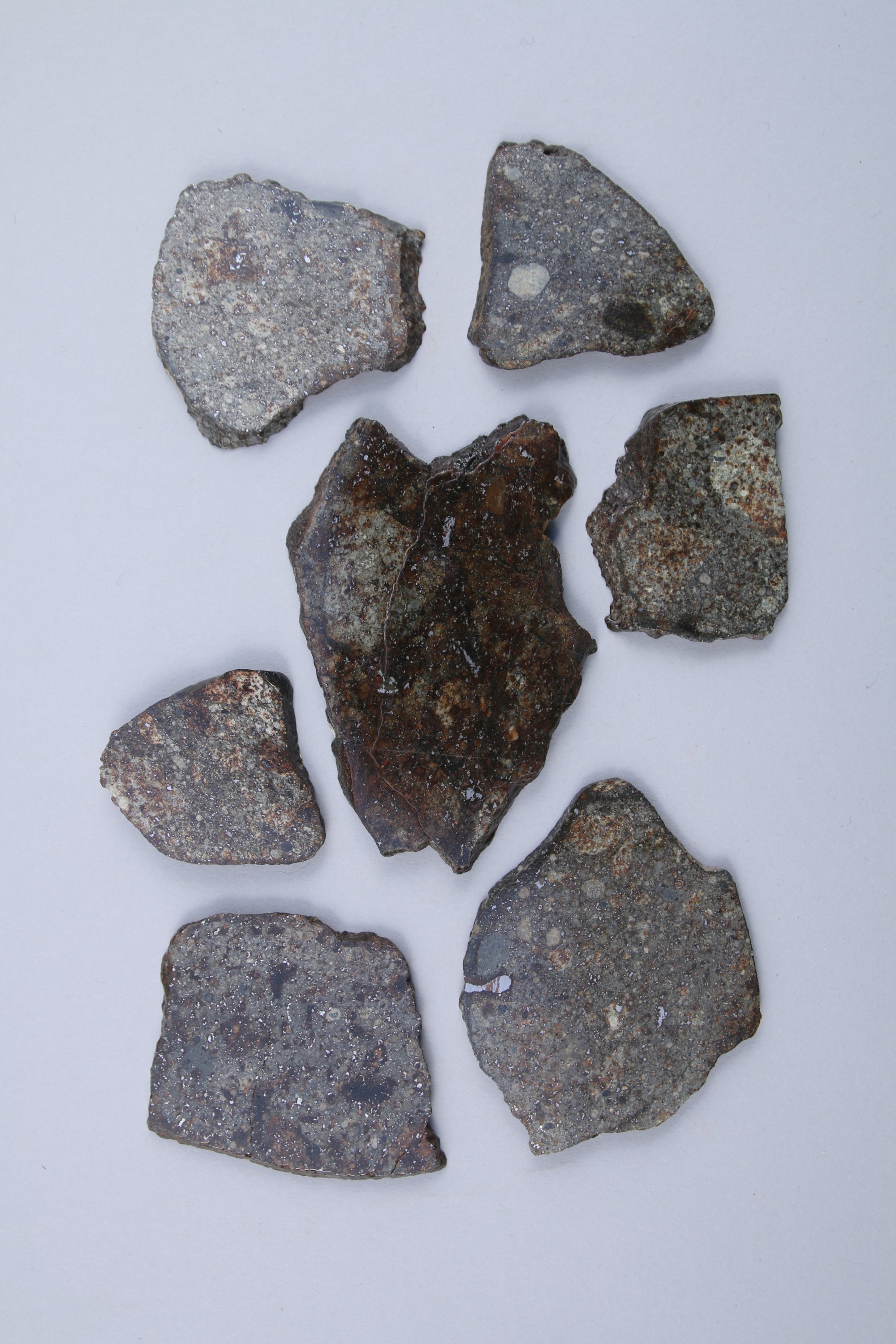CHONDRITE H ou L. LOT de SEPT TRANCHES de MÉTÉORITE de la " Ceinture d'Astéroïdes " entre Mars et Jupiter. Une face polie et légèrement vernie, l'autre naturelle.