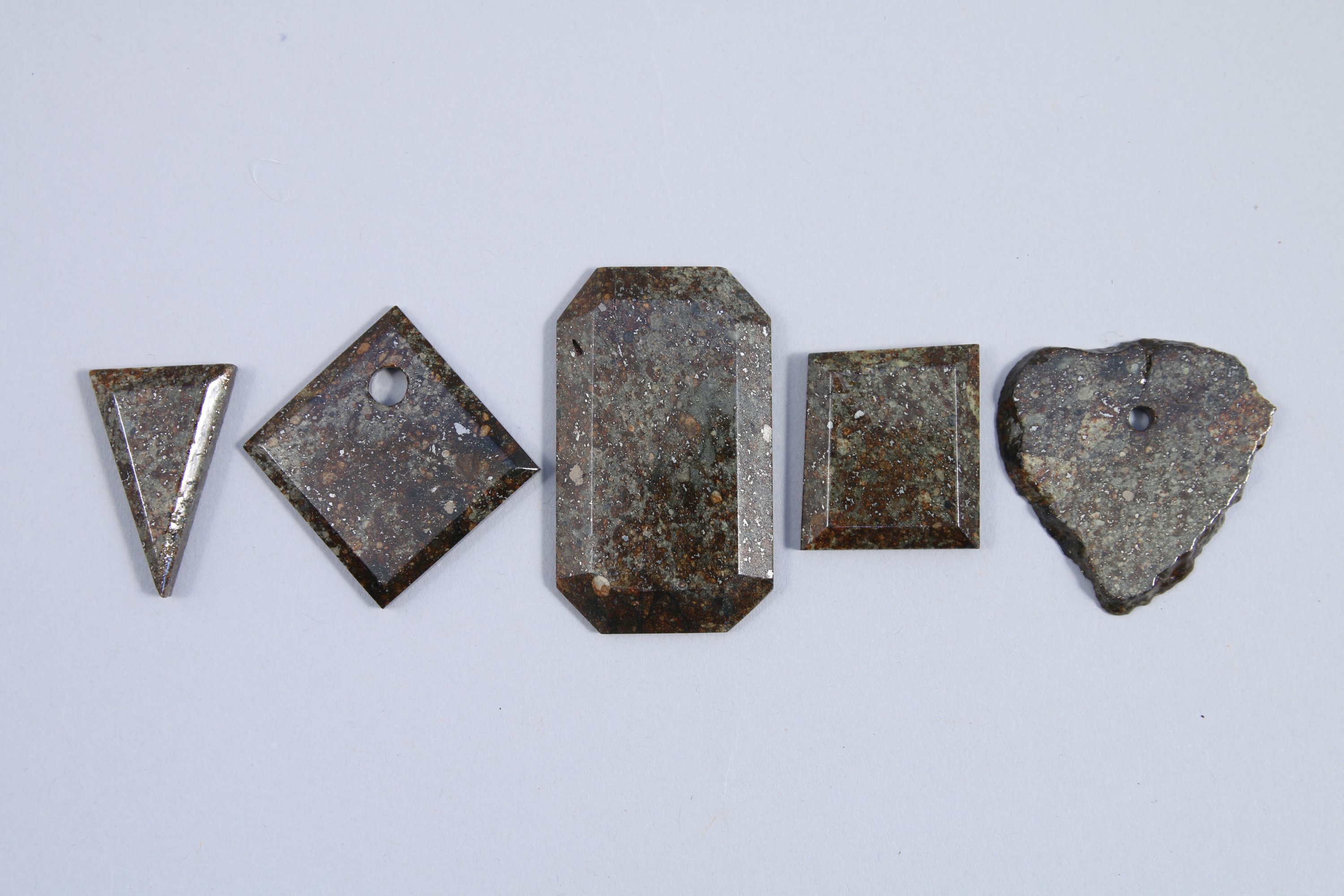 CHONDRITE H ou L. LOT de CINQ CRÉATIONS ORIGINALES en MÉTÉORITE facettée de la " Ceinture d'Astéroïdes " entre Mars et Jupiter. Faces polies et légèrement vernies.