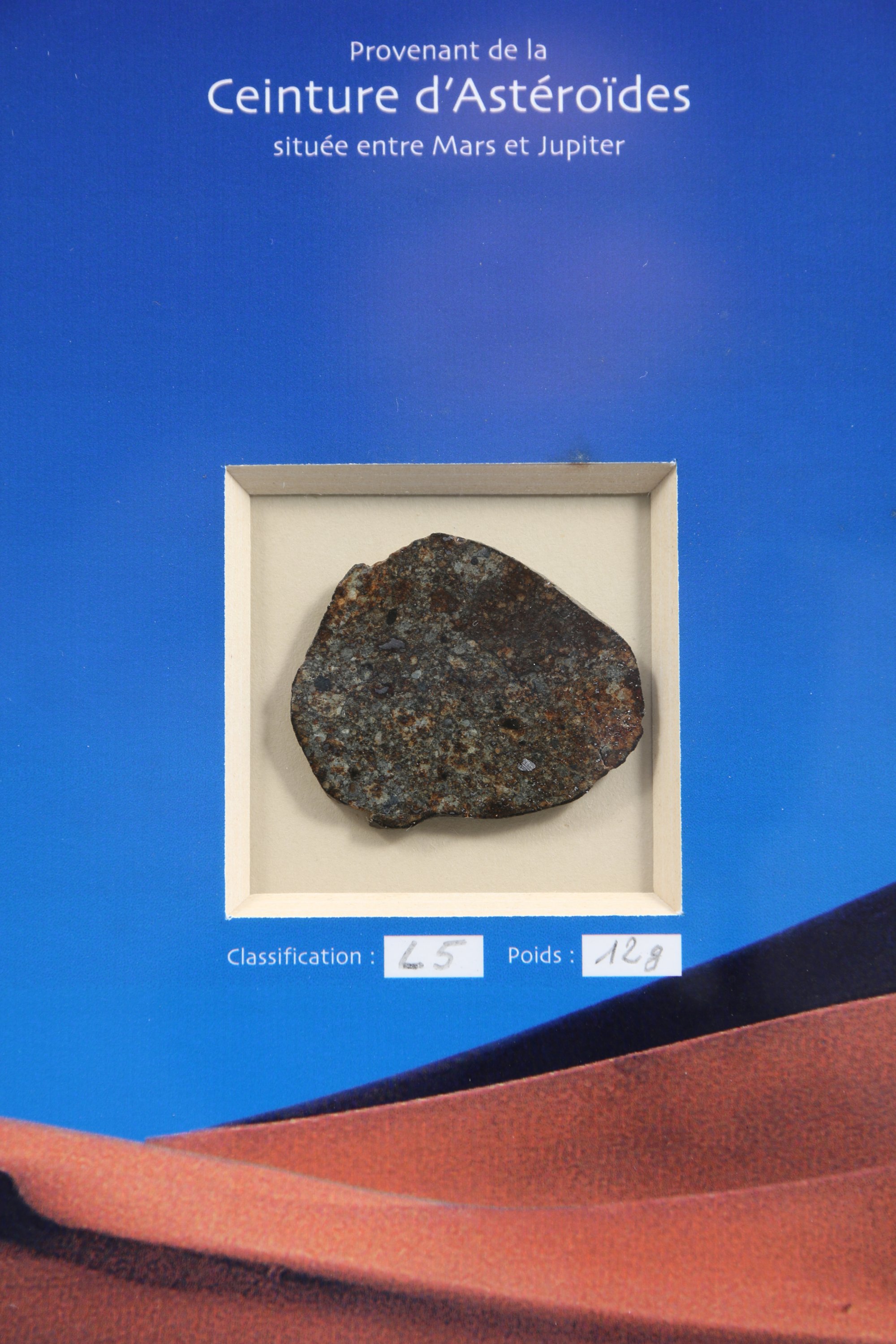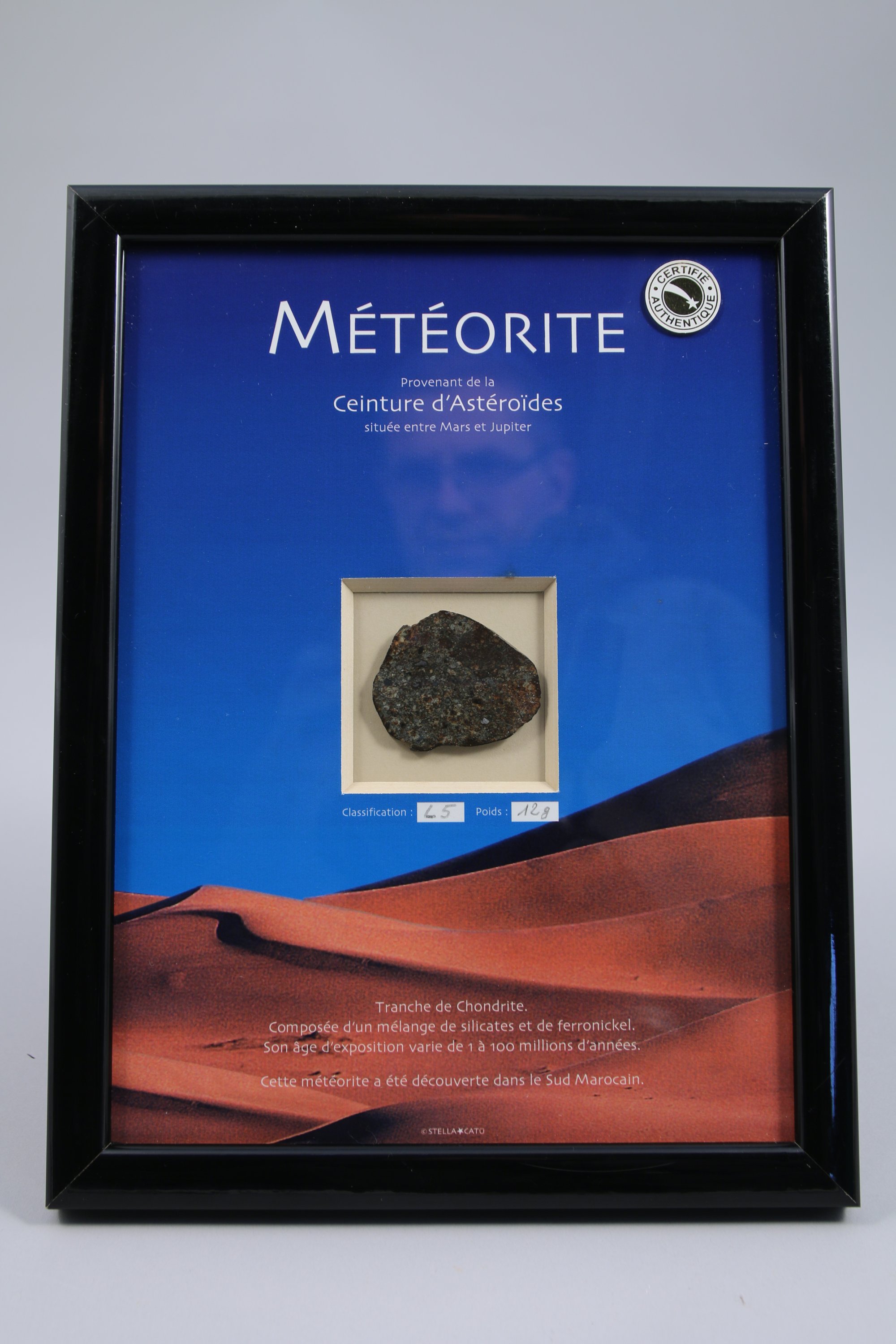 Cette tranche a été découpée dans une météorite trouvée par Gérard Merlier et préalablement classifiée par l'équipe " Météorites " du laboratoire de Minéralogie au Muséum national d'histoire naturelle de Paris (actuel IMPMC) entre 2000 et 2010.