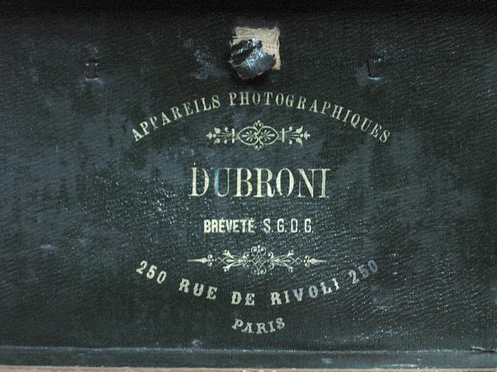 - un appareil en bois forme box, format 6 x 9 cm avec : un châssis amovible en bois avec dépoli ; à l'avant une bague laiton pour objectif (sans objectif) ; 2 écrous de pied (dessous et sur un côté) ; au-dessus une étiquette ovale en métal façon doré avec marque et adresse "Dubroni, 250 rue de Rivoli, Paris".