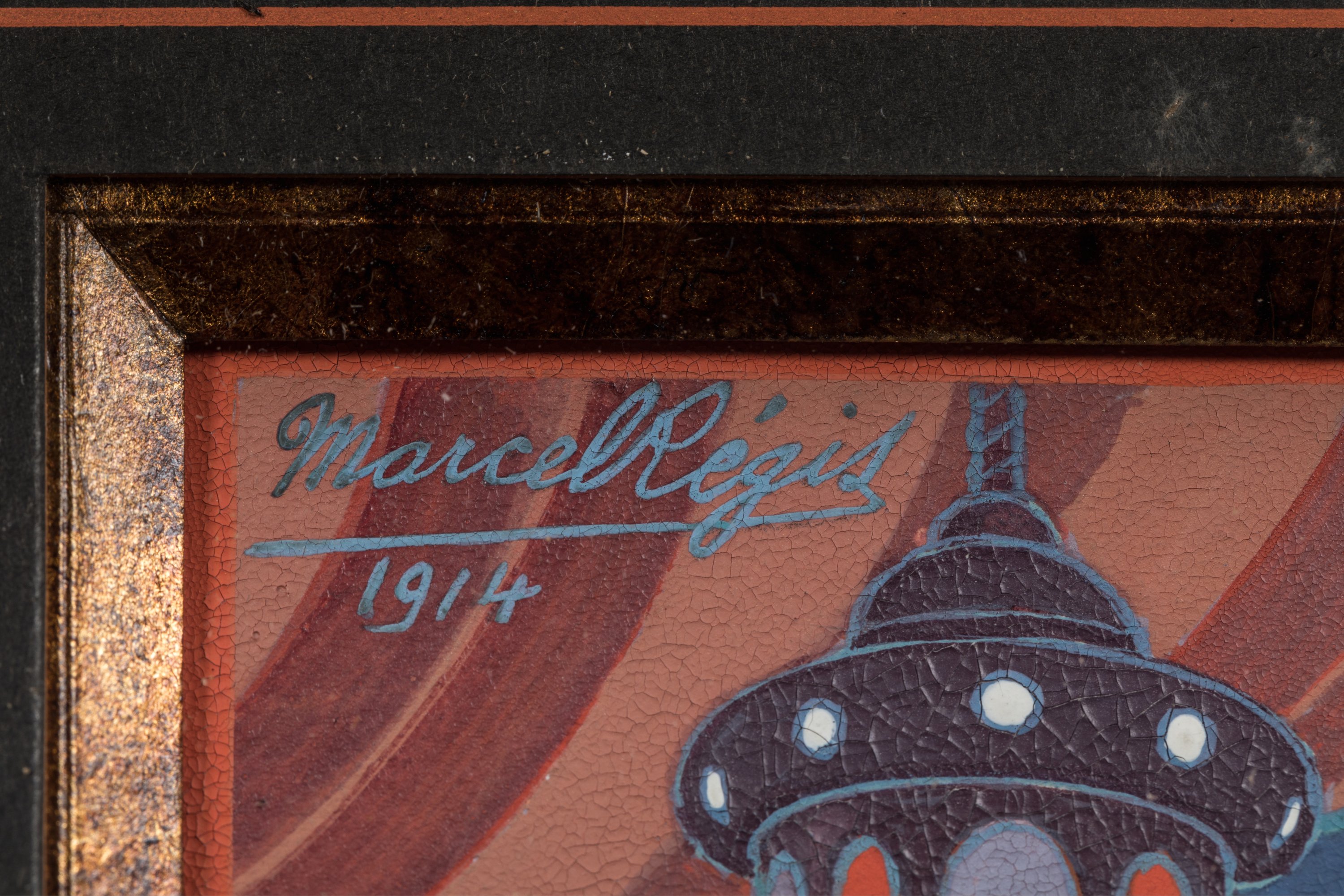 Employé d'une soierie lyonnaise, "Marcel Régis" de Chazournes est issu d'une grande famille qui donna plusieurs secrétaires d'État à la France. Sa jeune sœur épousera après la guerre un fils Combet, issu d'une prestigieuse famille de soyeux. Ces dix gouaches aux élégantes sont probablement des projets d'éventails, que la guerre vint avorter, puisque Marcel Régis meurt pour la France en 1917, sur le Chemin des Dames.