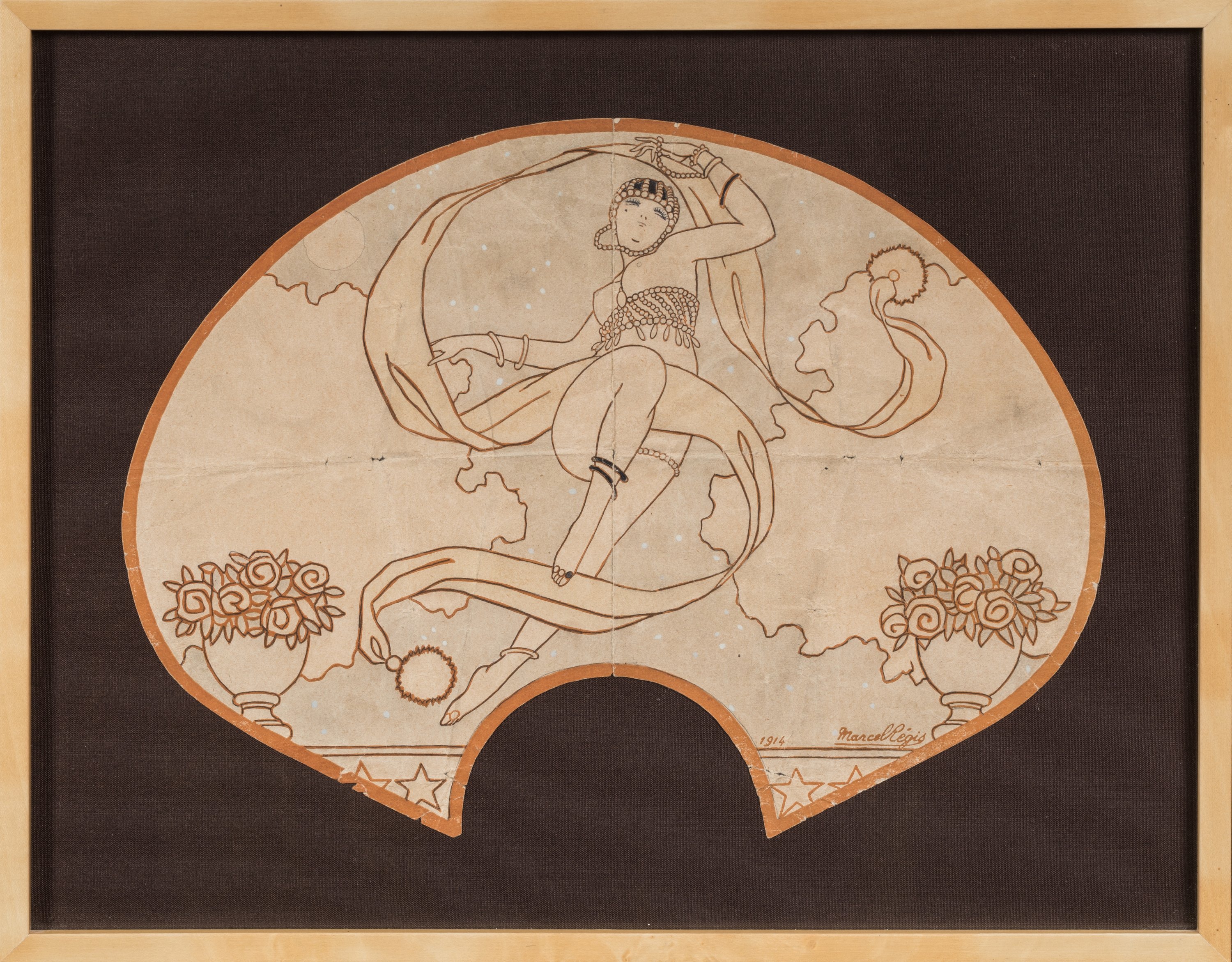 Employé d'une soierie lyonnaise, "Marcel Régis" de Chazournes est issu d'une grande famille qui donna plusieurs secrétaires d'État à la France. Sa jeune sur épousera après la guerre un fils Combet, issu d'une prestigieuse famille de soyeux. Ces dix gouaches aux élégantes sont probablement des projets d'éventails, que la guerre vint avorter, puisque Marcel Régis meurt pour la France en 1917, sur le Chemin des Dames.