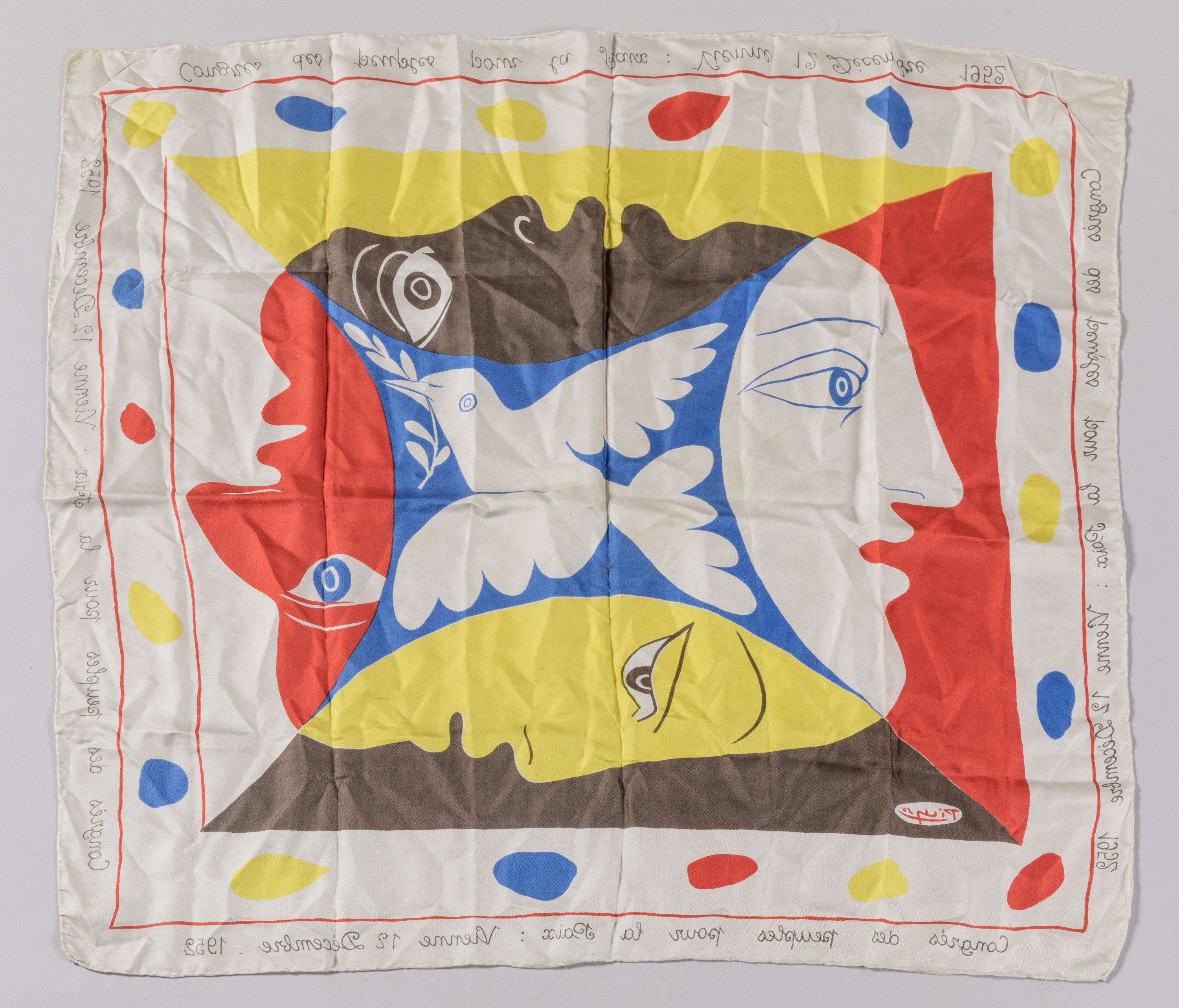 Réalisé à l'occasion du Festival mondial de la jeunesse et des étudiants pour la Paix à Vienne en 1952 ce foulard est représenté en couverture du livre "Picasso, 145 dessins pour la presse et des organisations démocratiques" aux éditions lHumanité, 1973.