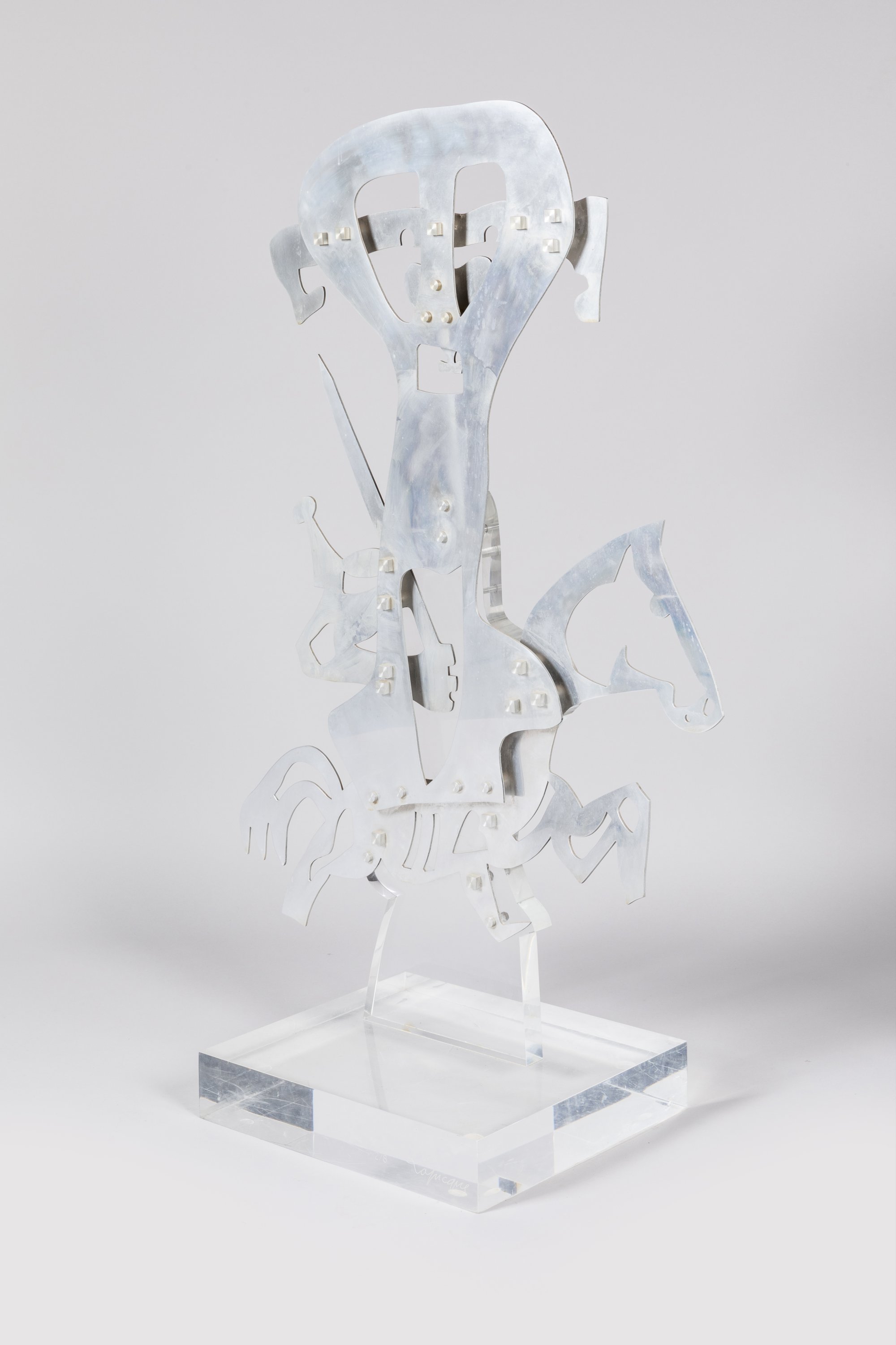 Métal poli découpé et assemblé reposant sur un socle en plexiglas.