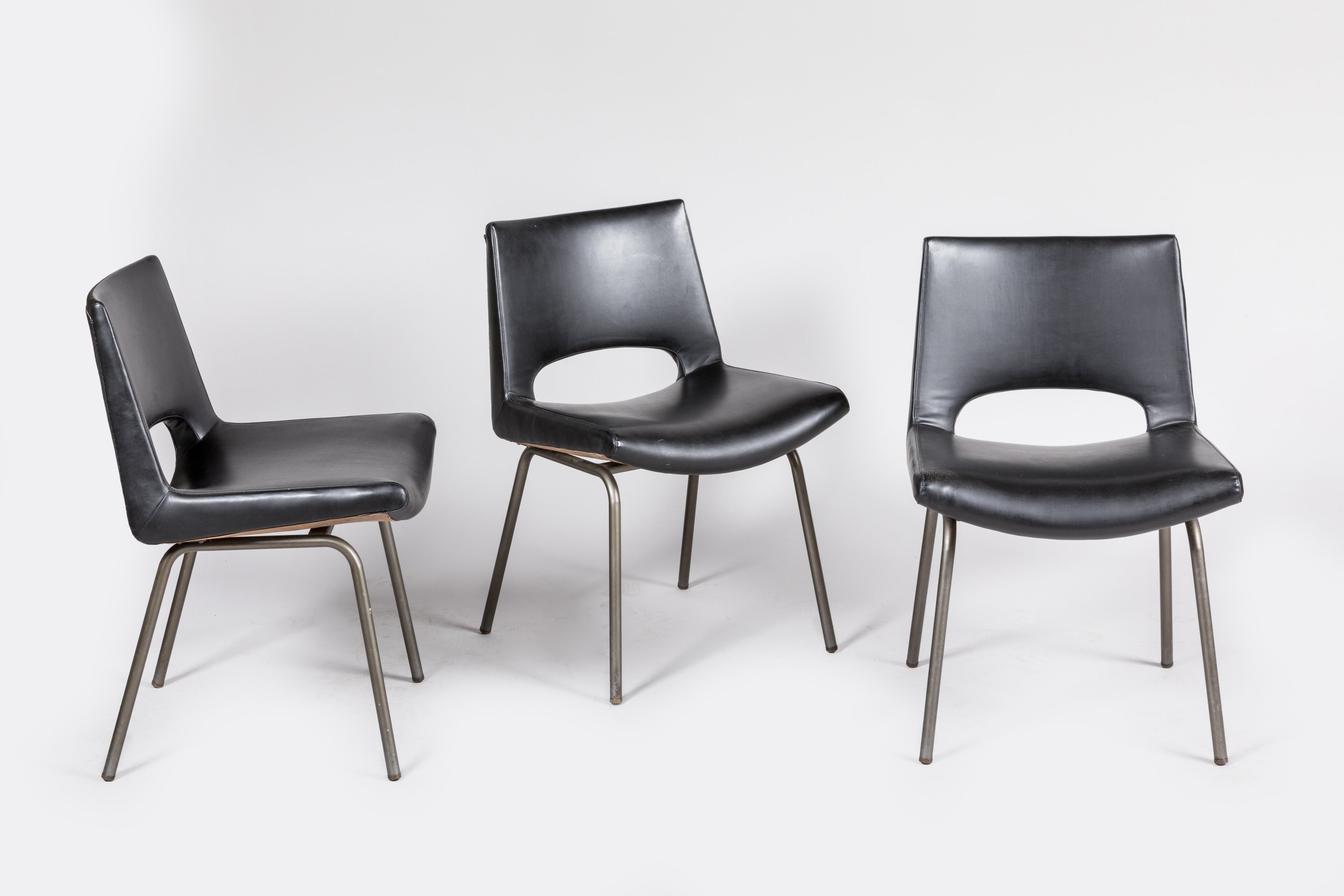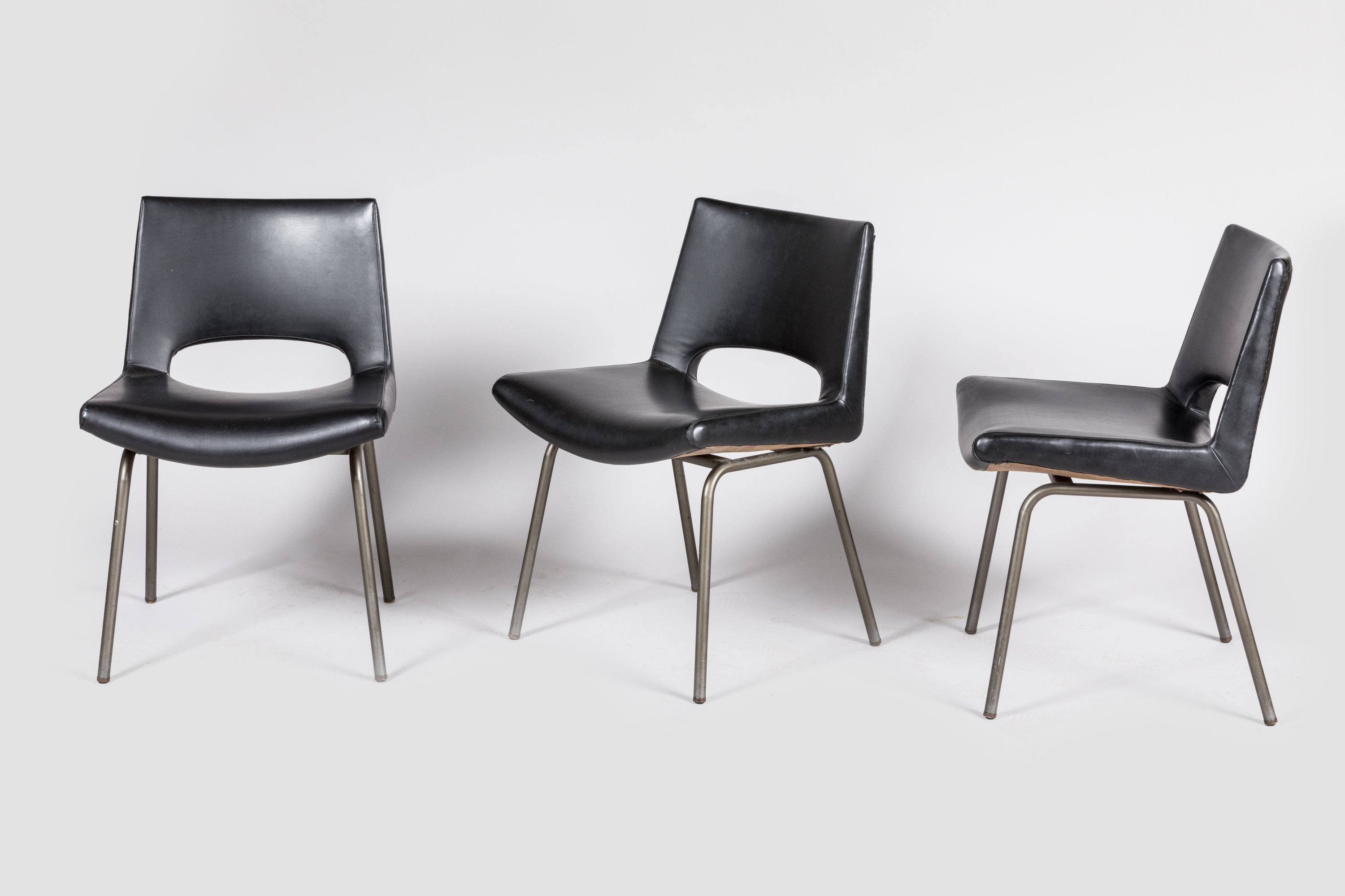 Suite de six chaises en skaï noir et piètement métal, circa 1960.
