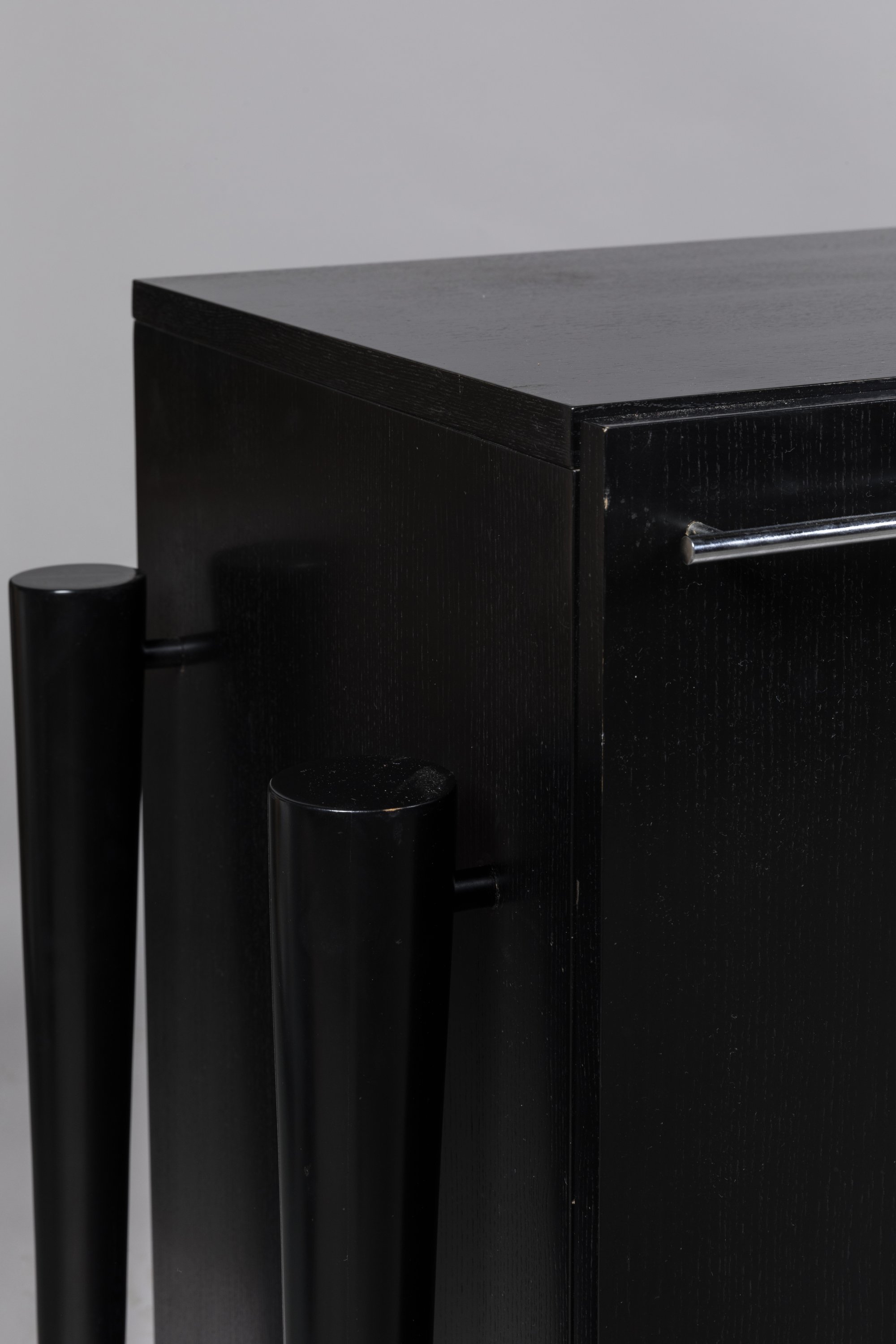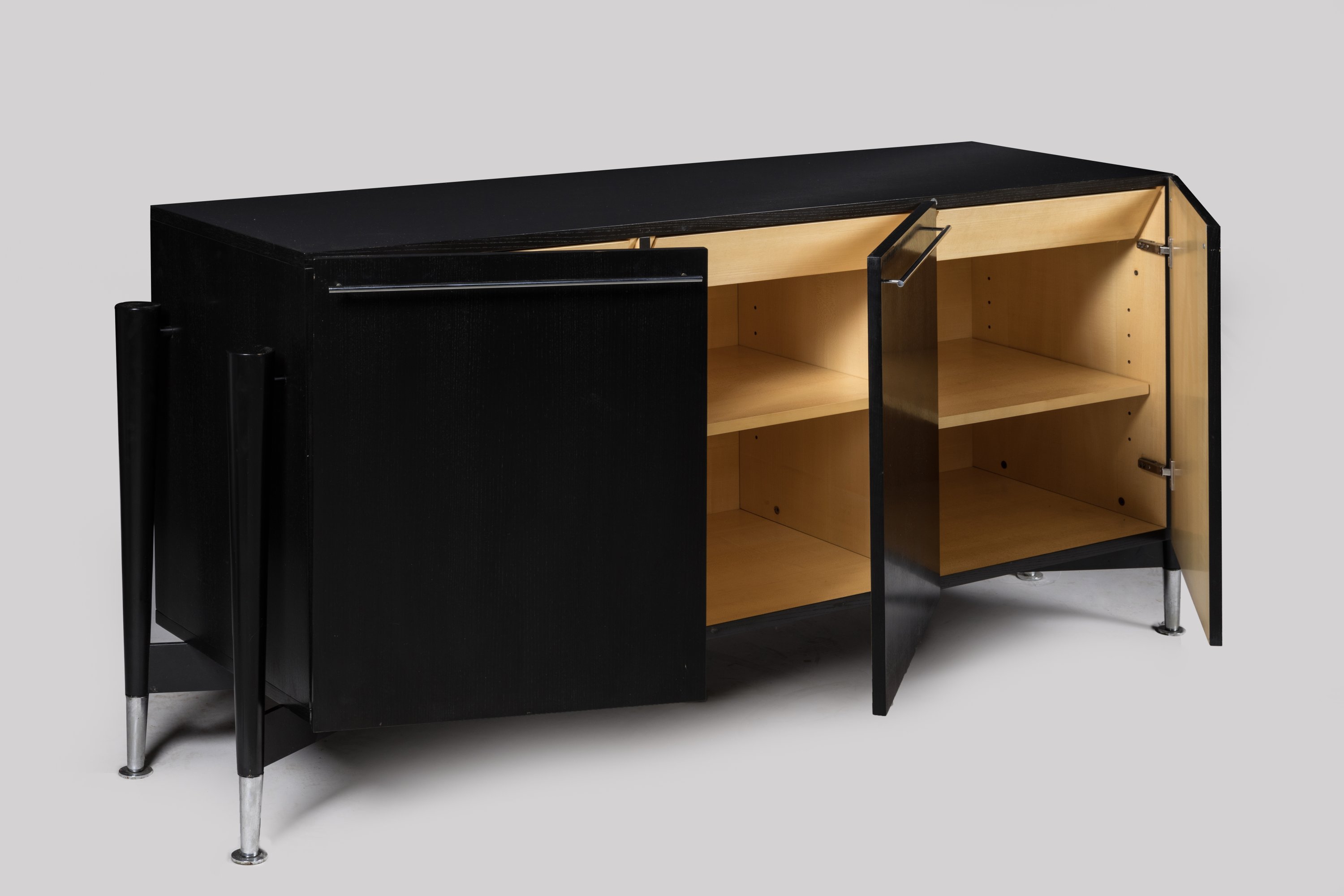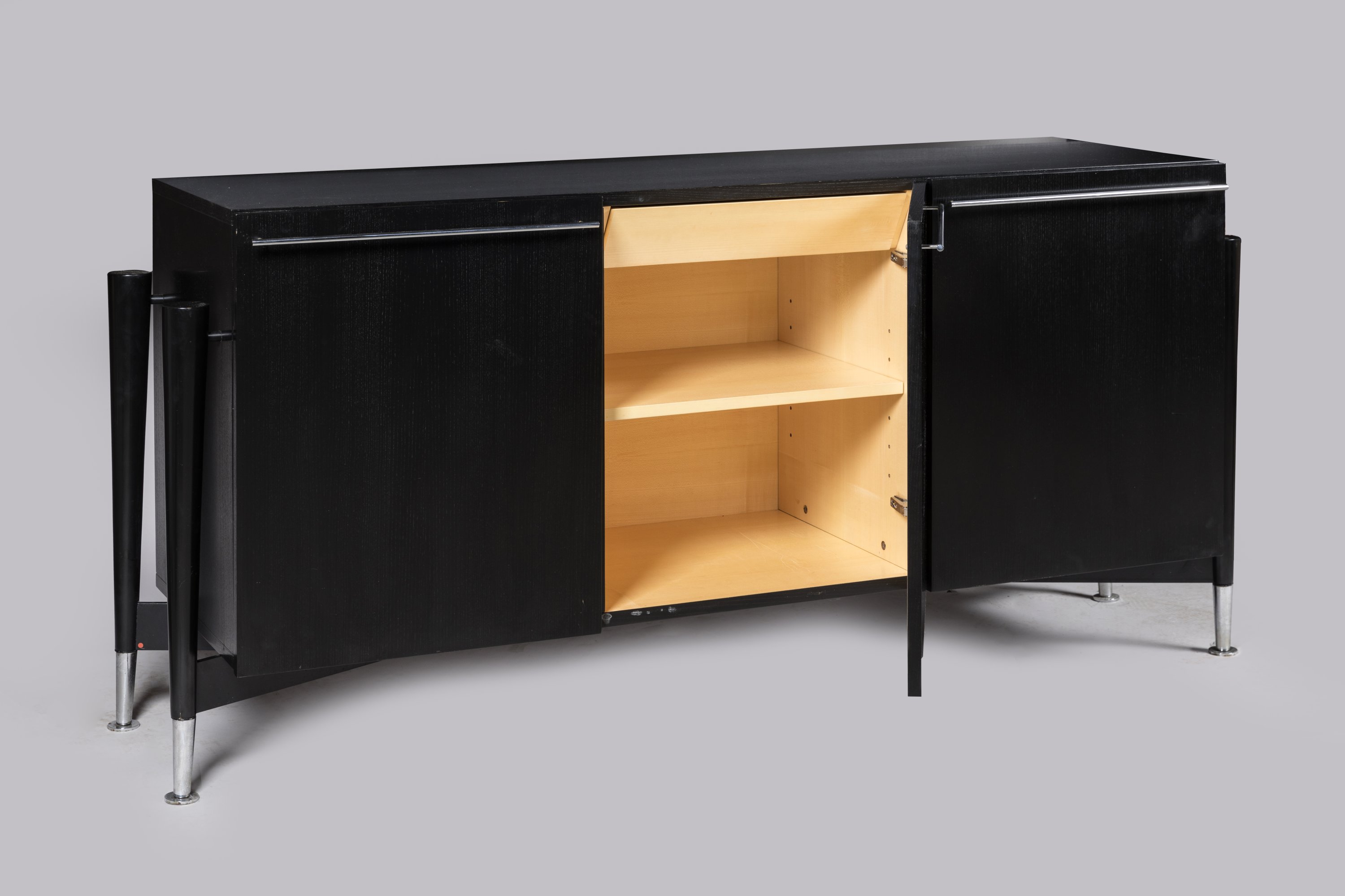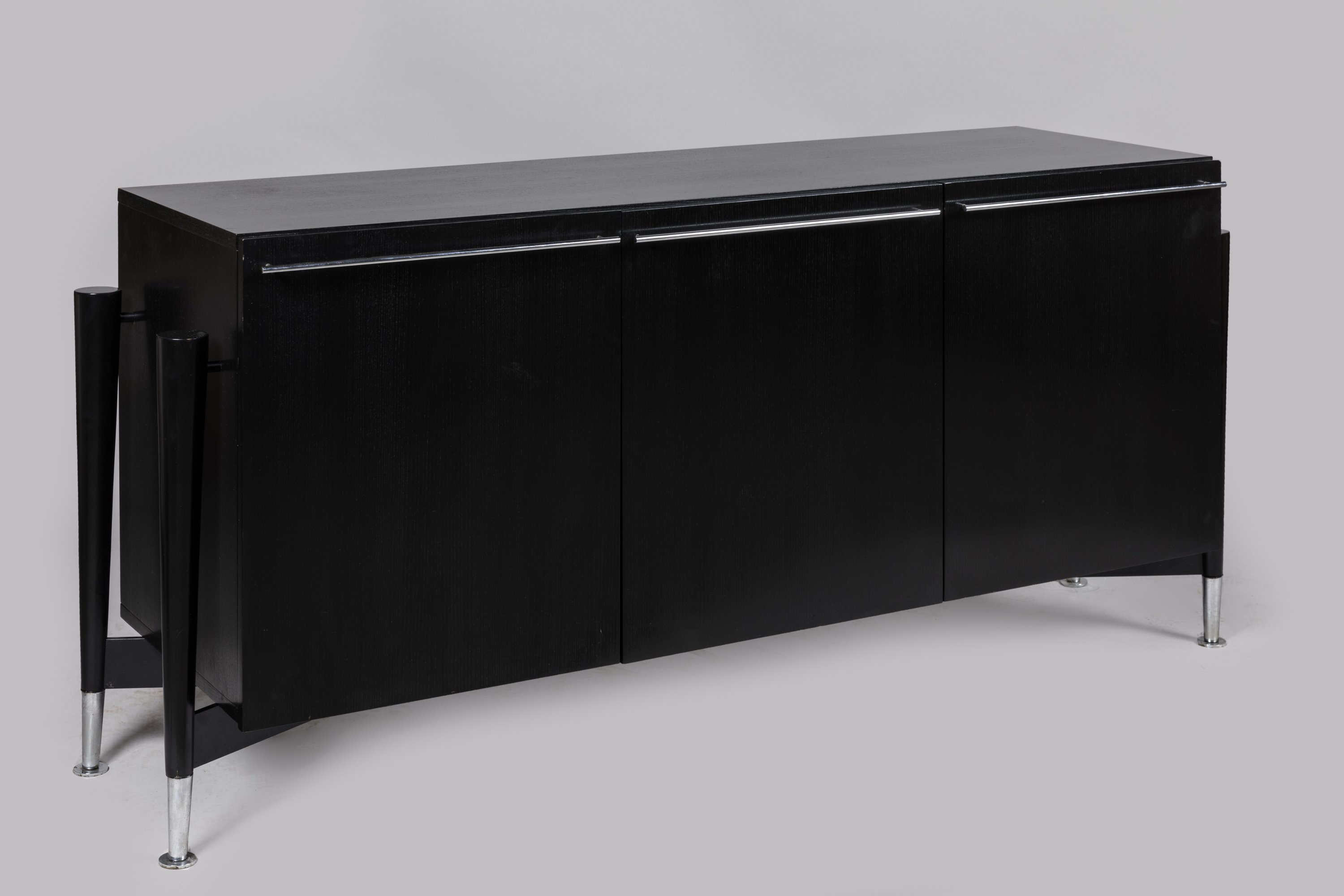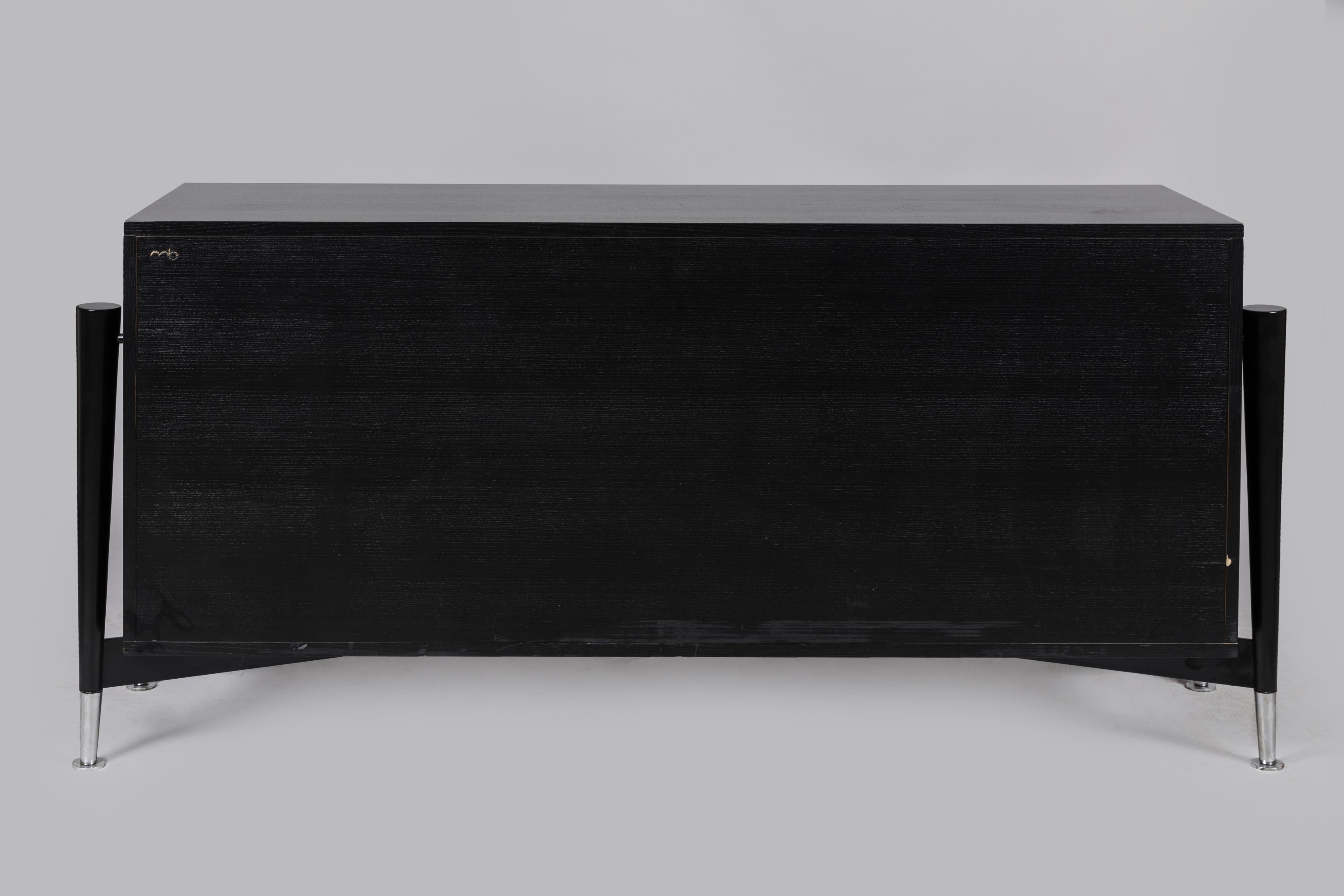 de forme rectangulaire en frêne teinté noir, elle ouvre par trois vantaux, dissimulant trois tiroirs intérieurs en sycomore. Quatre montants détachés en hêtre teinté terminés par des pieds en laiton chromé. Poignées de tirage en laiton chromé.