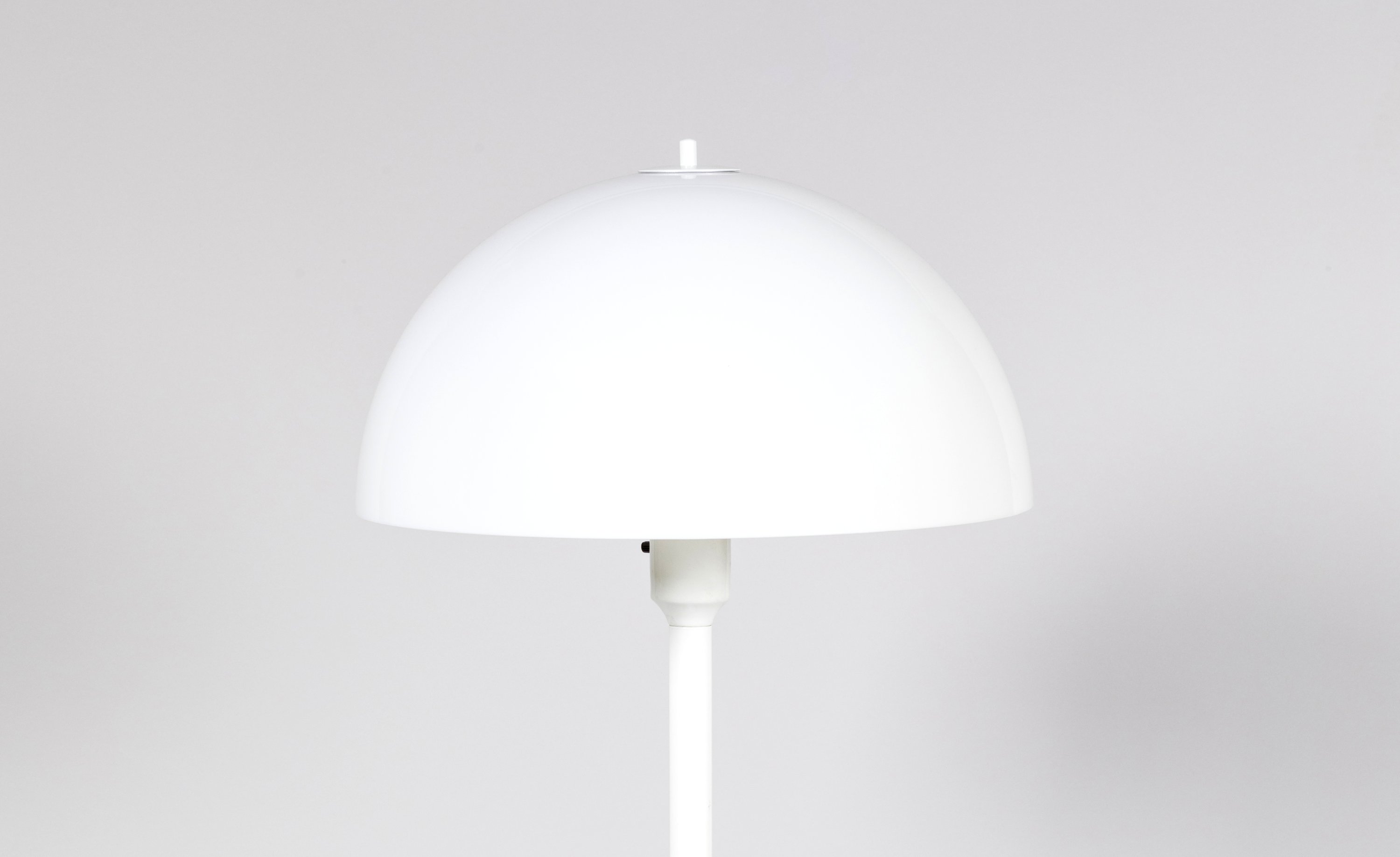 le pied en métal et abat-jour en plastique blanc.