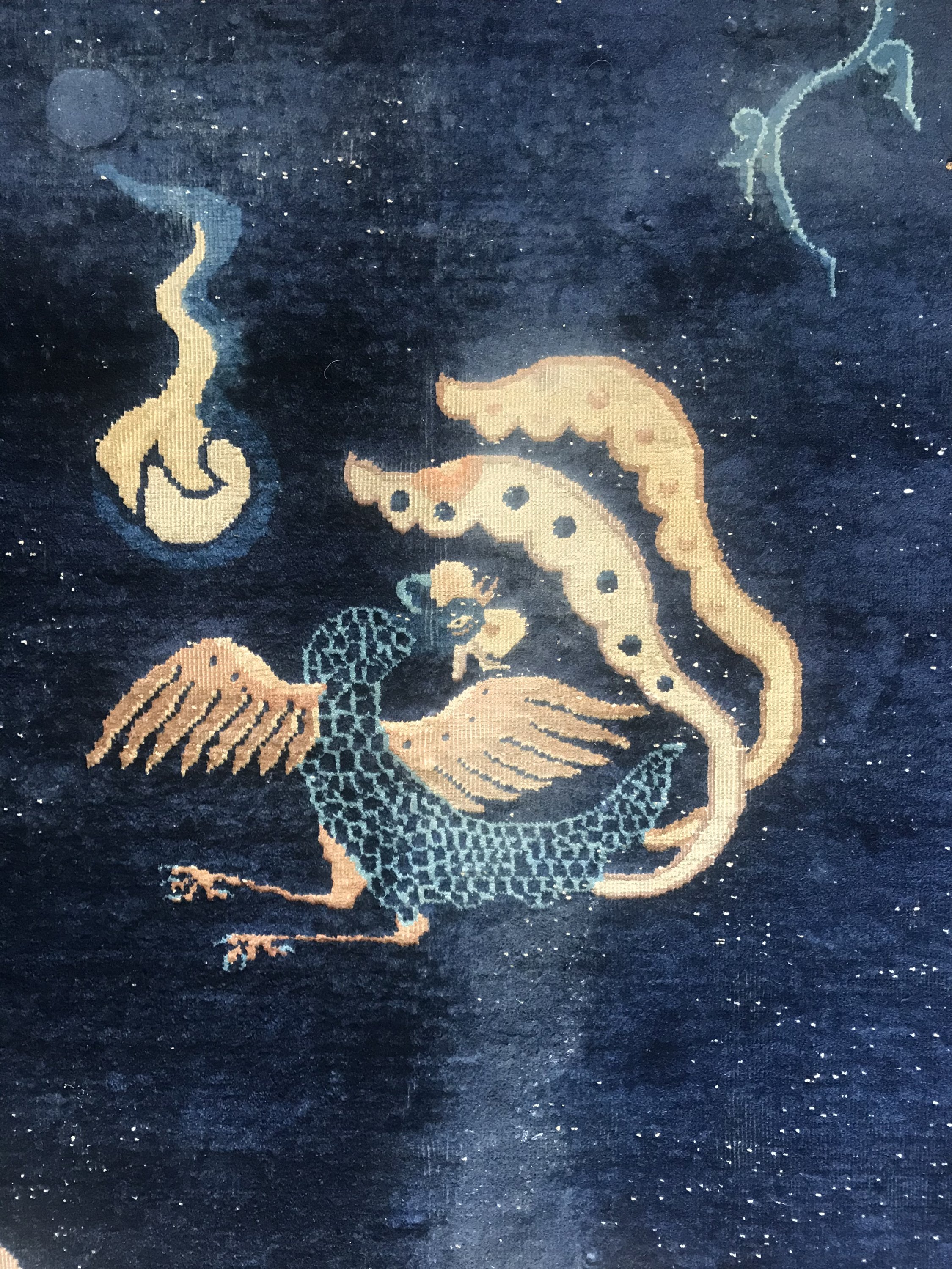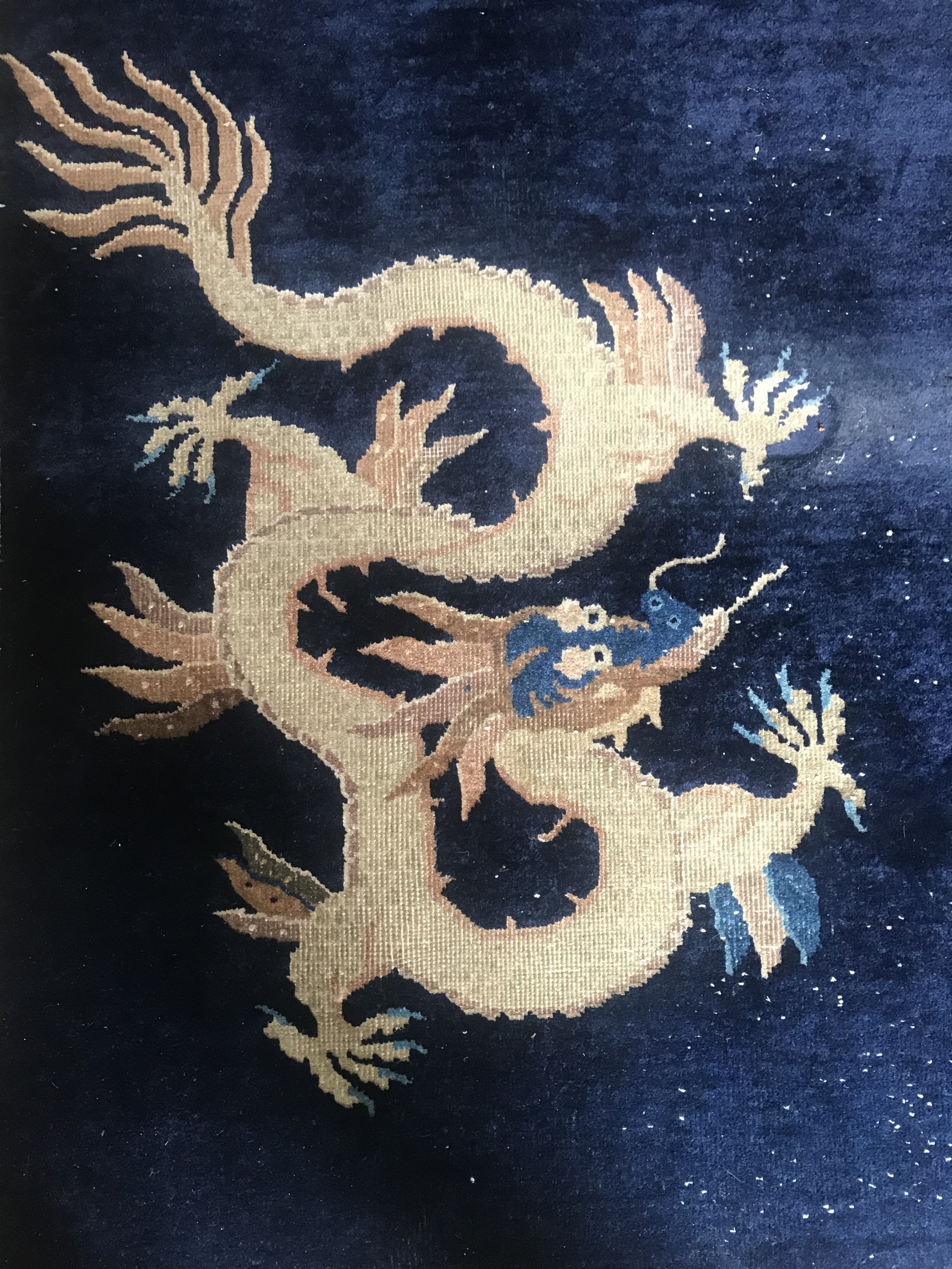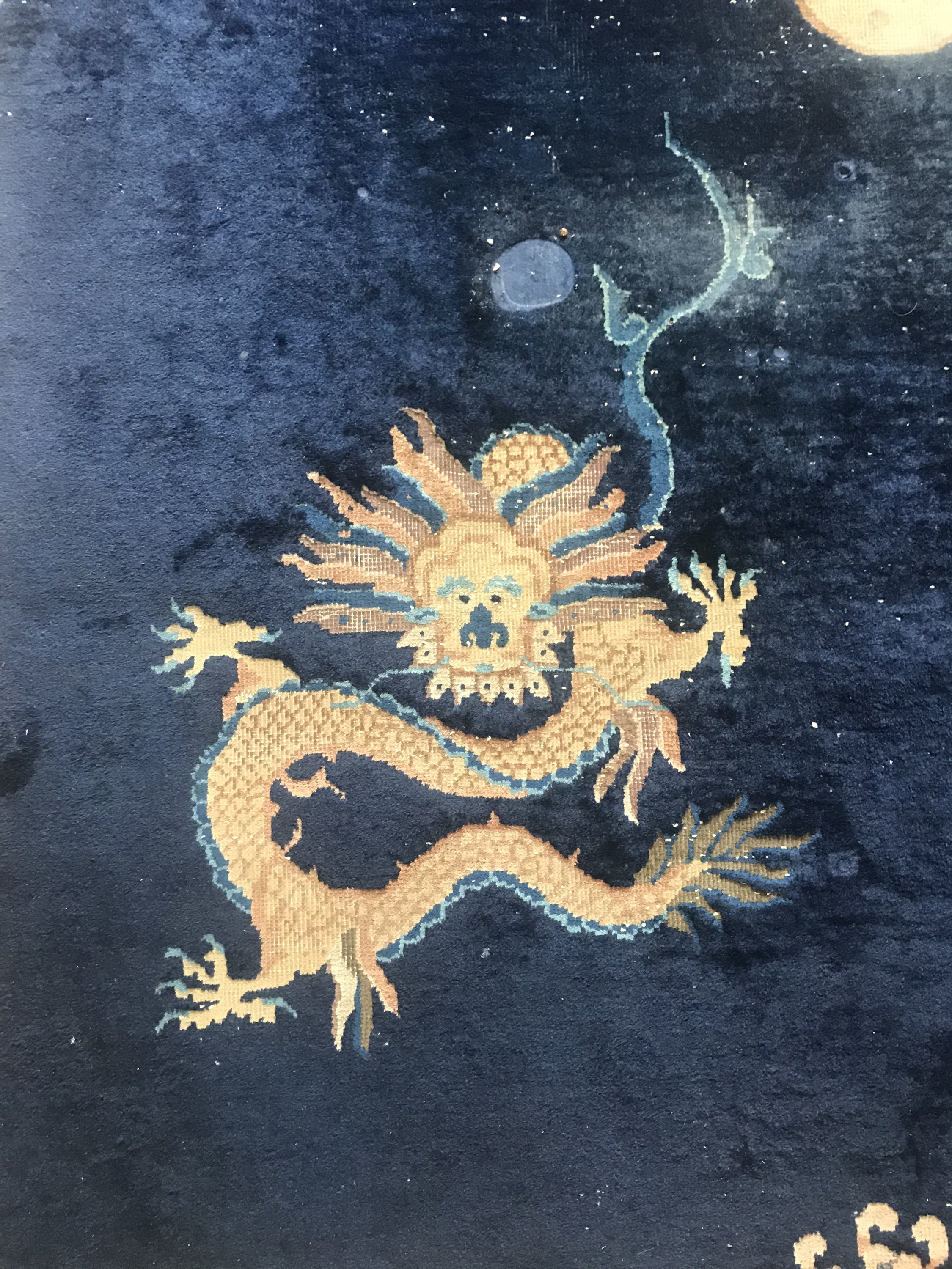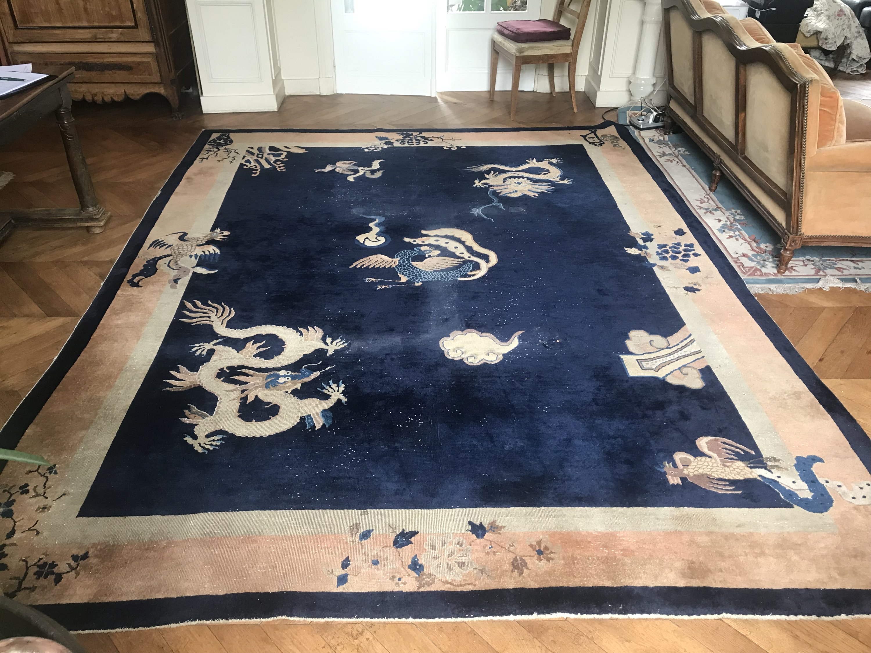 Selon la tradiiotn familiale, le tapis aurait été offetr par la République Populair de Chine en remerciement du rapprochement franco-chinois à Guy MÉNANT à l'issue de la seconde guerre mondiale.