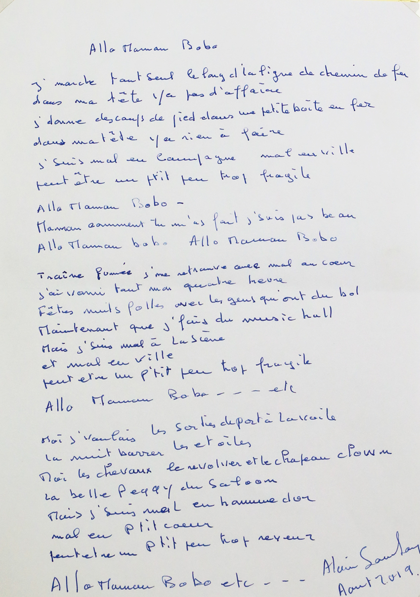 Texte manuscrit des paroles de la chanson, par l'artiste.