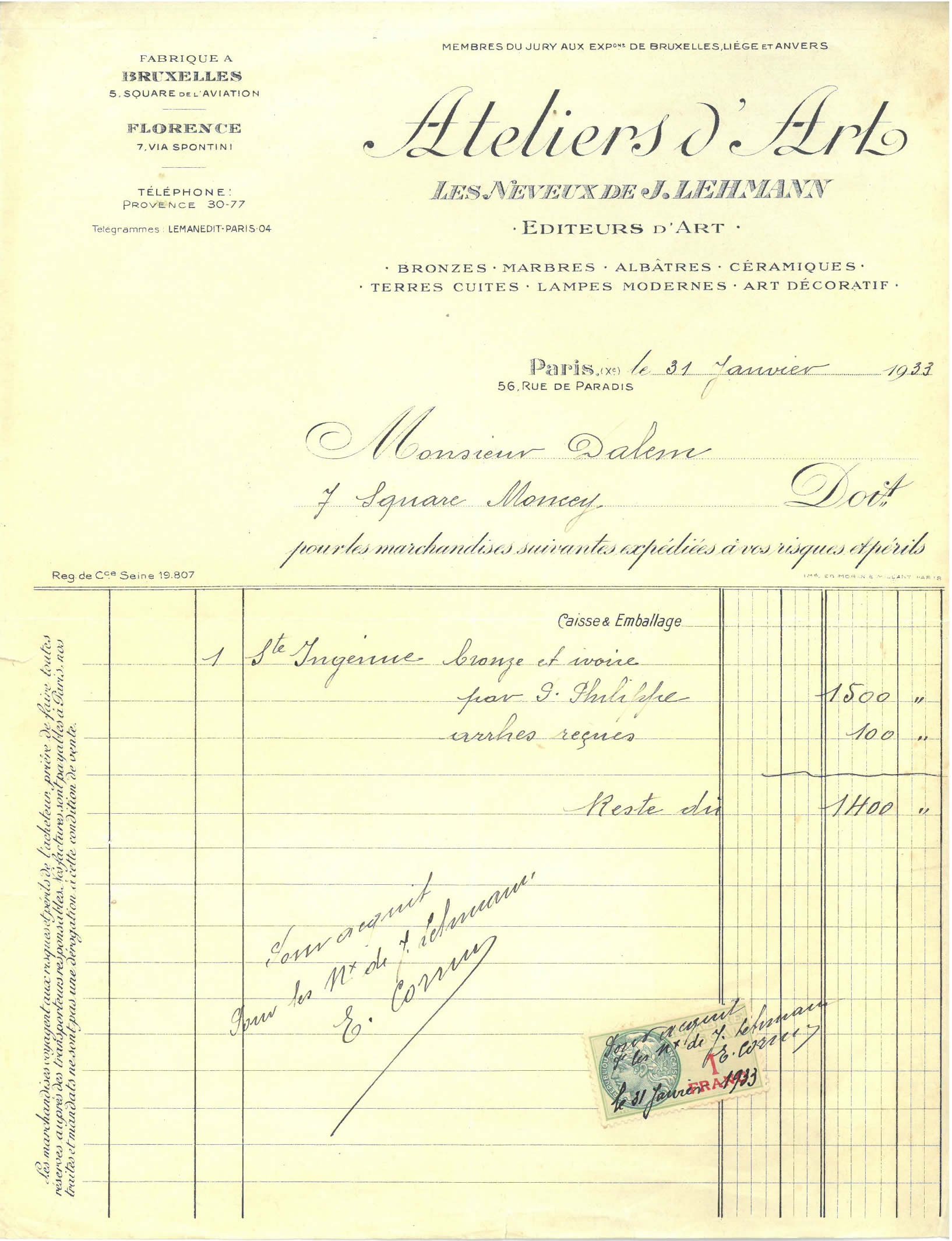 - copie jointe de la facture de 1.500 francs établie à Mr Dalem par Les Neveux de J. Lehmann le 31 janvier 1933.