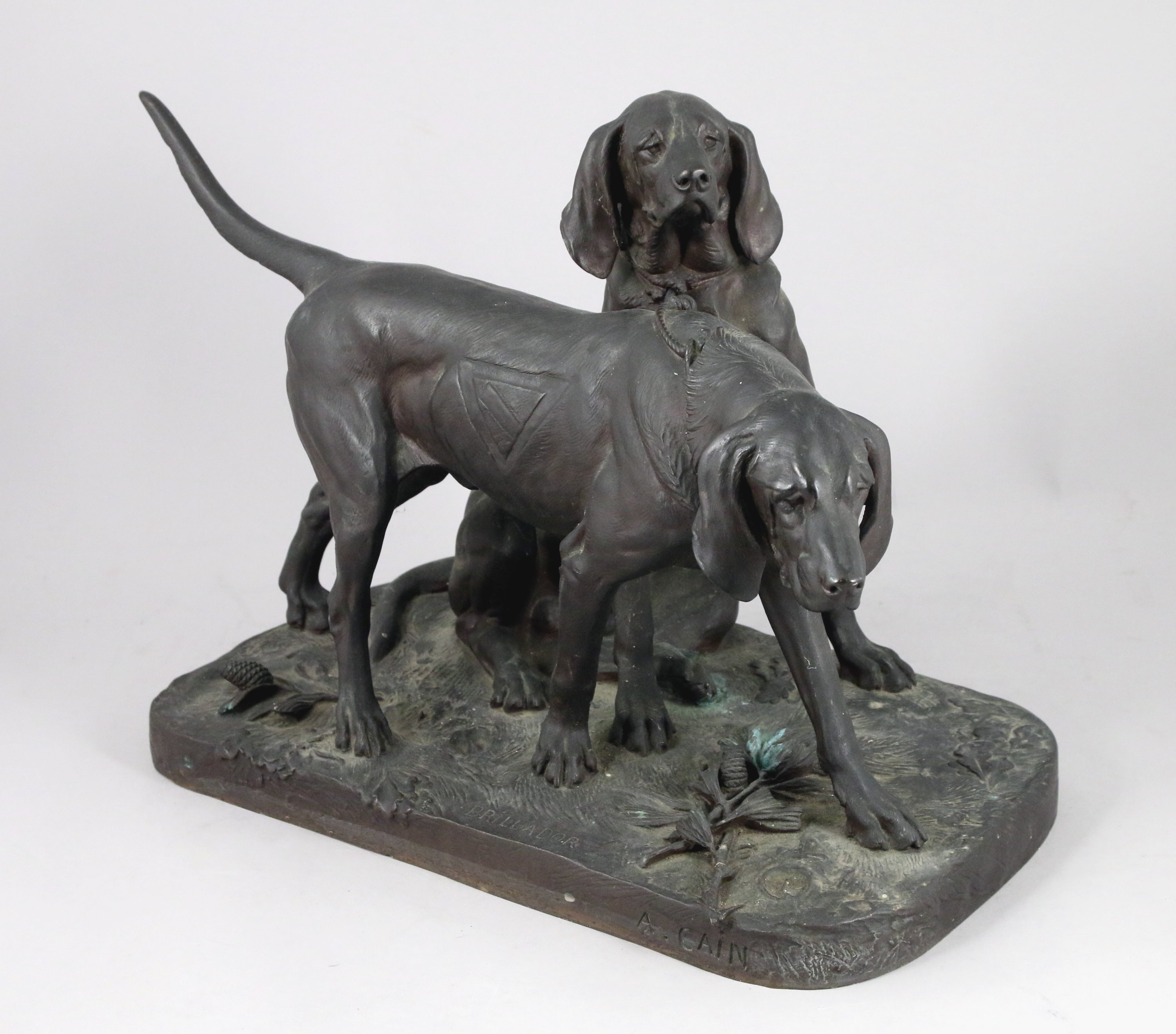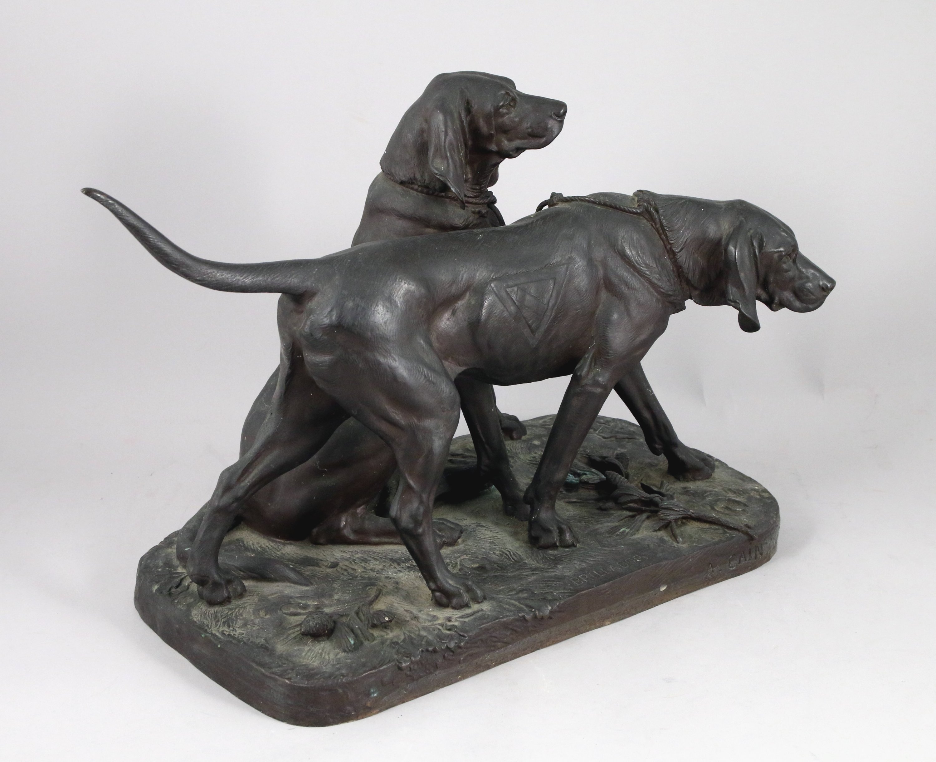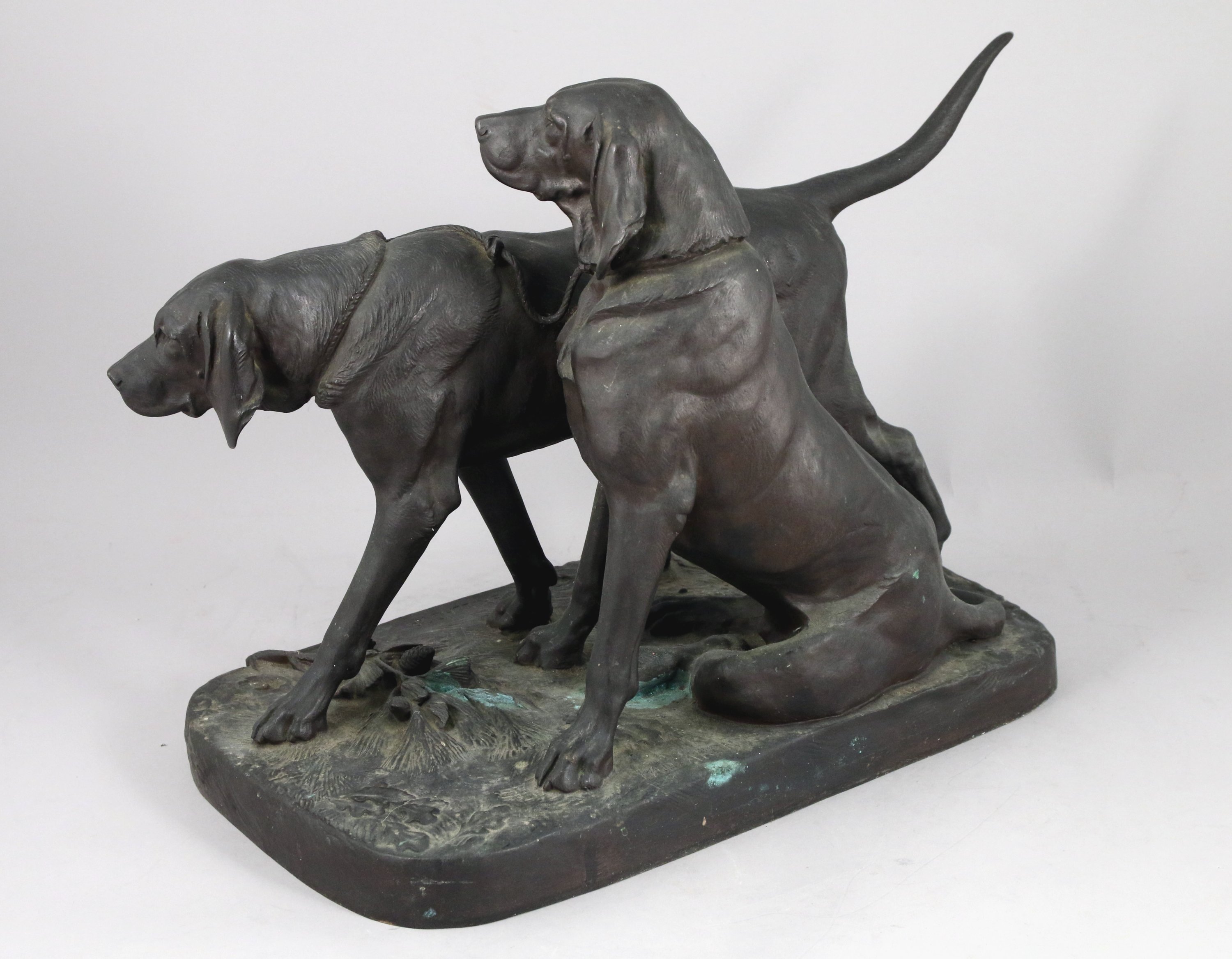 Épreuve en bronze à patine verte figurant deux chiens de meute ayant appartenu au Duc d'Aumale.