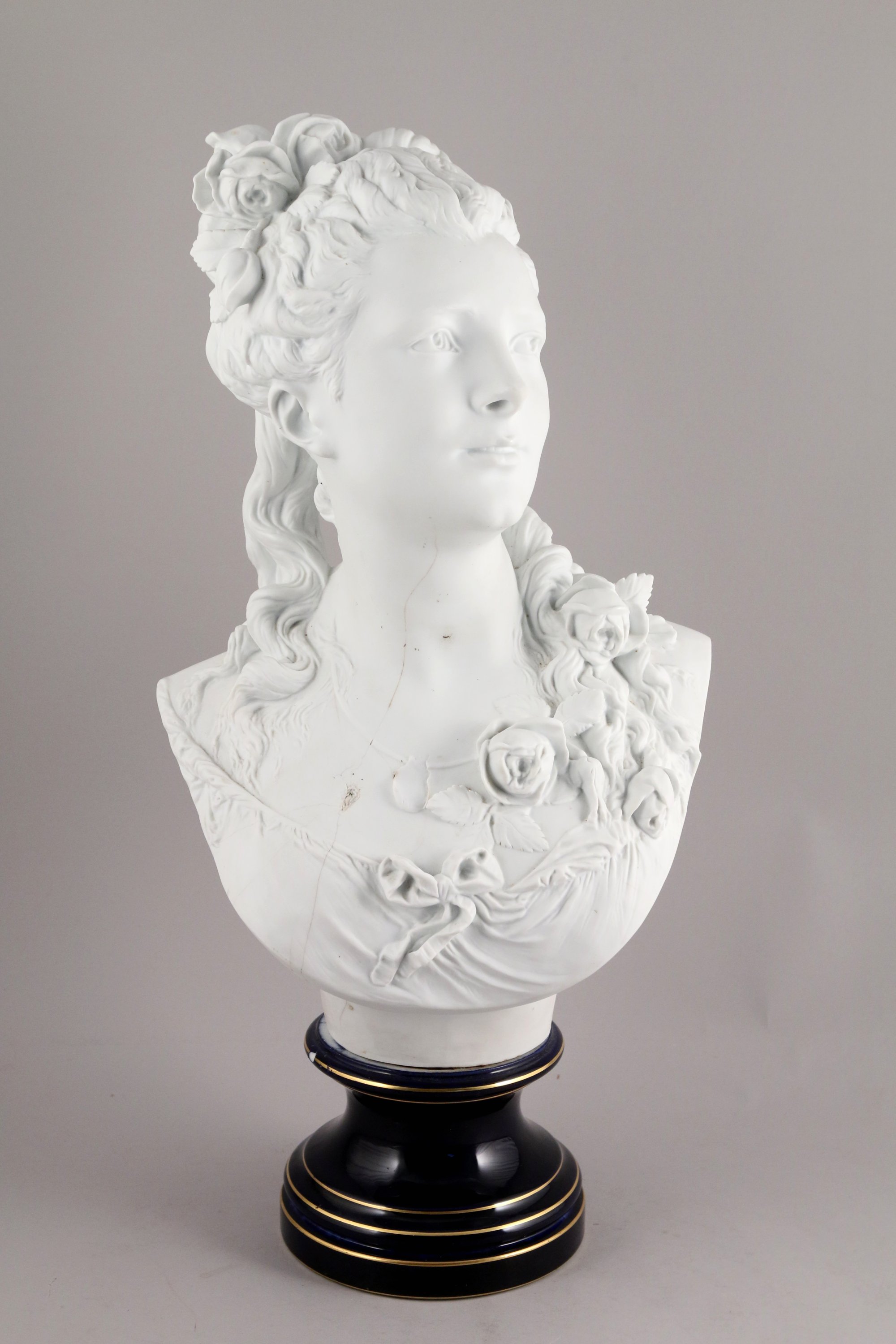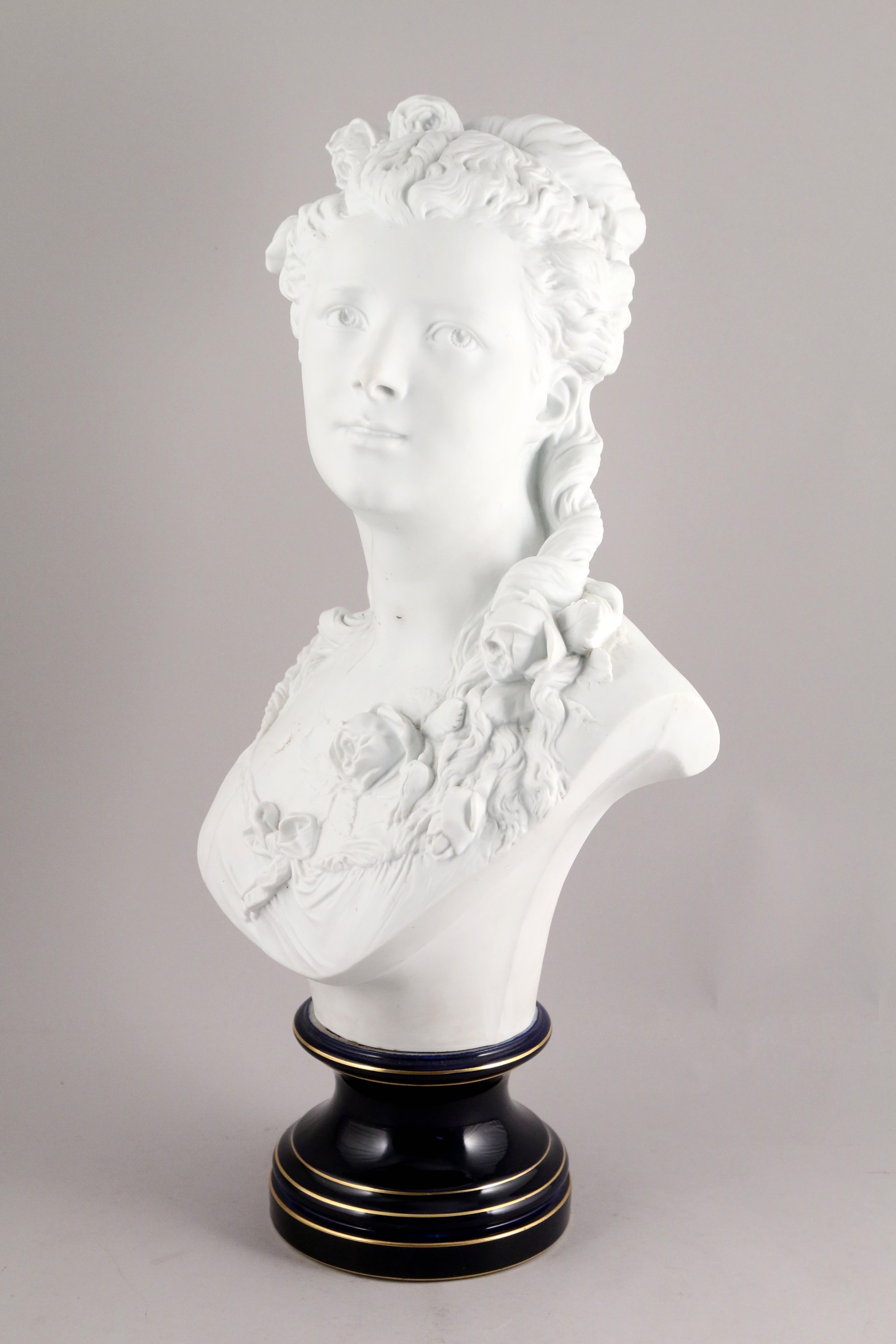 Biscuit sur un piédouche en porcelaine mouluré bleu souligné de filets or.