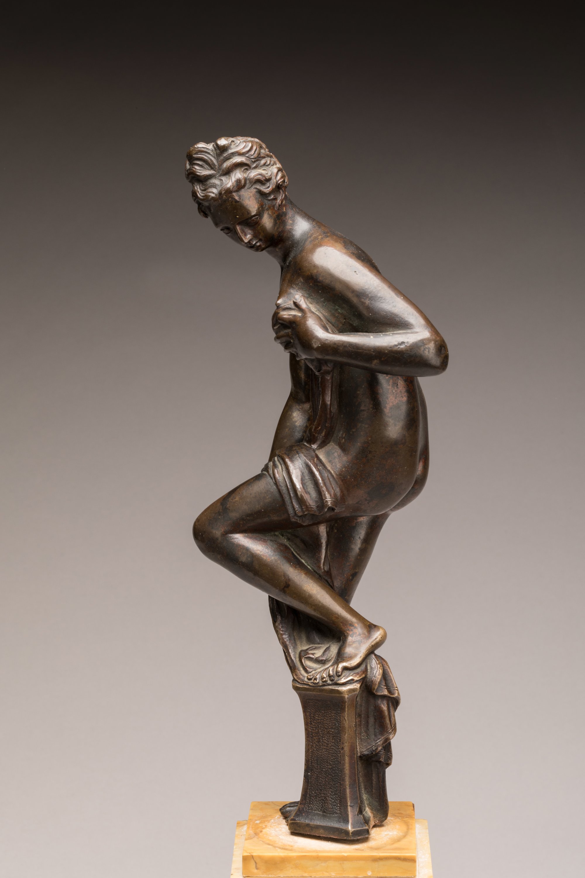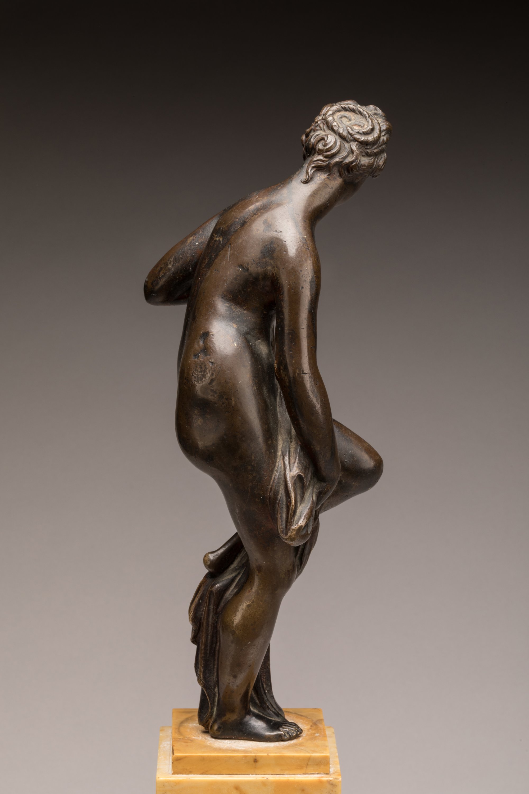 Par sa composition, cette Vénus au bain dérive de la statue monumentale de Jean Bologne, sa dernière oeuvre en marbre exécutée pour Giangiorgio II Cesarini, Marquis de Civitanova en avril 1583 (actuellement conservée au Palazzo Margherita, à Rome, actuellement ambassade des États-Unis). Ce marbre serait inspiré d'un modèle en cire utilisé pour la fonte d'une uvre signée qui est conservée au Kunsthistorisches Museum à Vienne, probablement exécutée vers 1564. Devenue l'une des plus célèbres compositions féminines de Jean Bologne, La Vénus Cesarini a été produite tout d'abord par Antonio et Gianfrancesco Susini avec de légères variations, puis par des générations d'artistes. Notre exemplaire est aussi à rapprocher d'une autre uvre du même artiste, la Petite Vénus au bain. On relève en effet la présence d'un seul drapé qu'elle presse sur le sein gauche, au lieu de deux dans la version originale. Le linge tombe ensuite le long de son flanc, faisant un retour sur sa cuisse gauche. Outre le drapé unique, un certain nombre de détails, comme la dimension légèrement réduite (25 cm au lieu de 33 cm) ou l'absence de socle circulaire, font supposer une fonte plus tardive d'un atelier italien, à l'instar des versions de 25,7 cm de haut de Massimiliano Soldani-Benzi (1656-1740). Notre statuette présente une fonte soignée dont la patine mordorée est vraisemblablement assombrie au XIXe siècle.