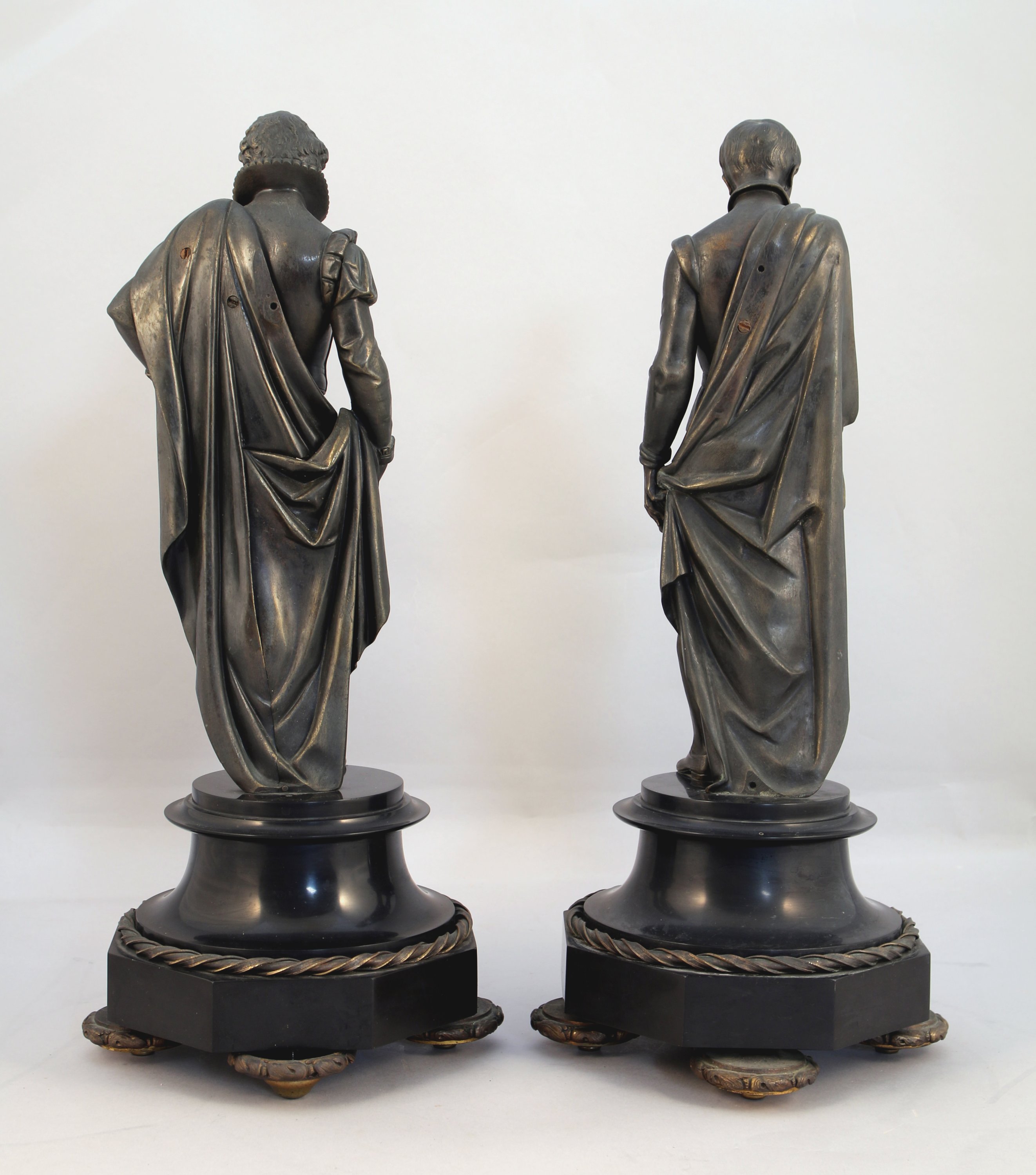L'élément central dans le lequel s'intègre le cadran signé Destouches, figure Michel de l'Hospital, chancelier du royaume, tenant un livre sur lequel figure l'inscription "Edit d'Amboise 1560". Signé. Les deux autres personnages représentent très probablement Henri Ier de Bourbon, prince de Condé et François Ier de Lorraine, duc de Guise. Base en cavet renversé pour la pendule, et en piédouche pour les personnages, reposant sur quatre pieds galette.