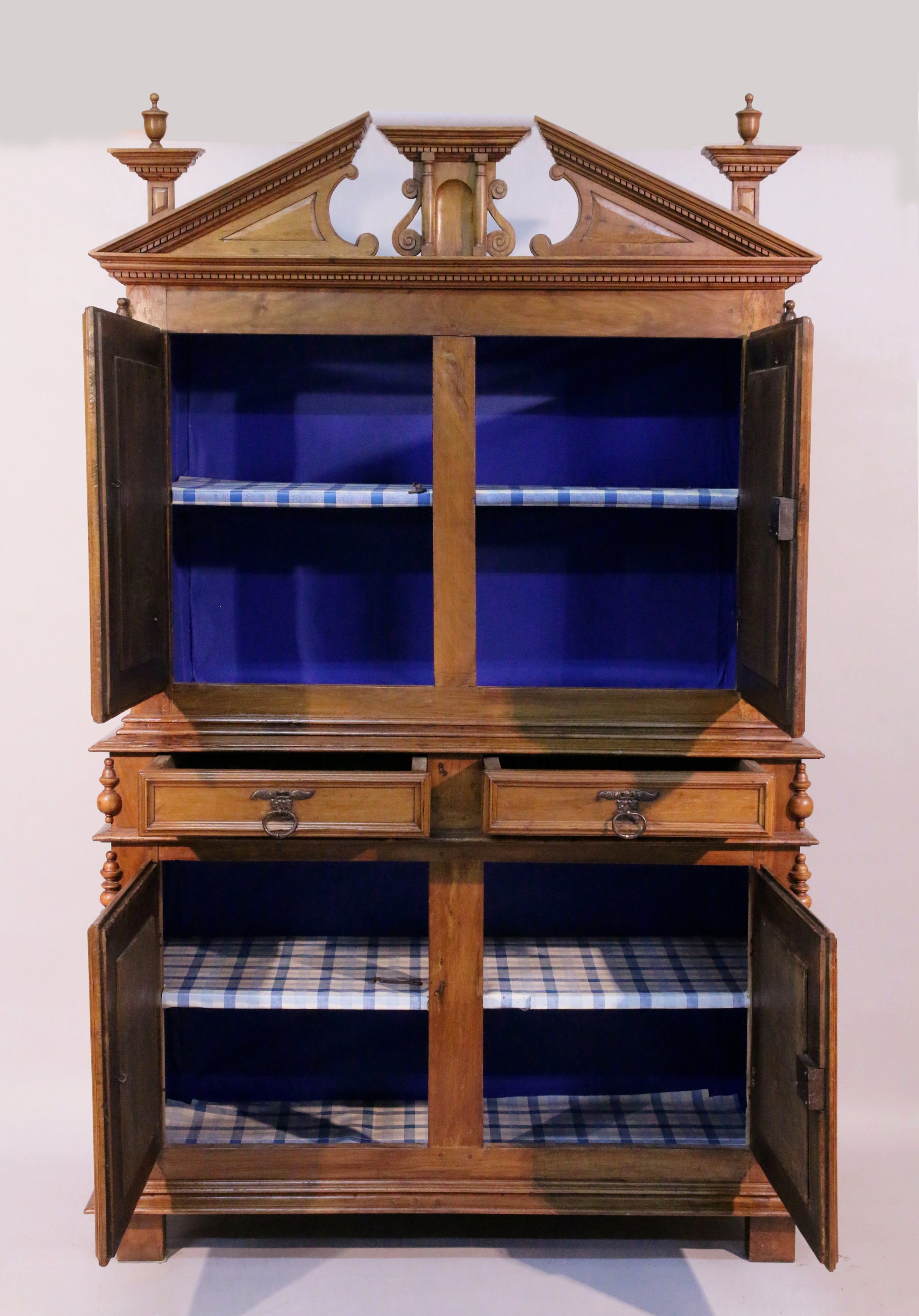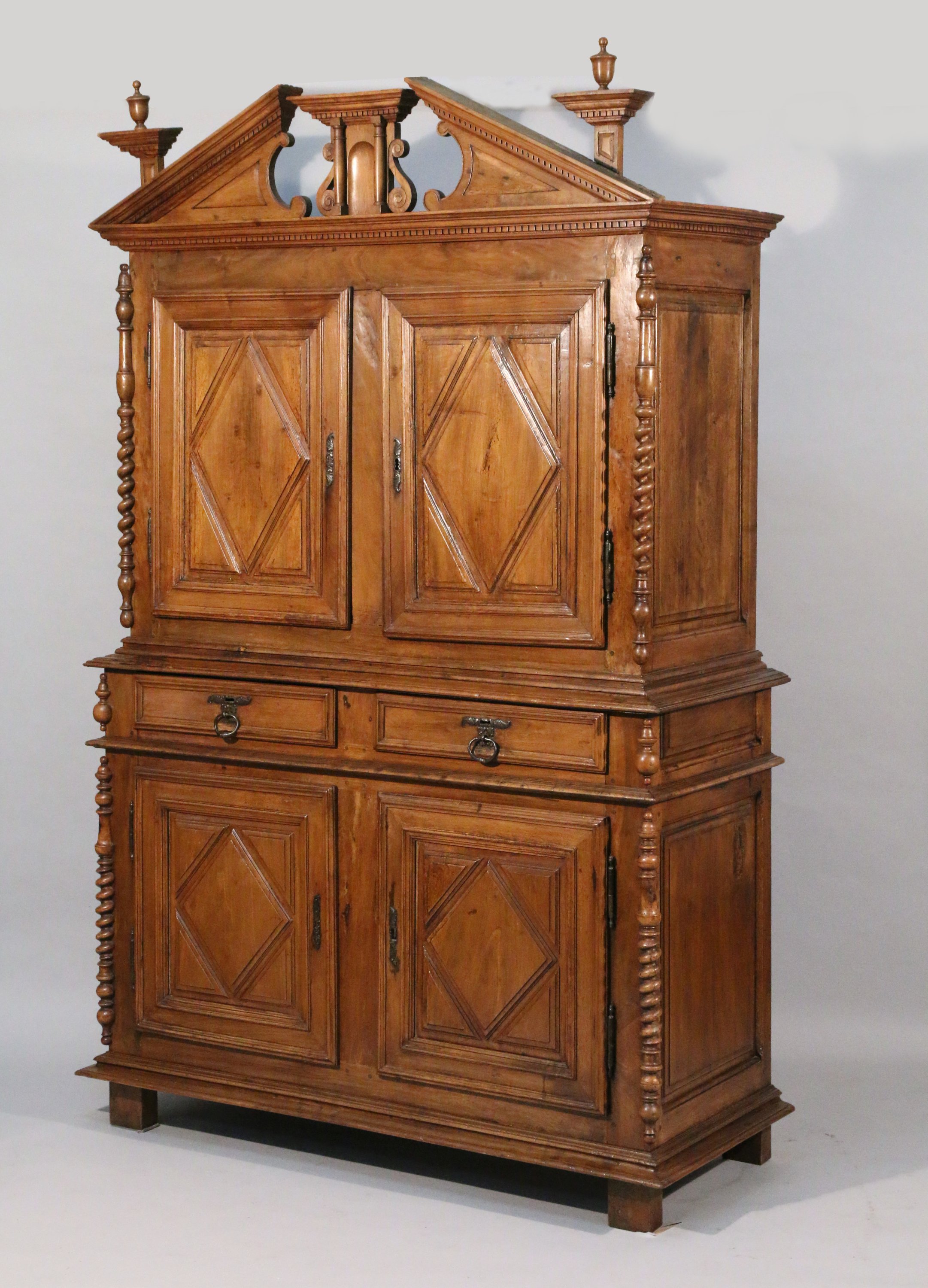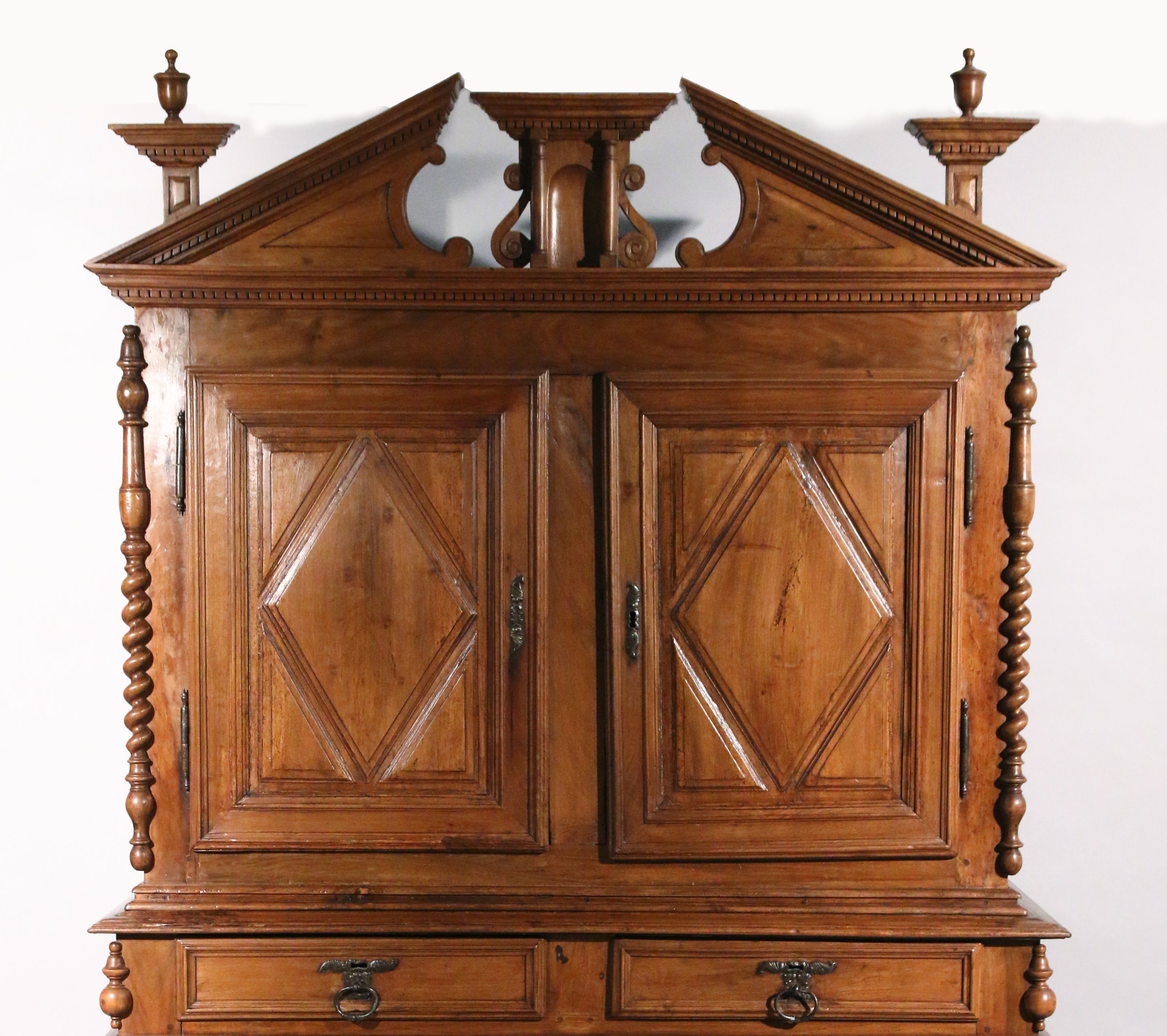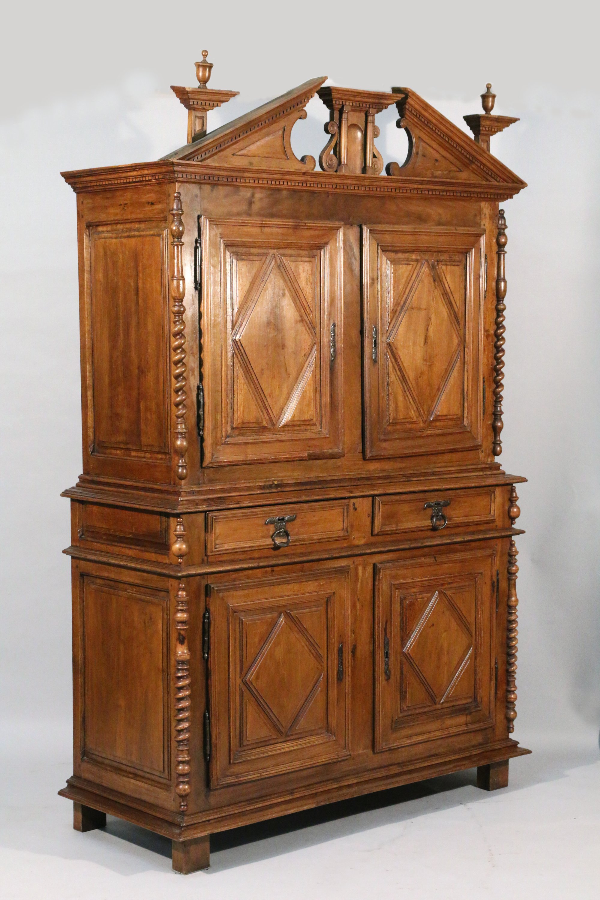 la partie basse ouvre par deux portes sculptées de losanges, et deux tiroirs. La partie haute à deux portes. Le meuble est flanqué de colonnes torses.