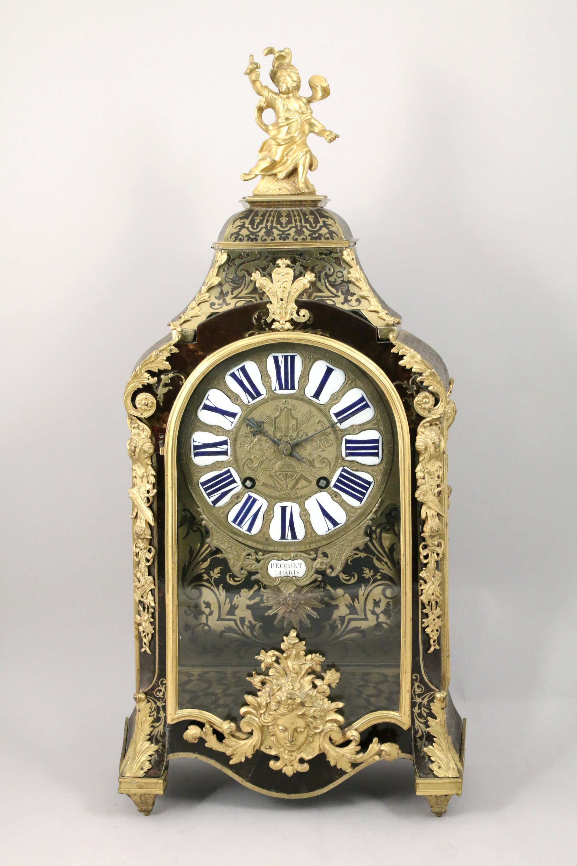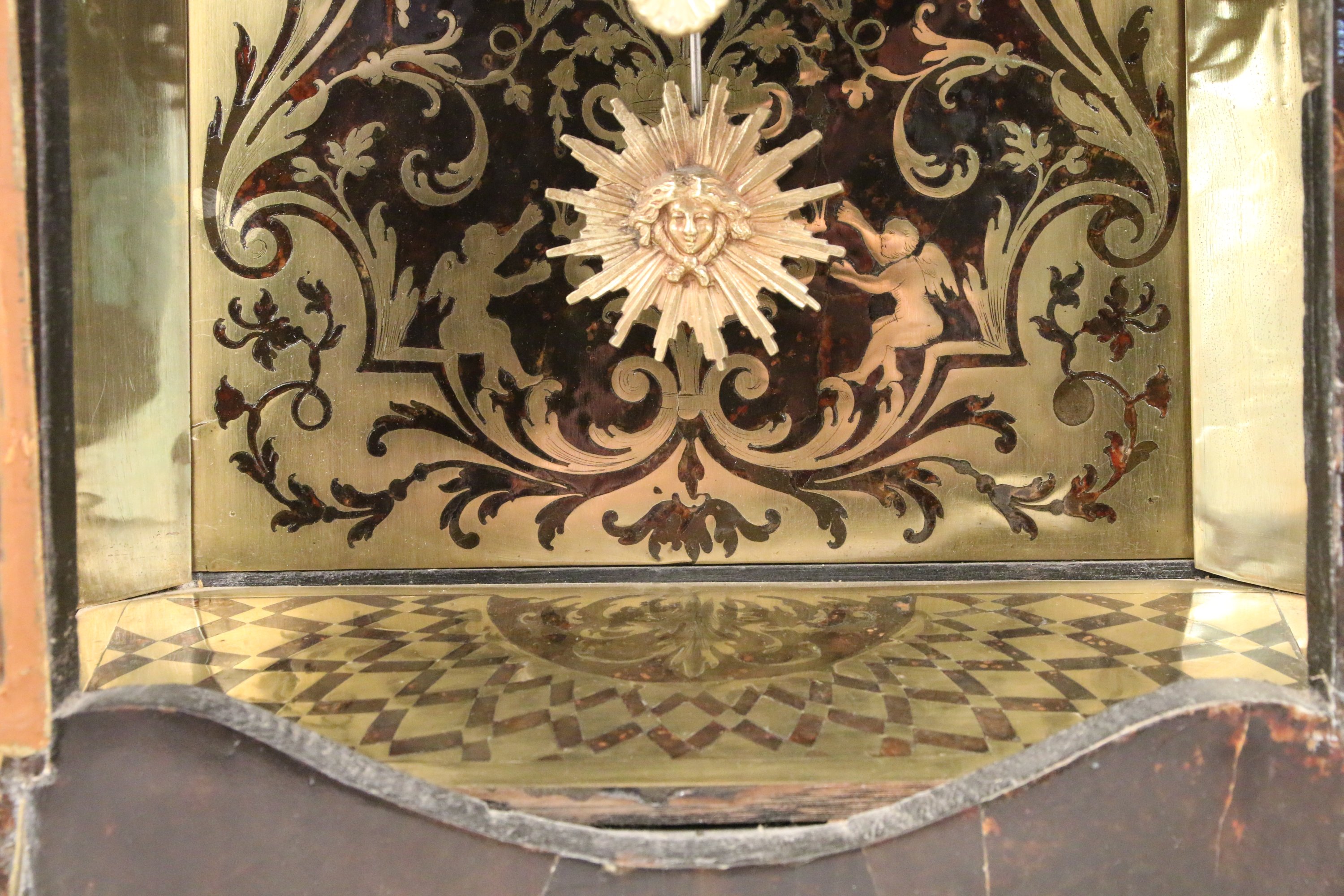 en marqueterie dite "Boulle". Plaque de cadran en bronze ciselé au décor de carquois croisés en retrait d'une lyre. Les heures en chiffres romains sur des plaques émaillées, chiffres arabes pour les minutes. Mouvement rectangulaire deux barillets, la suspension transformée en suspension à lames, roue de compte, sonnerie sur timbre.Caisse en marqueterie de laiton doré sur fond d'écaille. Ornée en partie inférieure d'une figure à l'effigie de Louis XIV sous les traits d'Apollon en bronze doré. L'amortissement surmonté d'un putto tenant une colombe.Elle repose sur quatre pieds feuillagés.