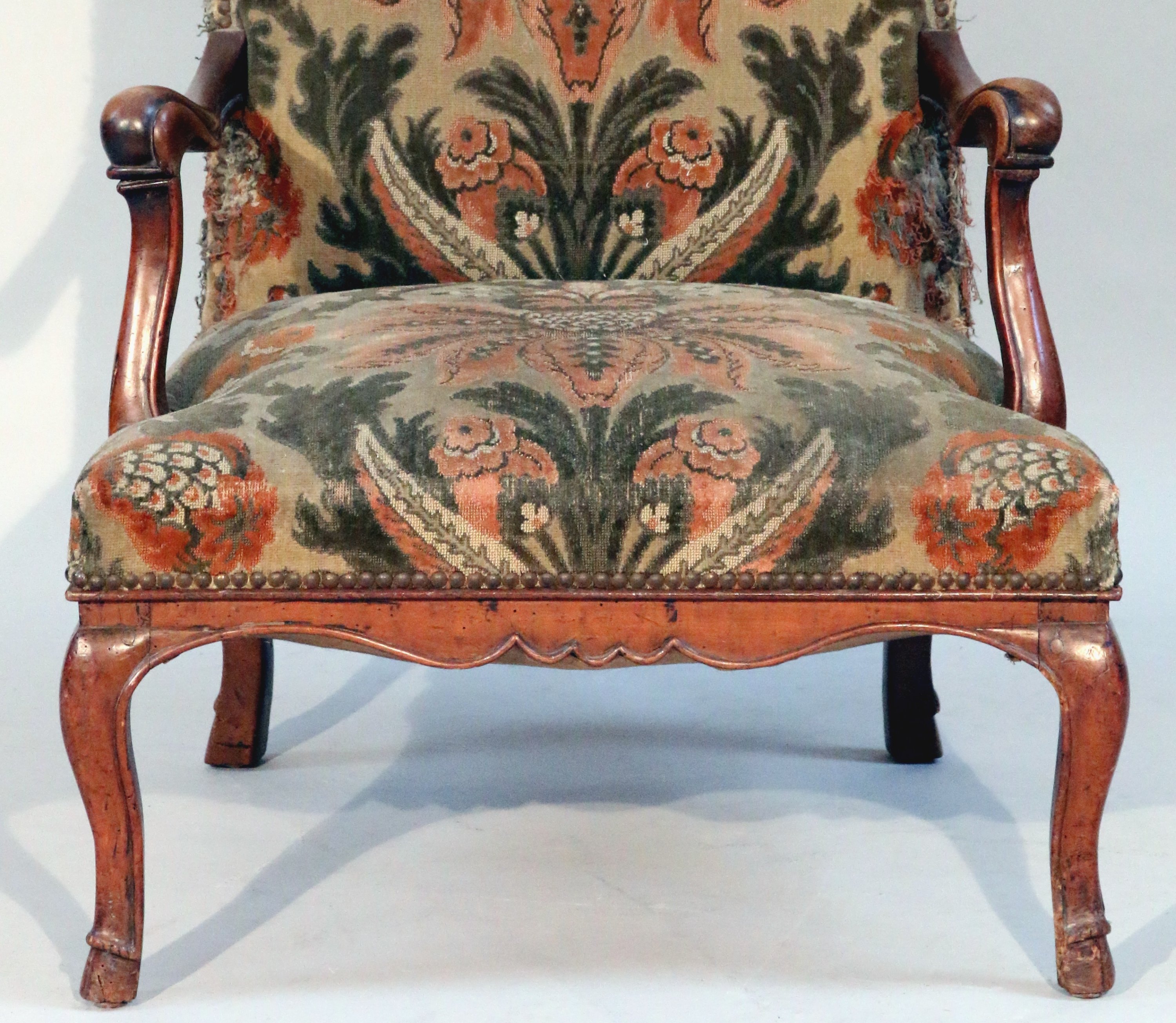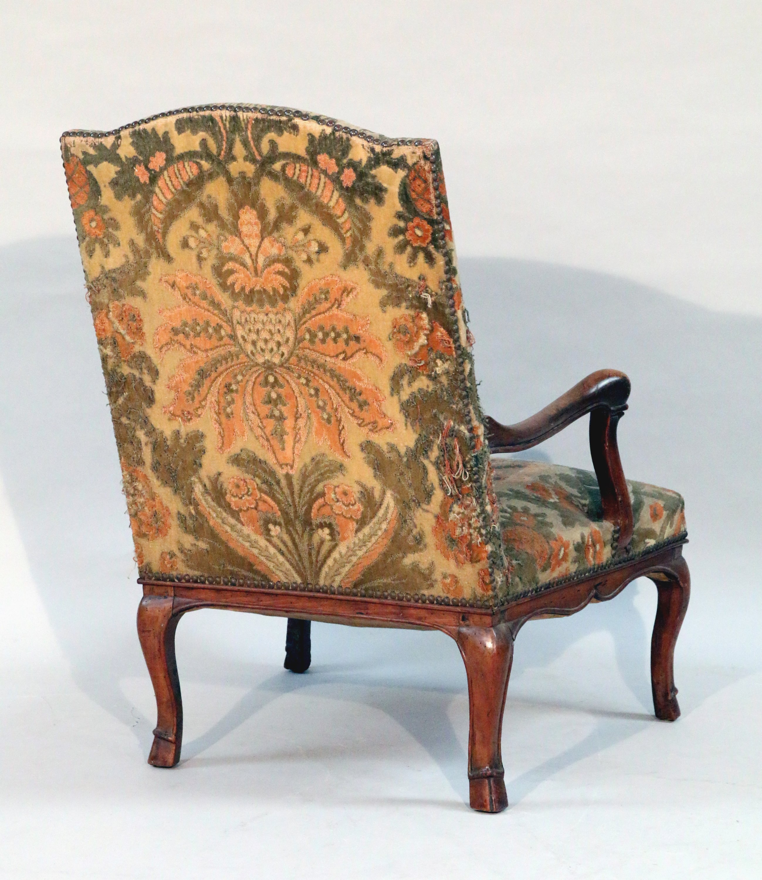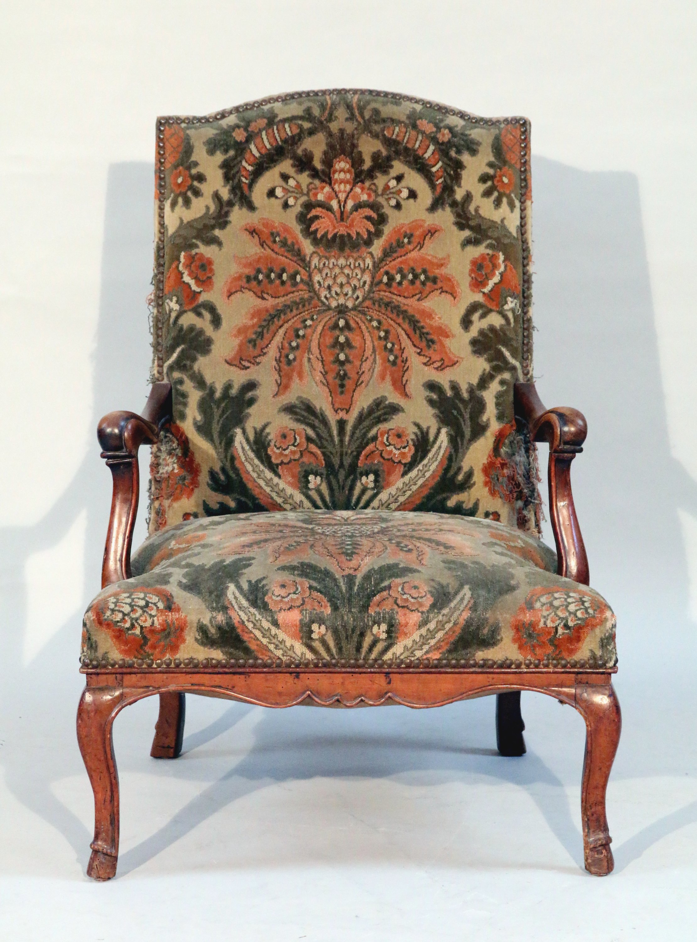 en bois naturel mouluré à dossier droit, les accotoirs légèrement cintrés, les consoles mouvementés, la ceinture chantournée. Il repose sur qutre pieds cambrés à sabots de biche. Garniture à motif floral.