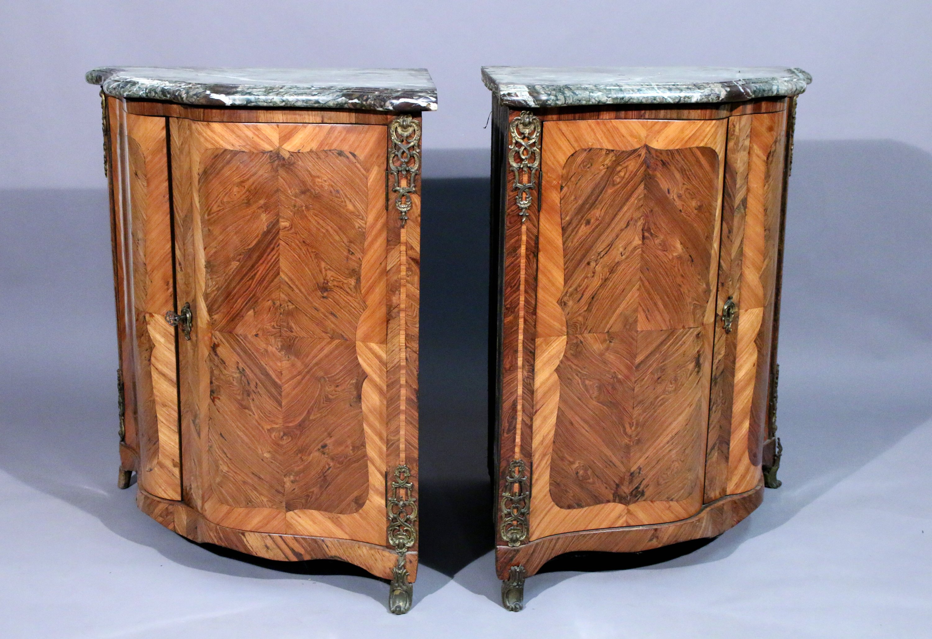 en placage de bois exotique et ronce sur bâti de chêne. A la forme galbée, elles reposent sur deux pieds avant ornée de sabots en bronze doré et d'un pied arrière. Les meubles ouvrent par deux portes découvrant deux étagères épousant la forme mouvementée des encoignures. Chutes d'angles et entrées de serrures en bronze doré.