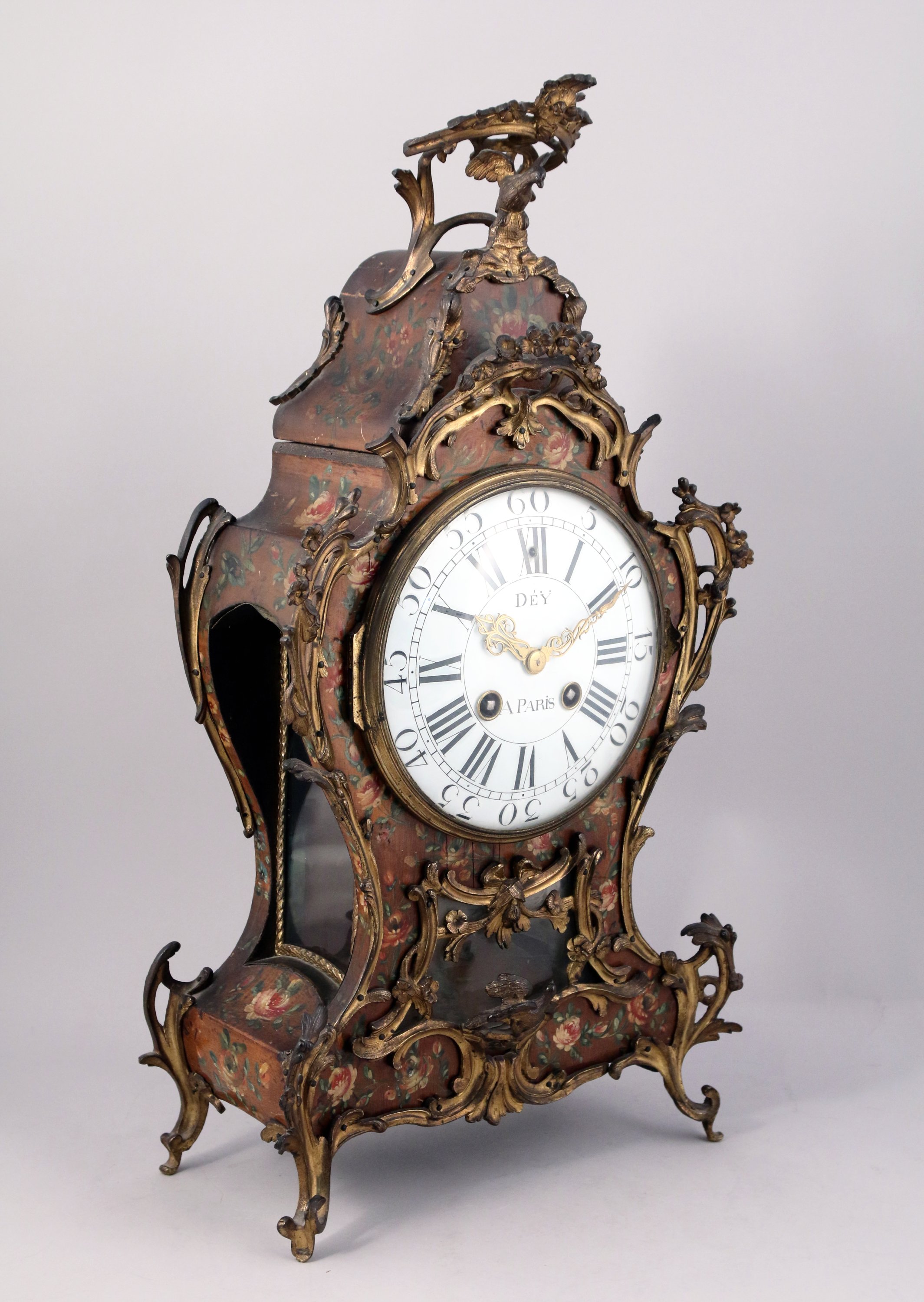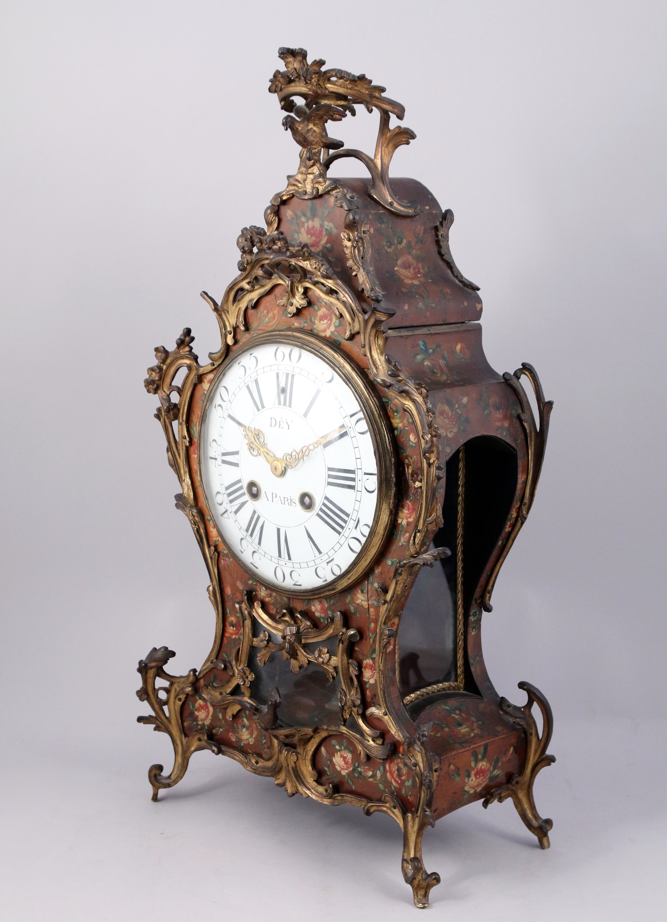 Le cadran émaillé signé "Dey à Paris", les heures indiquées par des chiffres romains et arabes, les minutes par des bâtonnets, les aiguilles en forme de rinceaux. Dey, maître horloger, reçu en 1745.