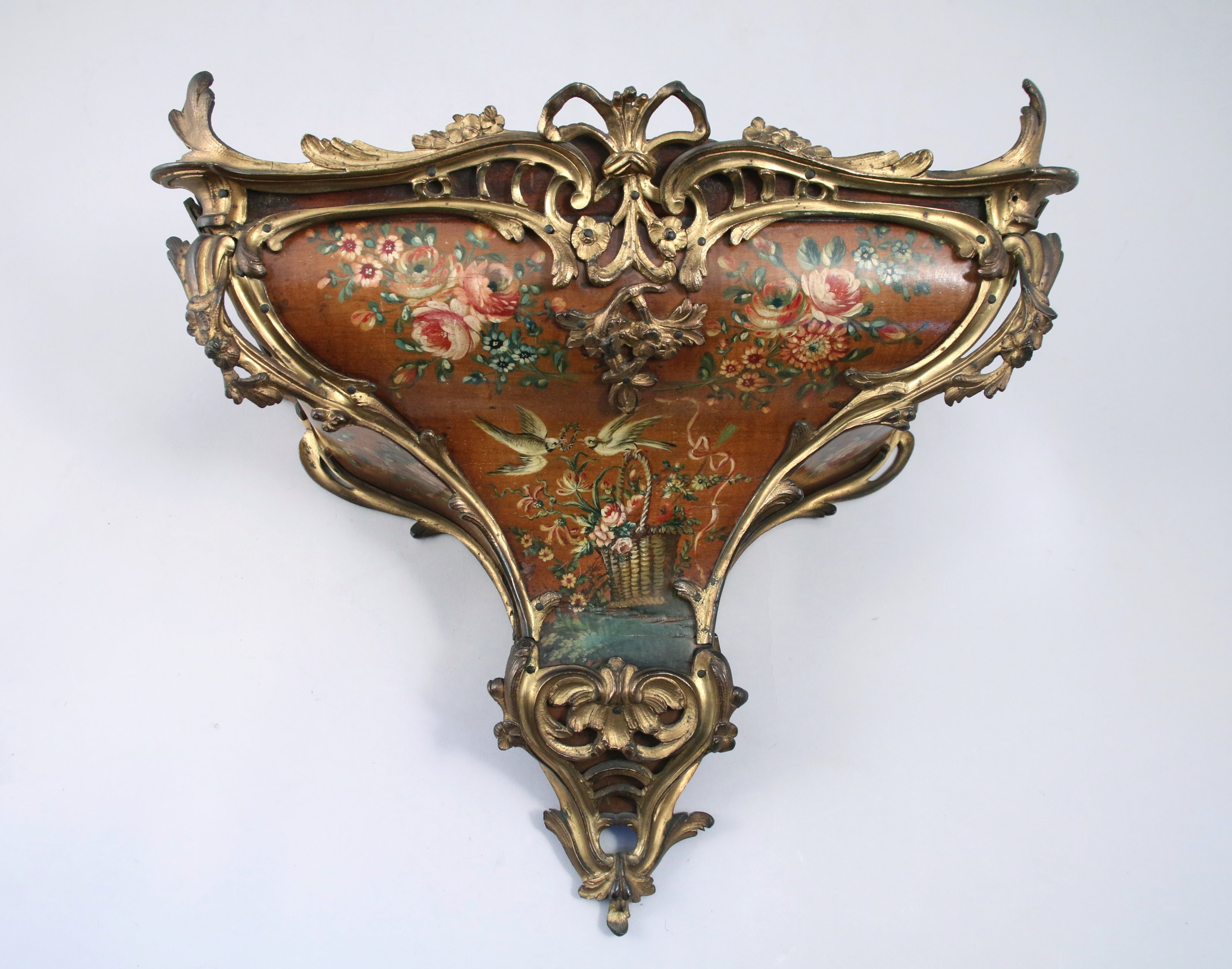 en vernis genre Martin à fond orangé représentant notamment des bouquets de fleurs et une colombe en vol donnant à une autre posée sur l'anse d'un panier une couronne végétale. Riche ornementation de bronze, un oiseau aux ailes dépolyées coiffant l'ensemble, des motifs de feuilles stylisées, guirlandes fleuries et agraffes venant entourer la caisse pour descendre sur le cul de lampe.
