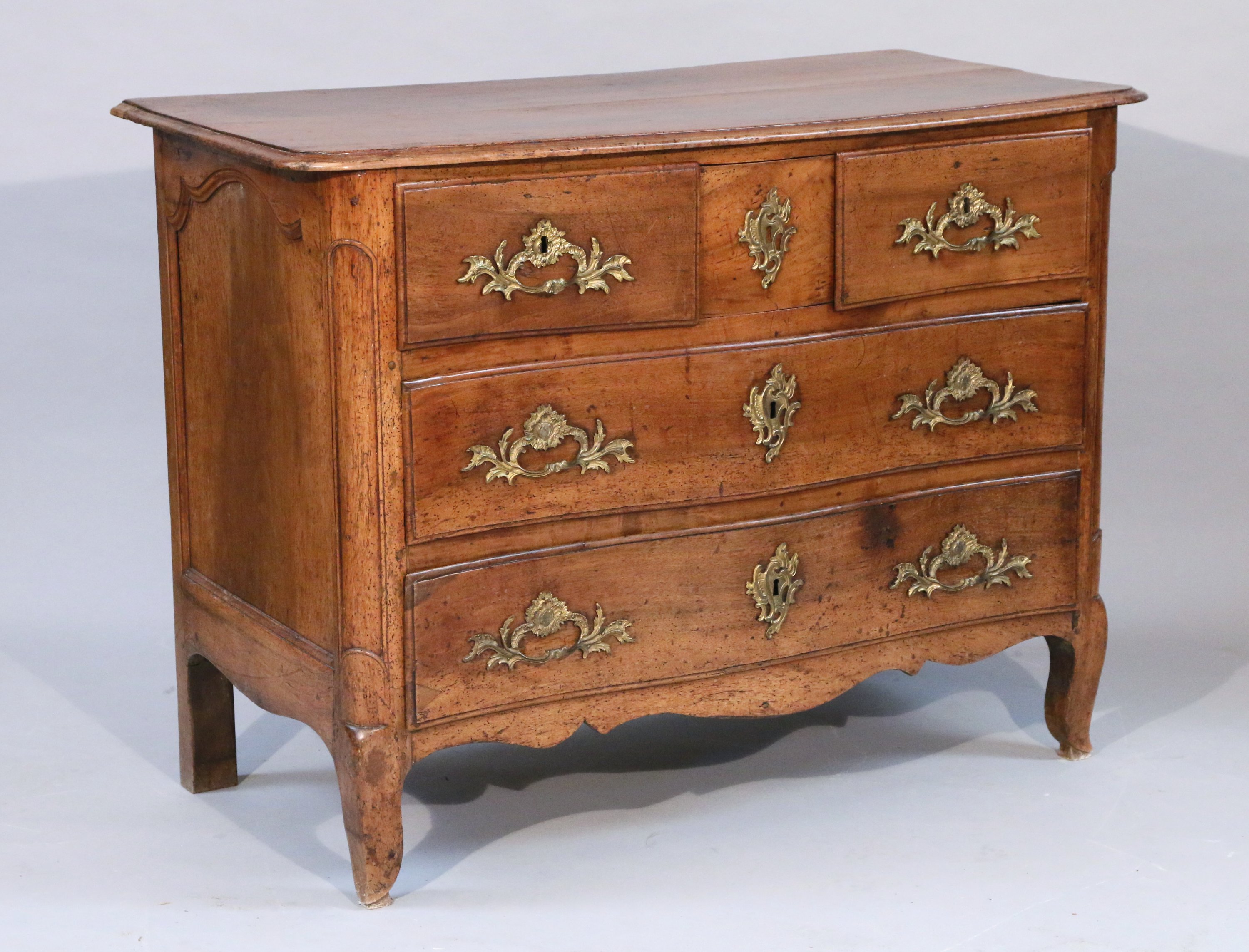 en noyer ouvrant par cinq tiroirs dont un secret sur trois rang à décor mouluré. Reposant sur des pieds antérieurs cambrés et postérieurs droits. Belle garniture rapportée de bronzes dorés comme entrées de serrure et poignées fixes à décor végétal et d'agrafes.
