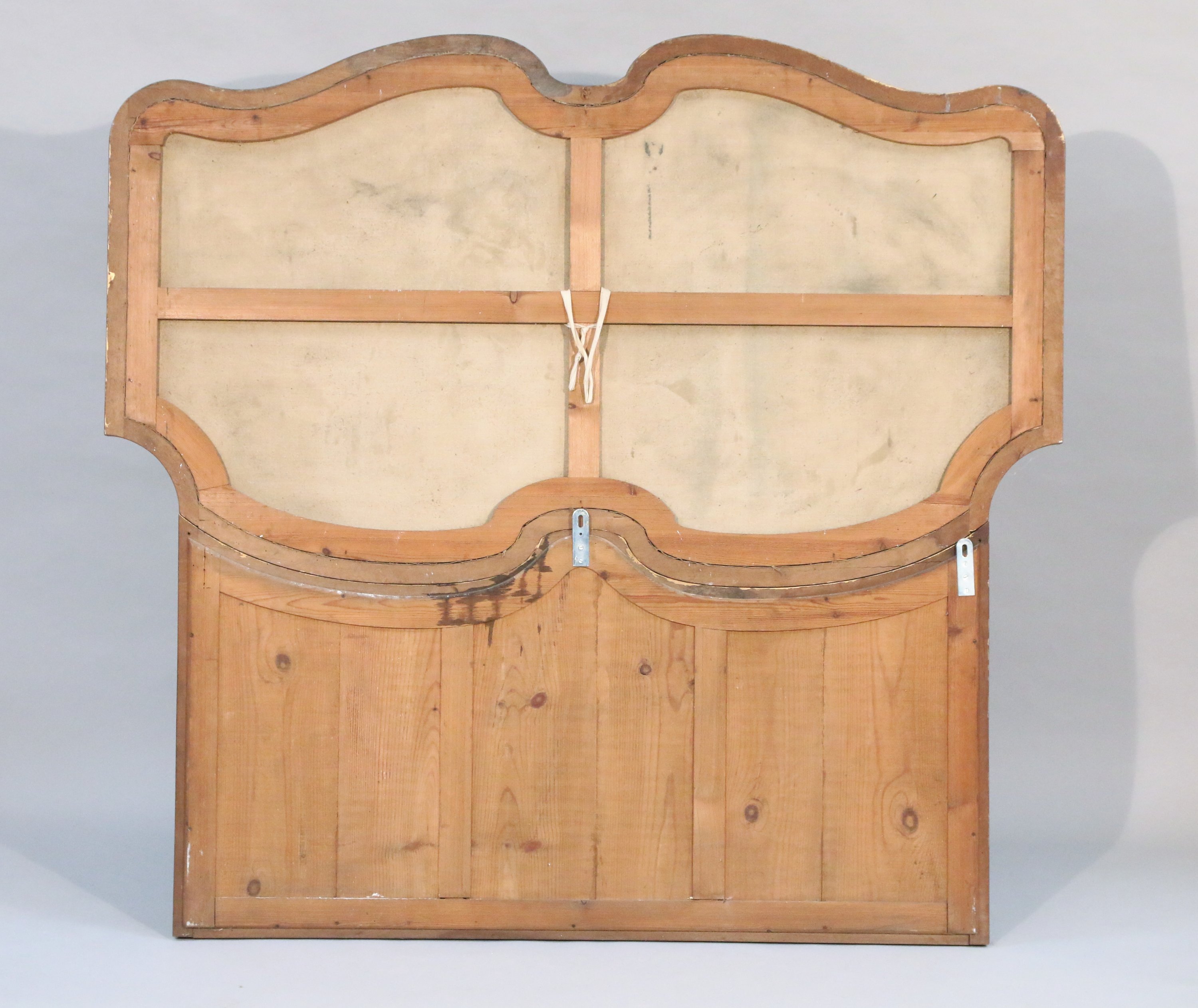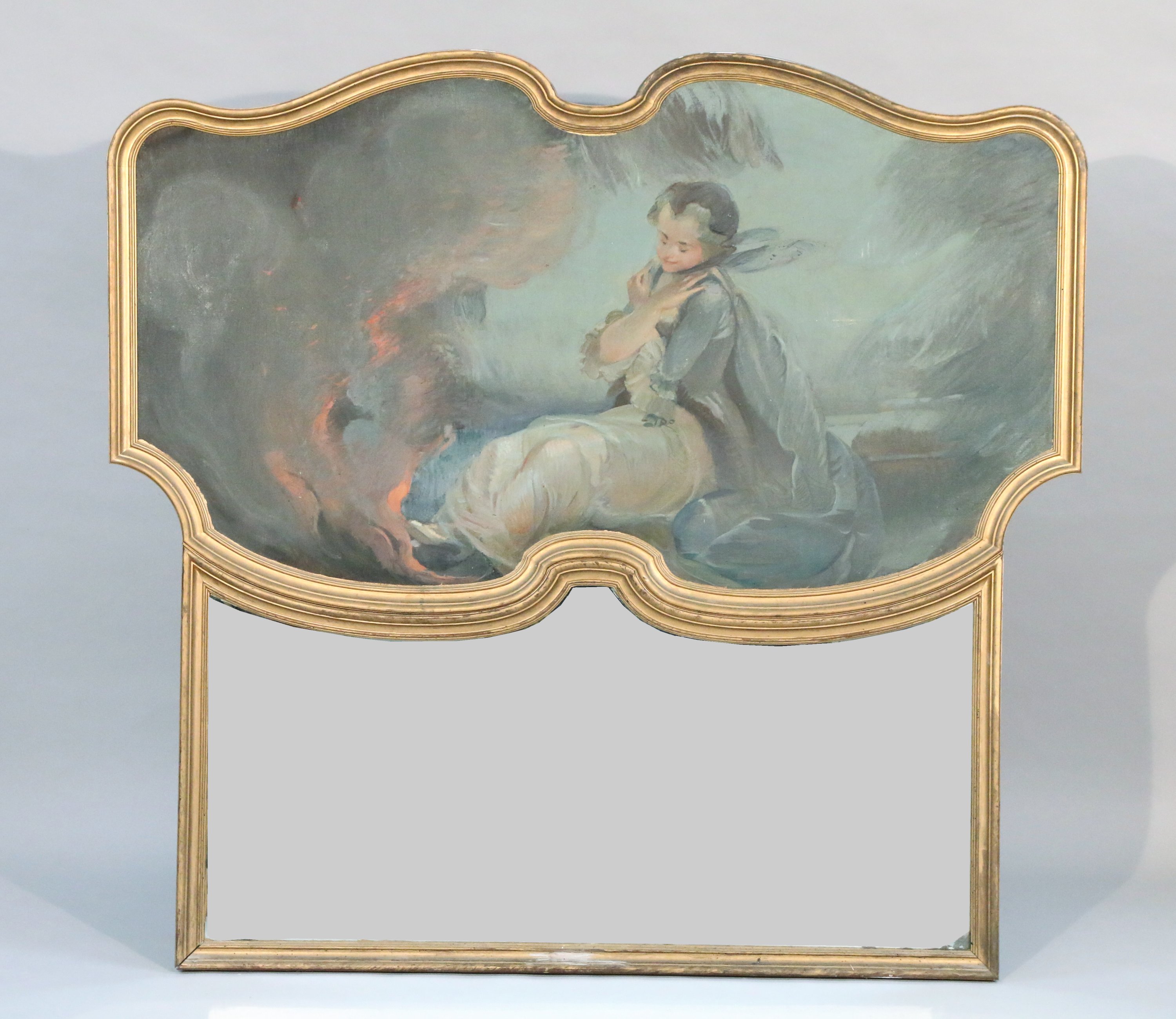 en bois doré et mouluré de forme chantourné. En deux partie, la partie supérieure agrémentée d'une toile peinte représentant une femme se réchauffant près d'un feu.