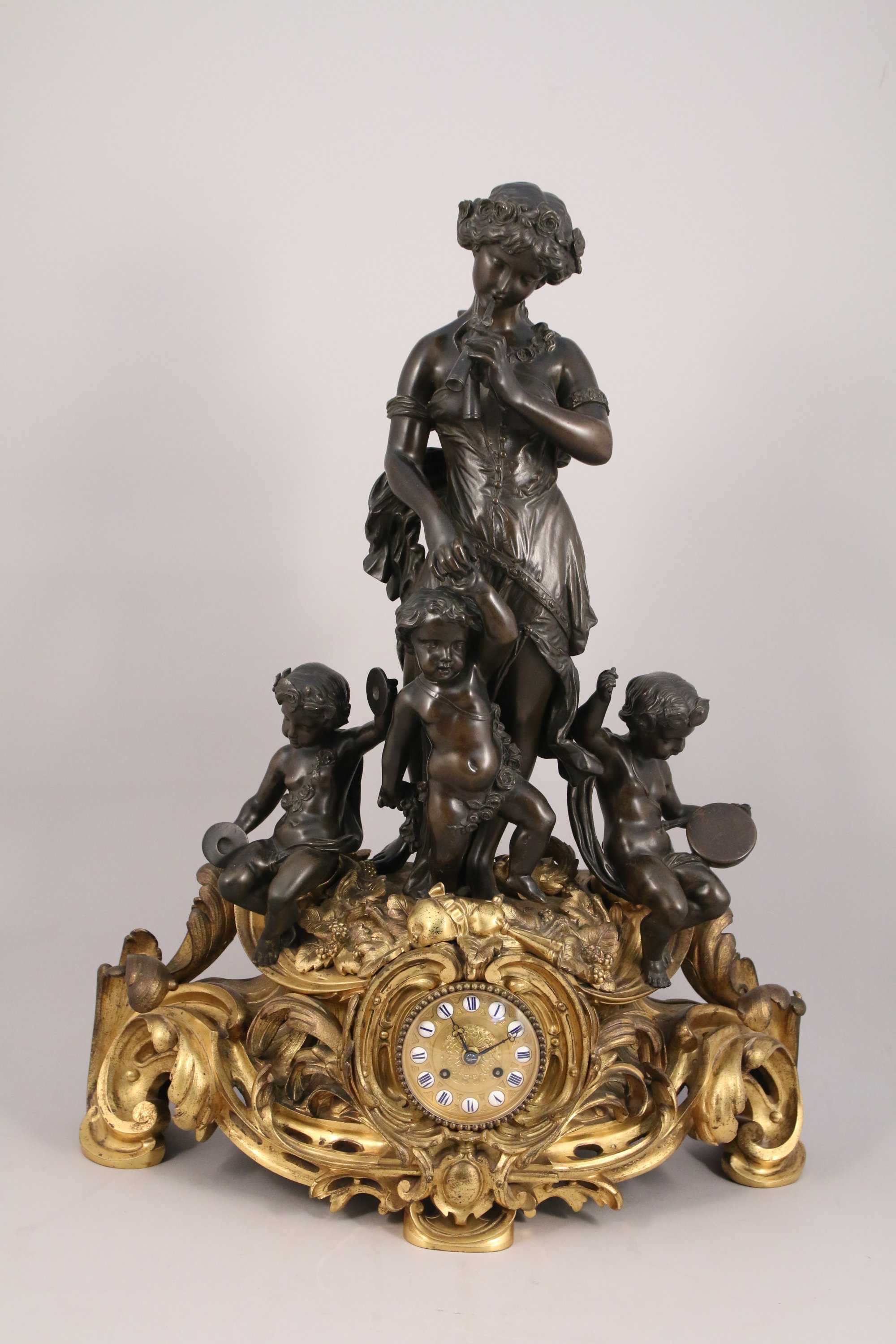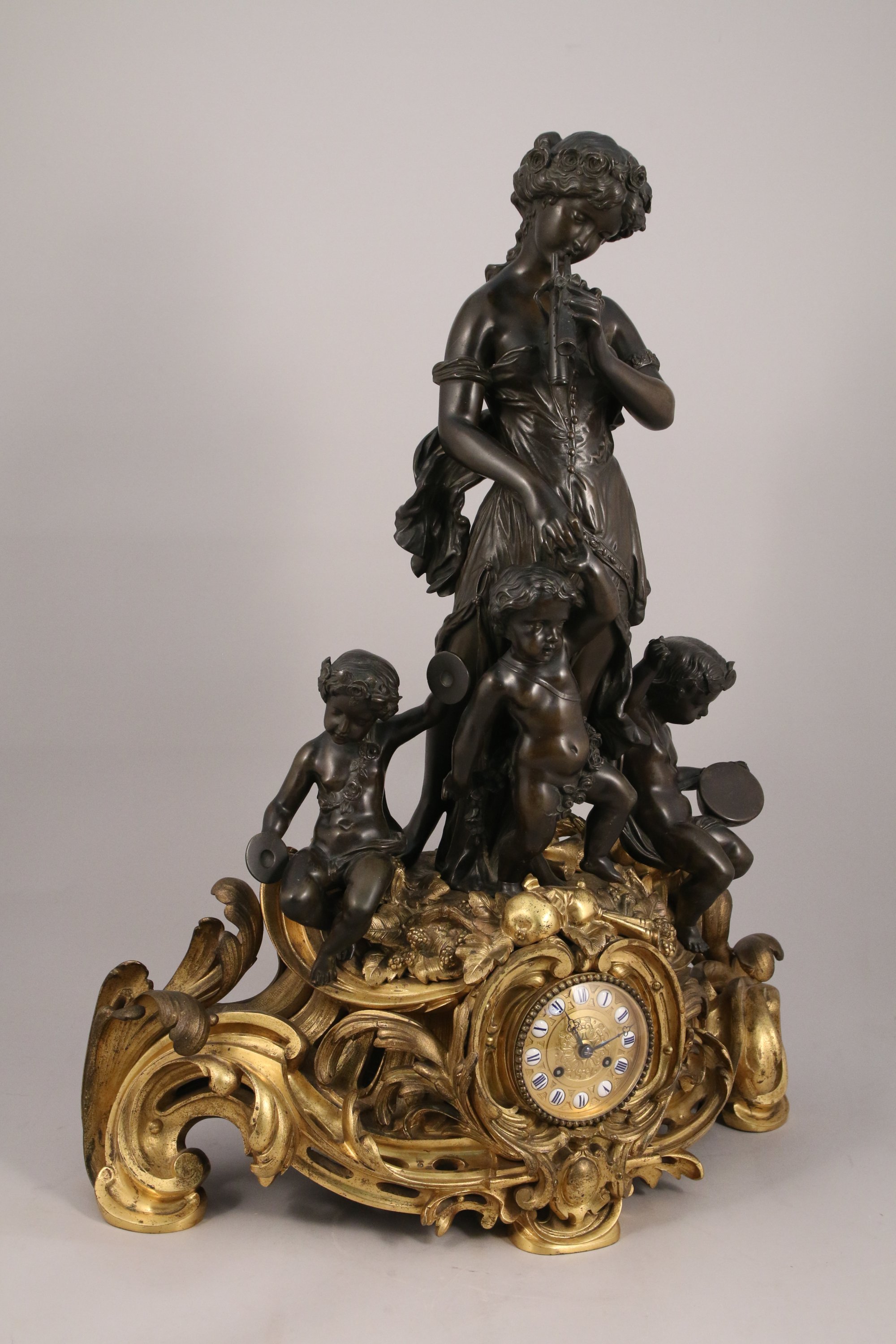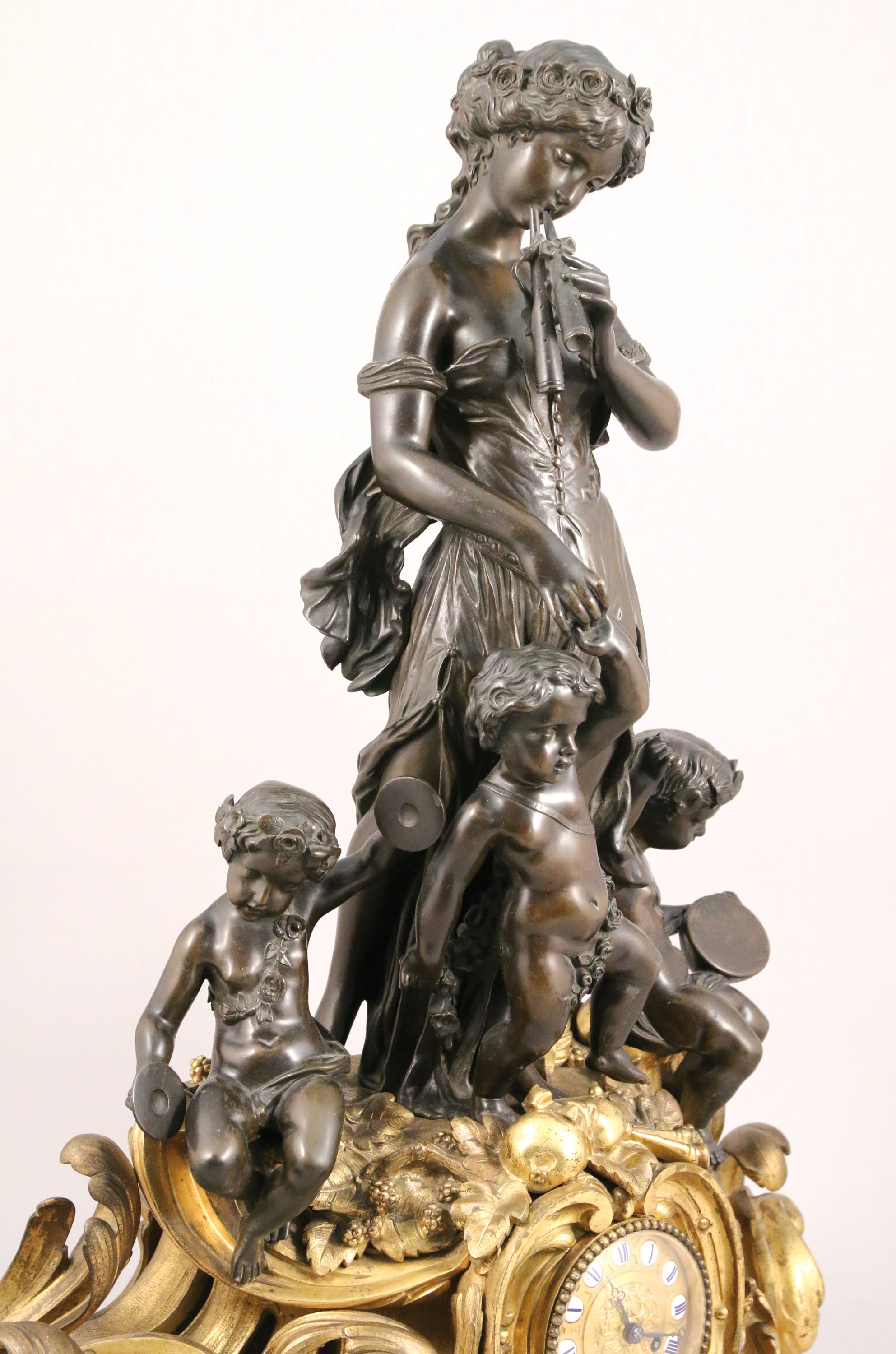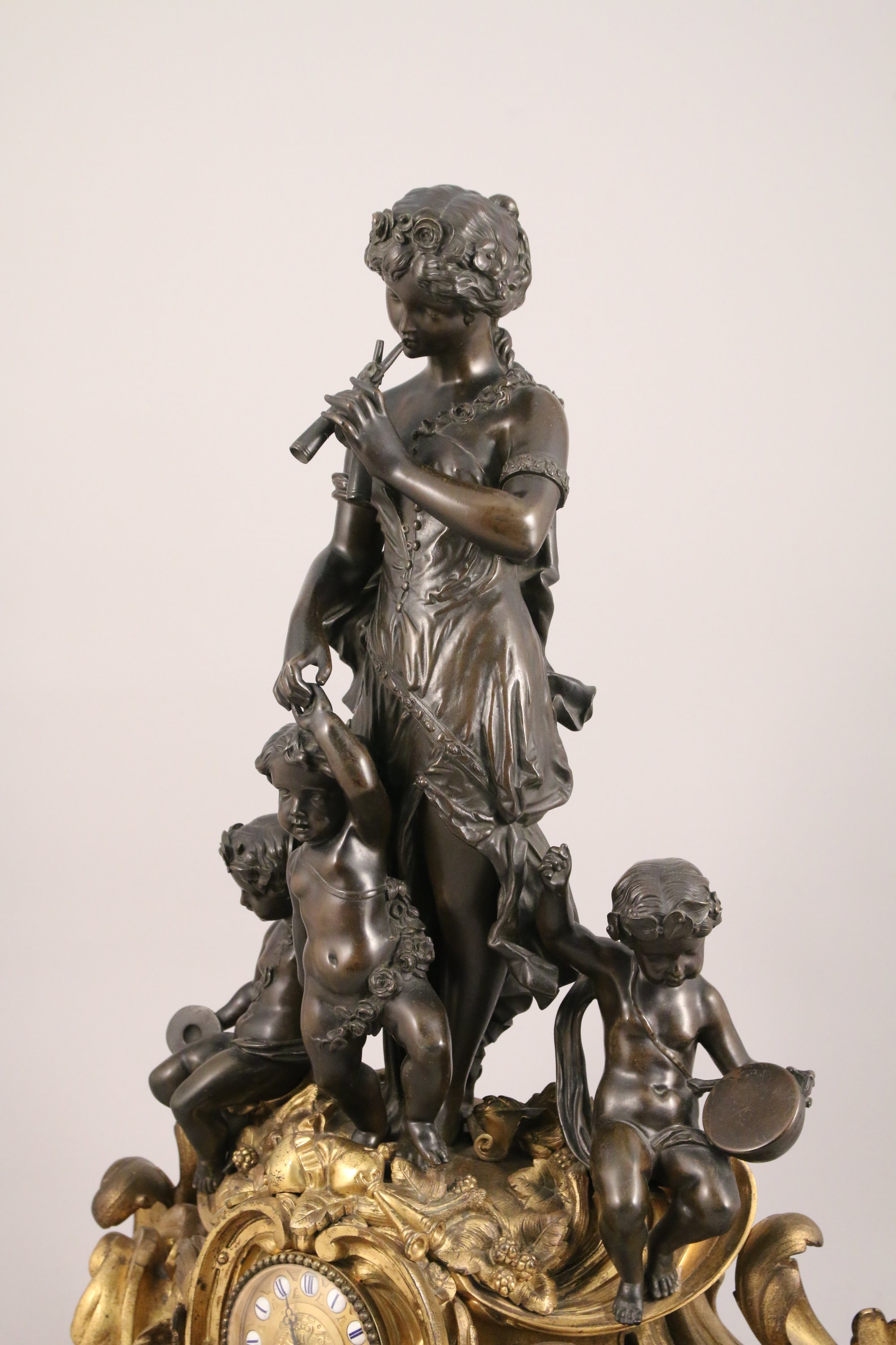 ornée d'un groupe en bronze ciselé et patiné figurant une joueuse d'aulos tenant par la main un putto à la guirlande fleurie, flanqués de deux putti musiciens aux cymbales et au tambourin. Ces sculptures en ronde-bosse reposent sur un socle en bronze doré richement sculpté et ajouré d'enroulements rocailles. Son décor d'instruments de musique, de baies et de guirlande répond à la l'iconographie de ses sujets.