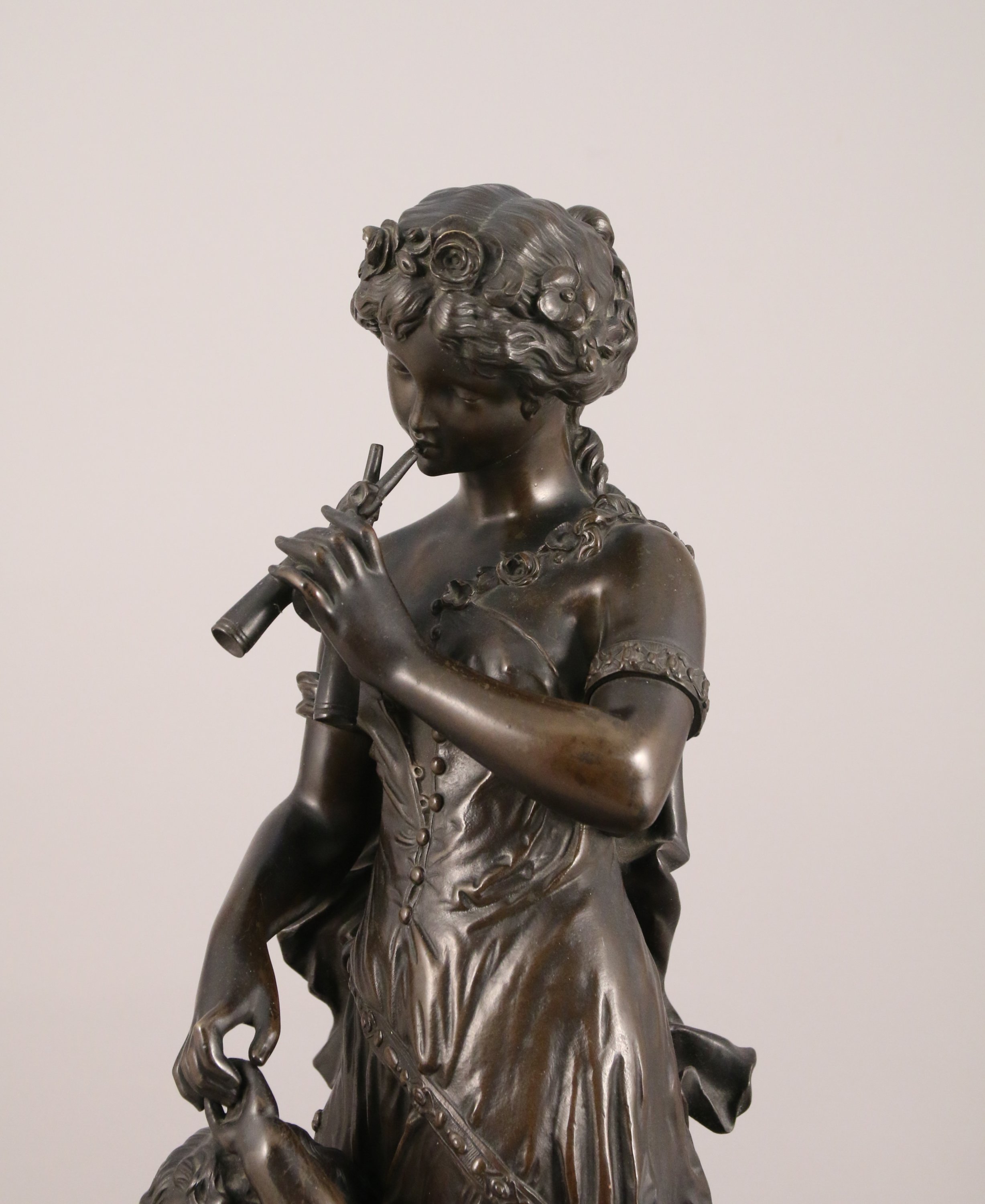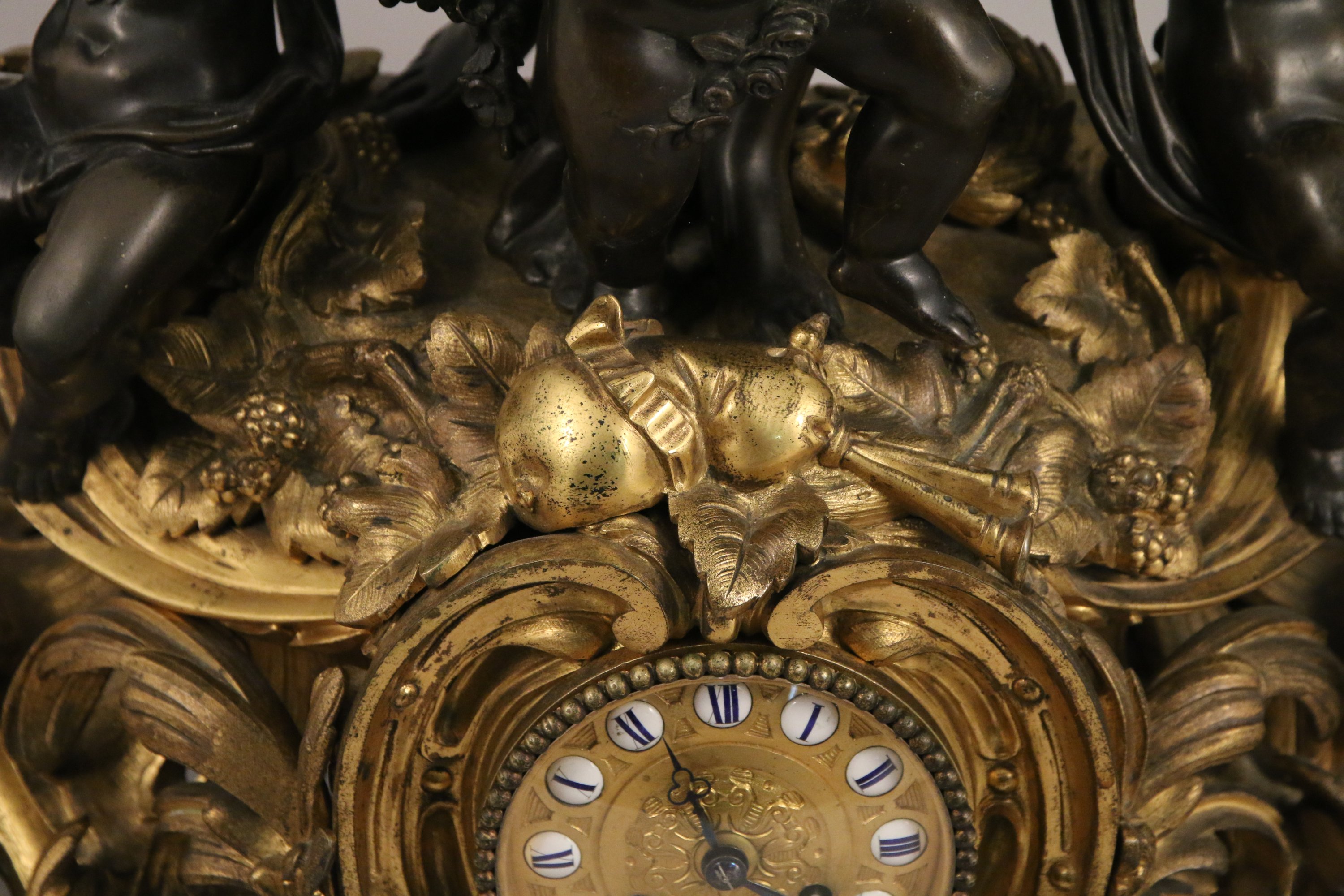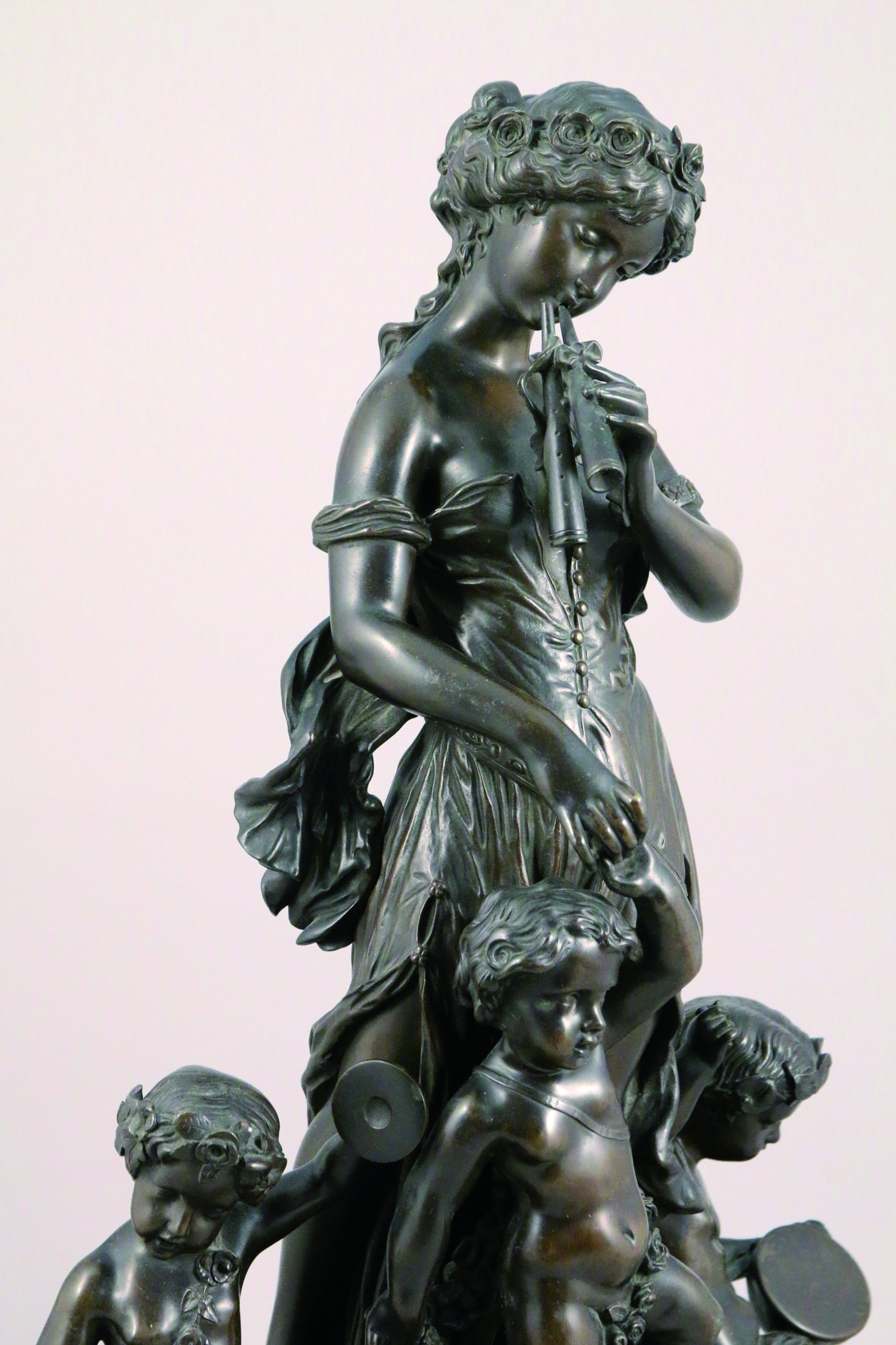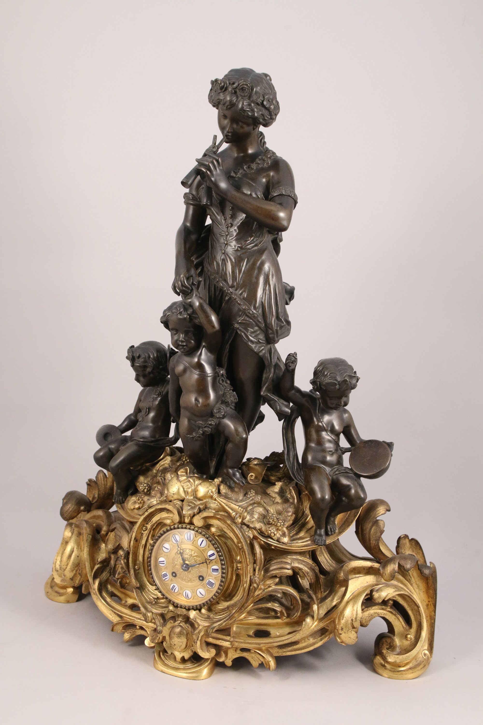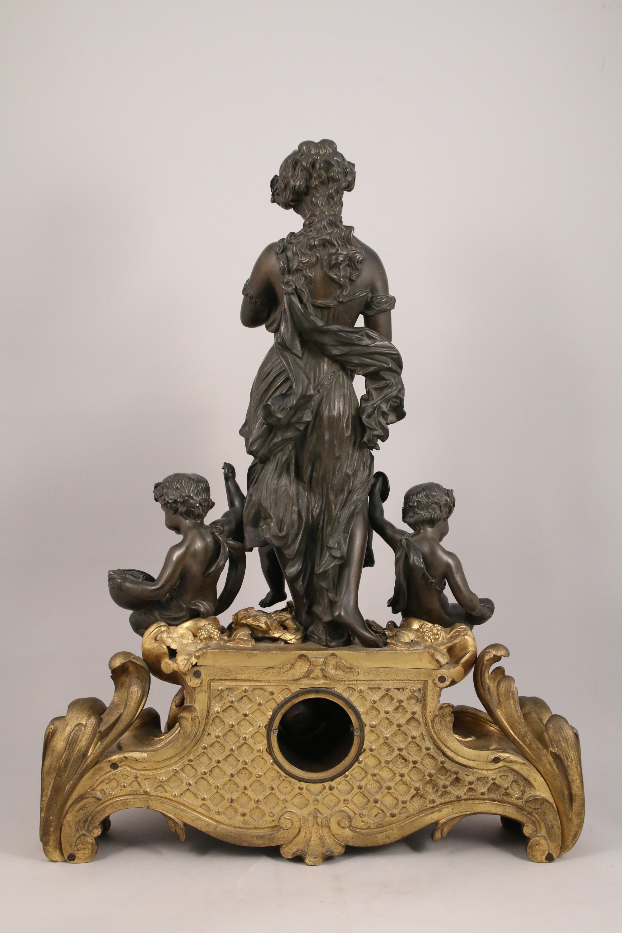 ornée d'un groupe en bronze ciselé et patiné figurant une joueuse d'aulos tenant par la main un putto à la guirlande fleurie, flanqués de deux putti musiciens aux cymbales et au tambourin. Ces sculptures en ronde-bosse reposent sur un socle en bronze doré richement sculpté et ajouré d'enroulements rocailles. Son décor d'instruments de musique, de baies et de guirlande répond à la l'iconographie de ses sujets.